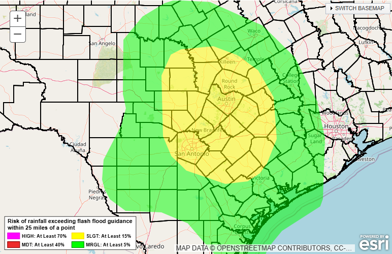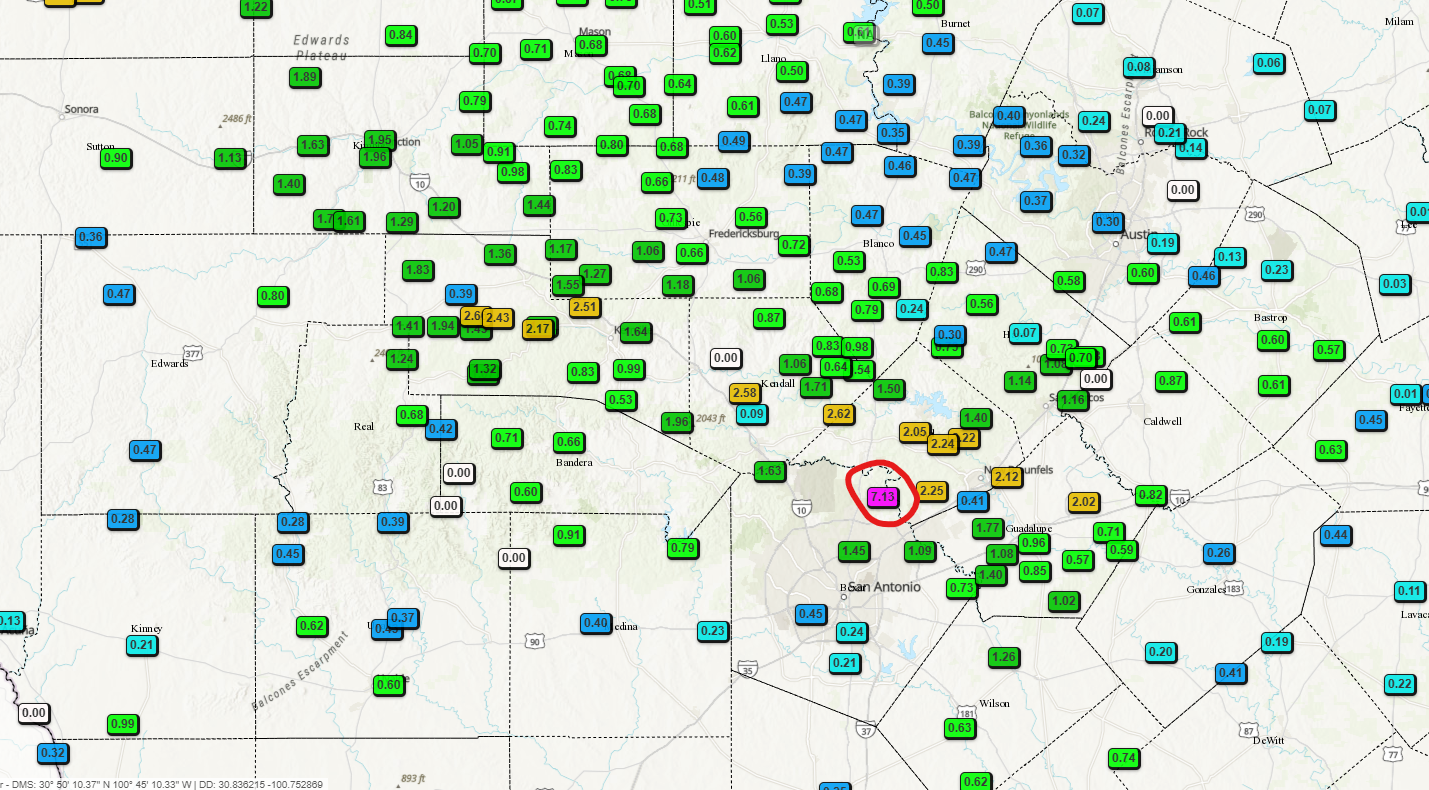 Wow…some hefty rainfall totals have been recorded over the past 24hrs, especially along the Bexar-Comal county line where over 7 inches has fallen. A mesoscale discussion was just issued for counties in and around Bexar county for this afternoon for the chance for 1.5 to 2 inch rainfall totals per hour. The graphic is below. An approaching disturbance in Mexico is tracking east and will continue lighting up the radar over the next 24hrs. This from the NWS: “An upper-level shortwave trough to the west is currently moving across northern Mexico and will serve as a trigger for some deep convective activity beginning in the late afternoon and continuing overnight, starting around the Rio Grande and then along the southern edge of the Balcones Escarpment or US-90 corridor west of San Antonio before continuing east to the I-35 corridor and Coastal Plains overnight.”