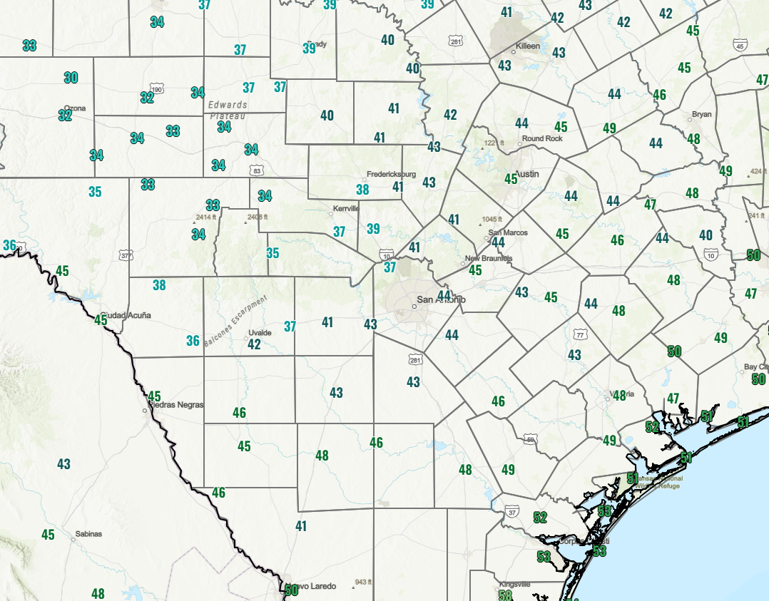 We saw quite a few lows this morning in the 30's and we will see even more tomorrow morning as dry cool air settles in behind yesterday's cold front. If you flirted with freezing in the low spots in the Hill Country last night, you might see a real one tonight! For most of our area, look for 30's and 40's for lows. Tuesday morning's lows will be mainly in the 40's before we start warming up quickly into the 80's for highs on Tuesday and Wednesday, then 90's for Thursday and Friday, ahead of our next dry front.