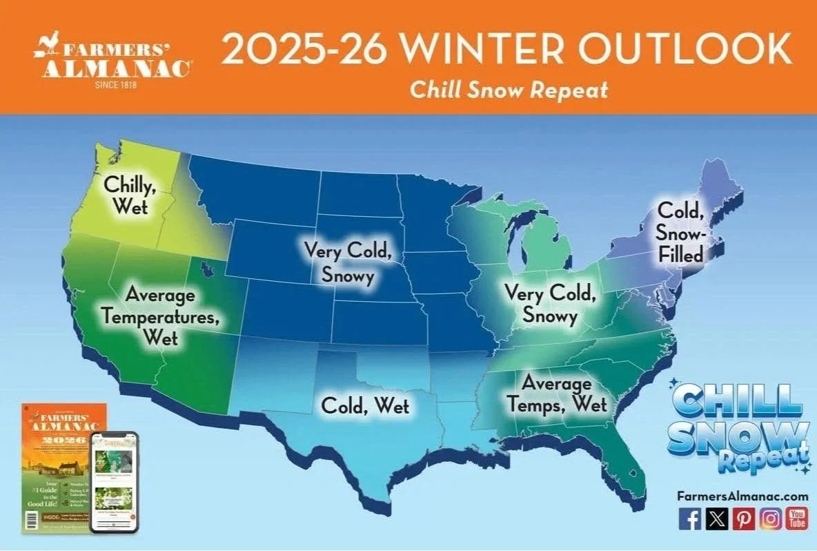 Yesterday the Climate Prediction Center released their forecast for September and seasonal outlooks for this fall and winter and today we saw our weekly drought update and drought forecast. While none of the data makes you feel optimistic that our lingering drought will end anytime soon, the forecasts are only slightly leaning towards warmer than average temps and below normal precipitation. I’ve also included the latest ENSO forecast which calls for neutral conditions, followed by a weak La Nina for this winter. In all cases, you can break out your coin and toss it for making a prediction that will likely be as accurate as the forecasts we are seeing right now. While not considered very scientific, the Farmer’s Almanac forecast, is predicting a cold and wet winter for us! I have included their graphic as well!