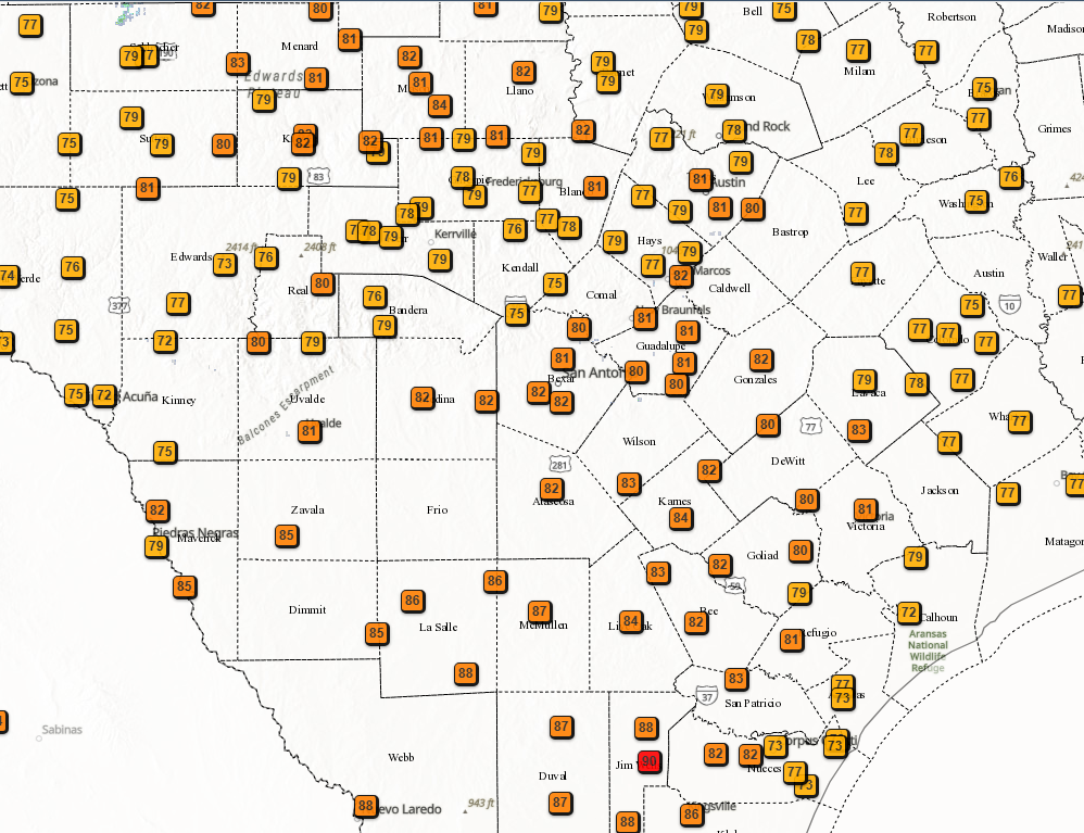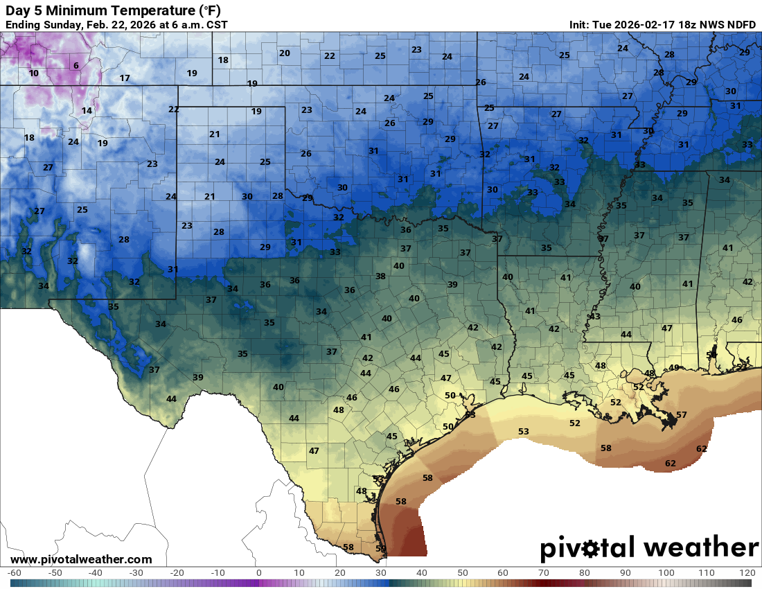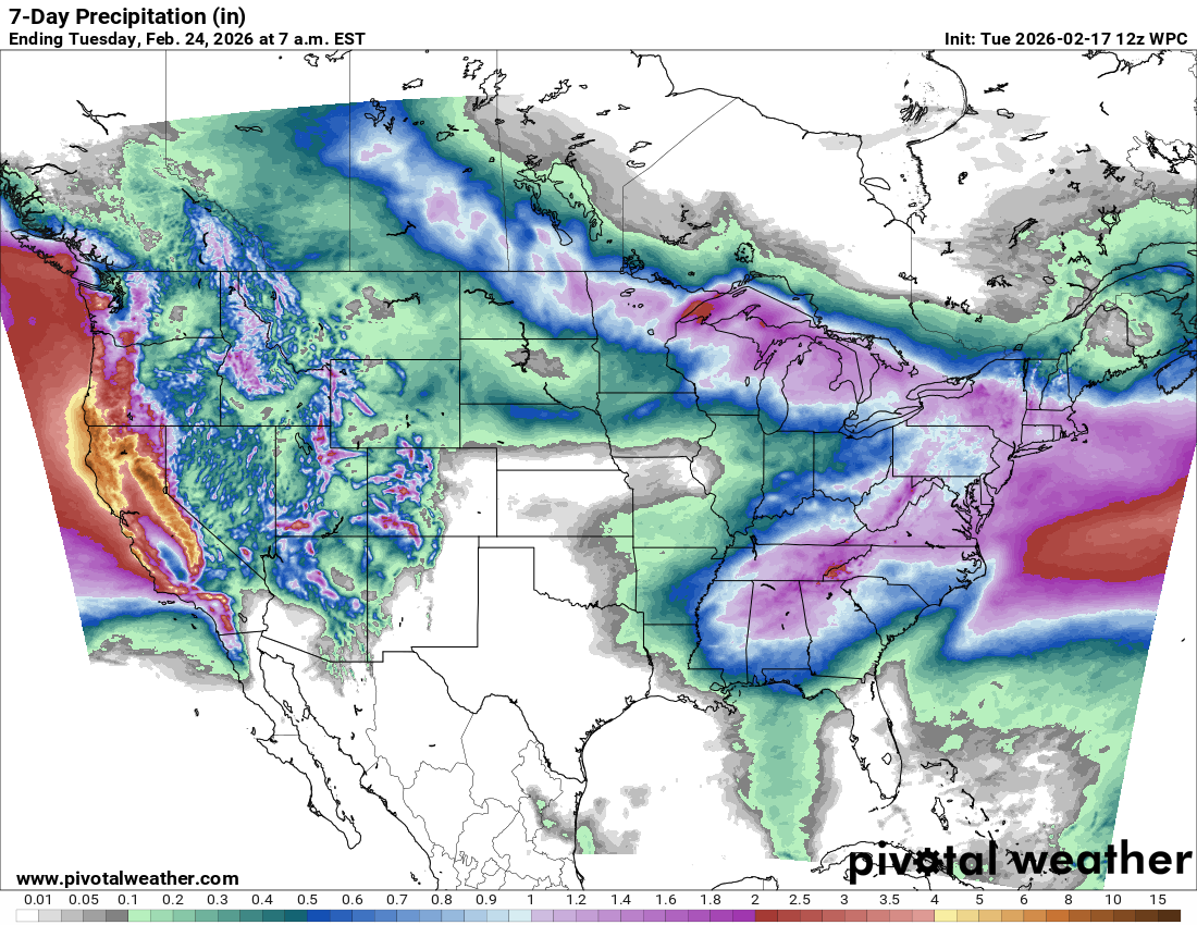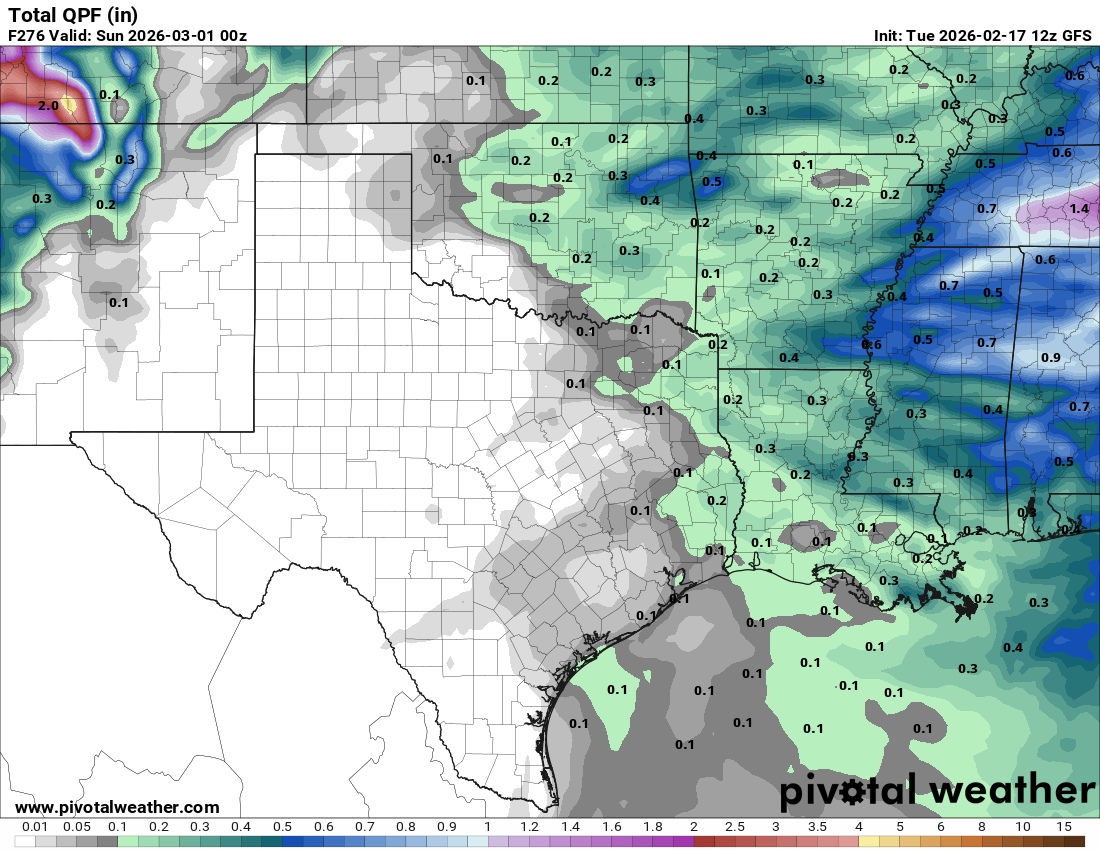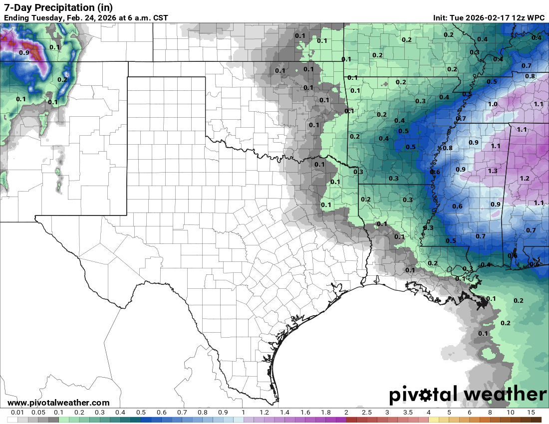 Yet another warm February day with temperatures already in the upper 70’s and 80’s at 2pm…and 90 degrees in Alice! We will continue to be 10-20 degrees above normal all week until a seasonal front arrives on early Saturday, knocking our lows down into the 40’s (normal for mid February) and highs in the 60’s for Sunday and Monday. As seen in the latest 7day rainfall forecast in the graphics below, the ridge of high pressure continues to evaporate any rain chances possibly through the rest of the month!