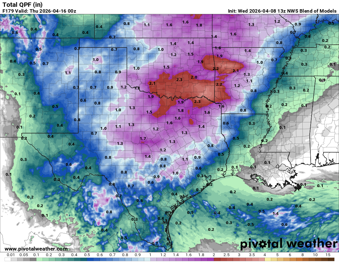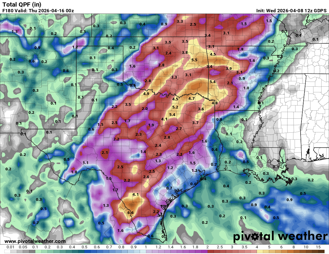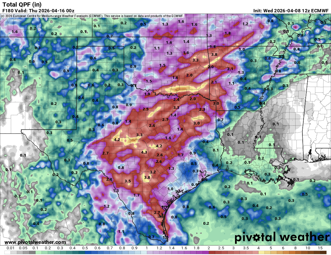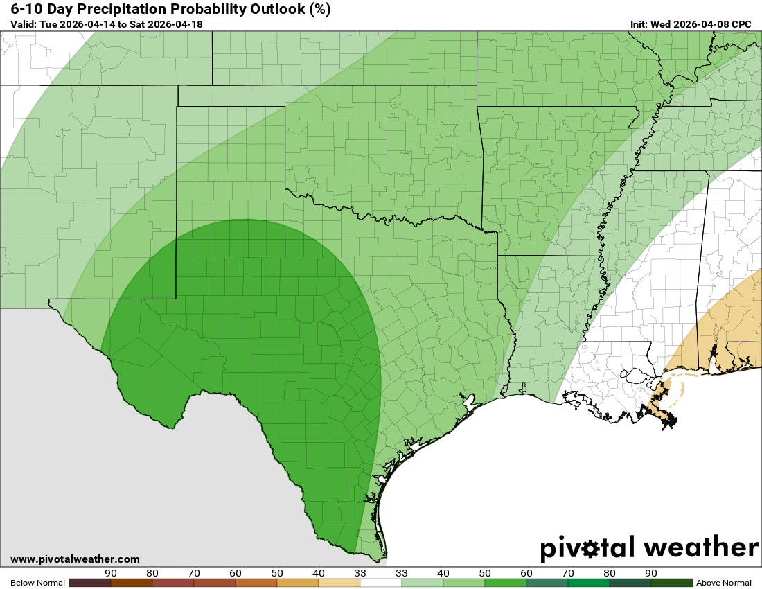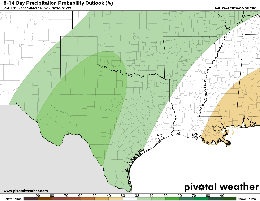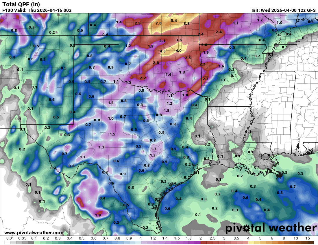 A combination of a trough to our west, and disturbances moving through Texas, will give us daily rain chances for the next week and possibly longer. The best odds for rain for south Texas will be from Thursday-Saturday, then the rains shift to the north, giving south-central Texas their best chances from Saturday-Tuesday. While there will be a chance for severe storms during the next 7 days, the greatest threat will come on Saturday afternoon, (NW counties) and Sunday, (Hill Country and Austin). As is the case for most of the year for us, this will be a convective system, so storms will be scattered throughout the period. I would not pay too much attention to specific rainfall totals on the model forecasts…just be happy that we will all have a chance for rain for an entire week!