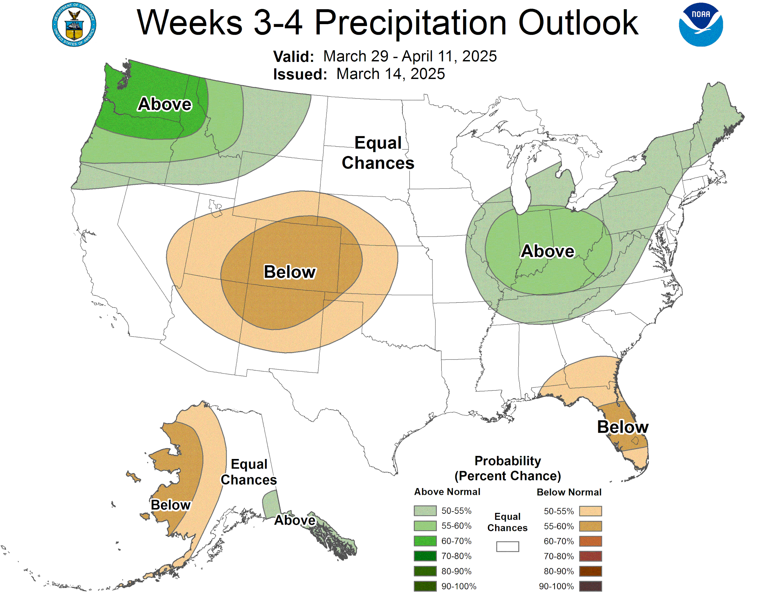 The latest CPC 3-4week forecast has us in the 50/50 odds for above or below normal rainfall.