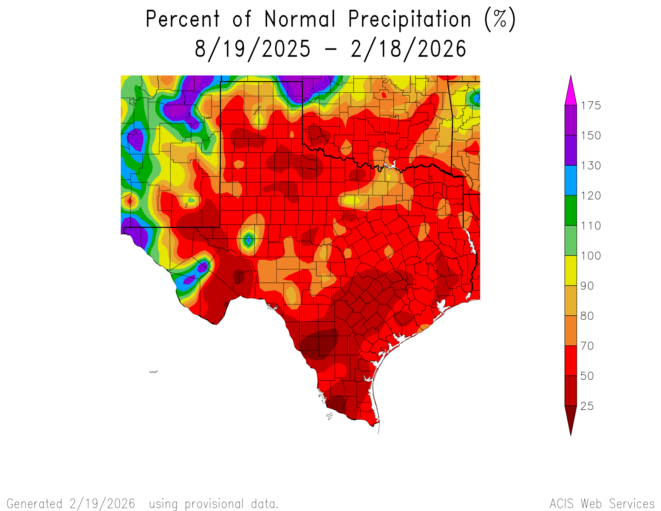 Despite some rain that fell around San Antonio and the Hill Country last week, our latest drought update looks just as orange and red as last week. As you will see in the graphics below, except for two small areas in the Hill Country, most of us have only seen 25% or less than average rainfall so far this year. Even worse is the fact that our entire region has recorded the same terrible percentage of below normal rainfall over the past six months.