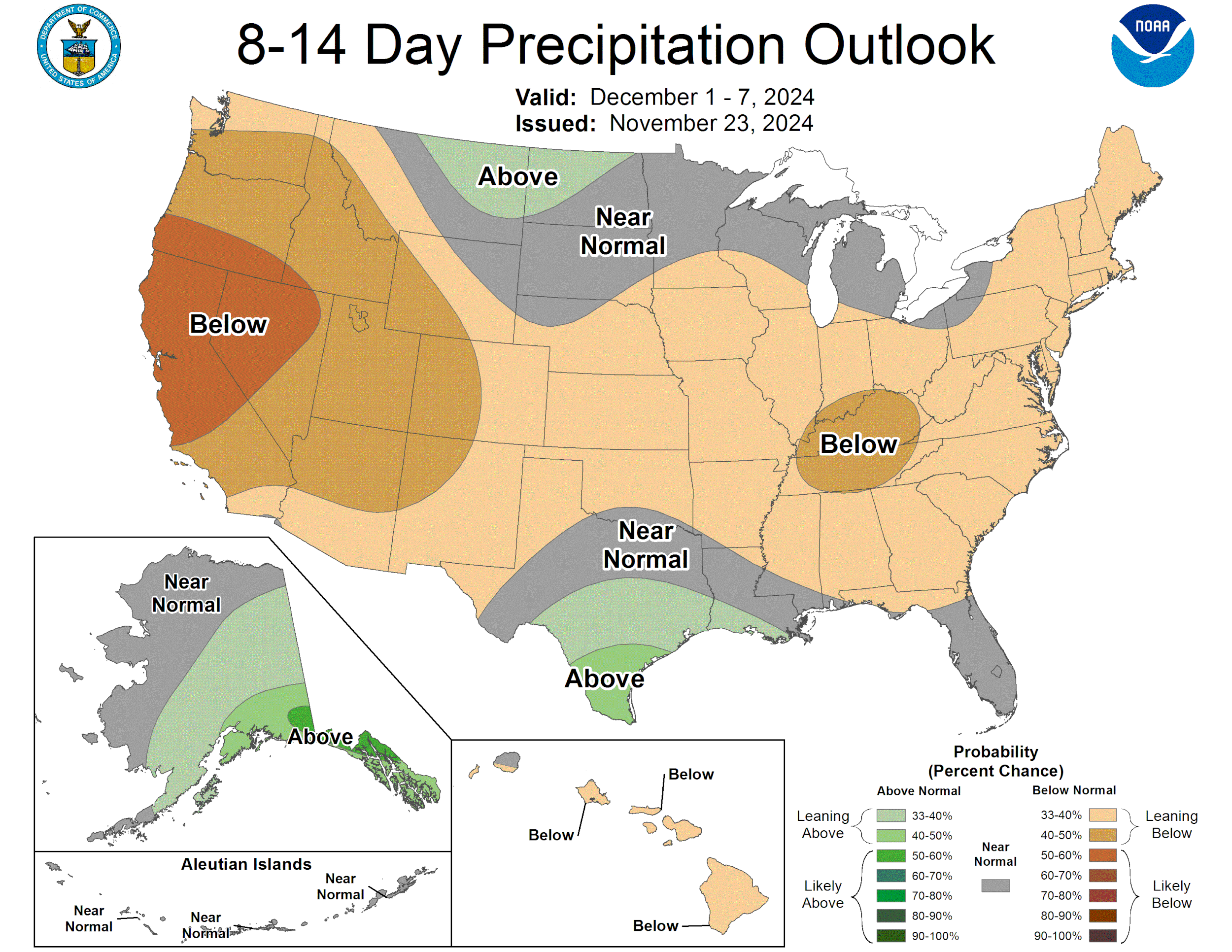 More cold air will arrive the weekend after Thanksgiving, along with our next chance for rain. The models are still mixed on the rain odds, but it is nice to see that the CPC 8-14 day outlook is forecasting better than even odds for above normal precipitation!