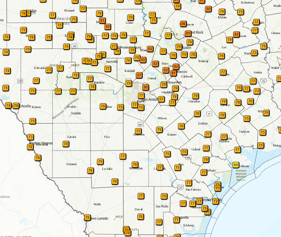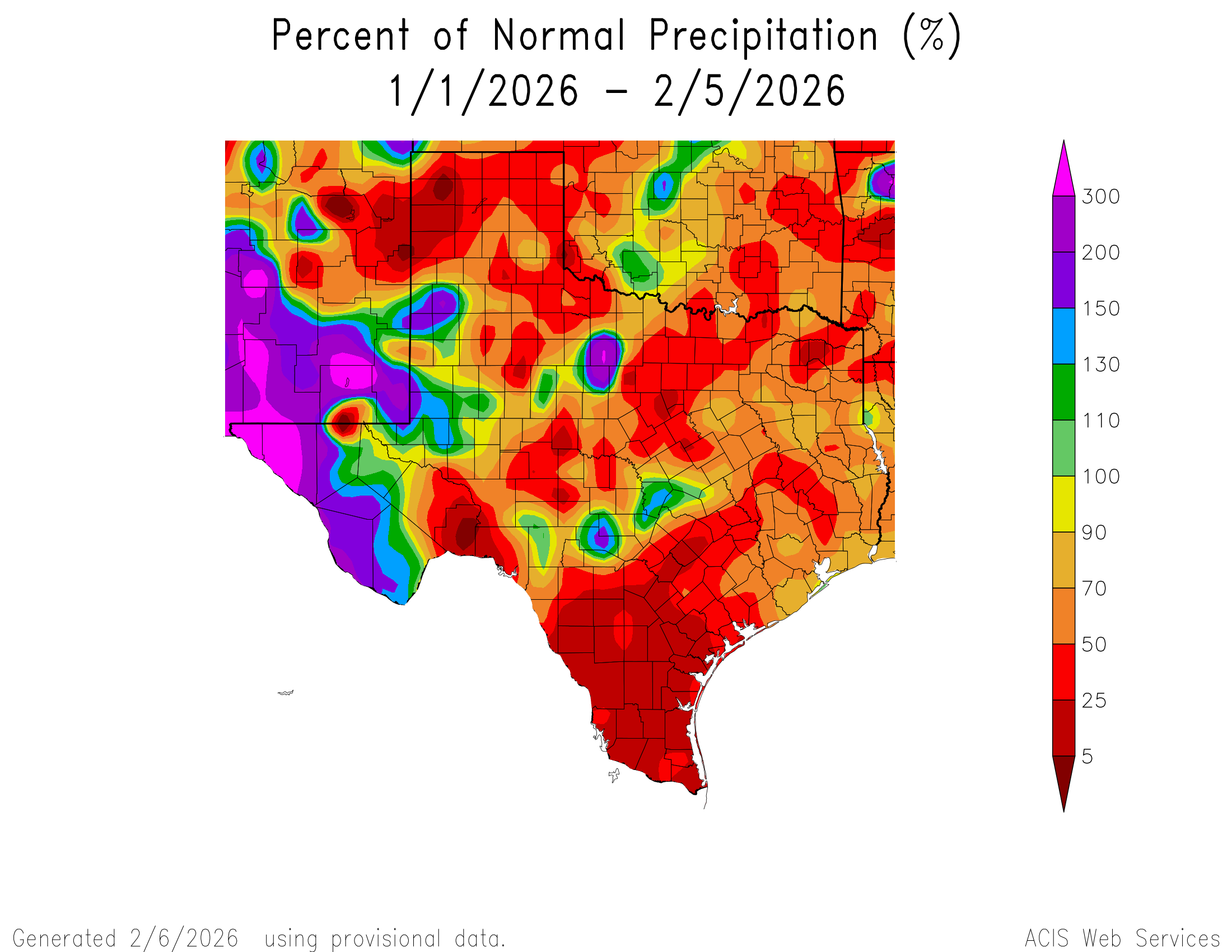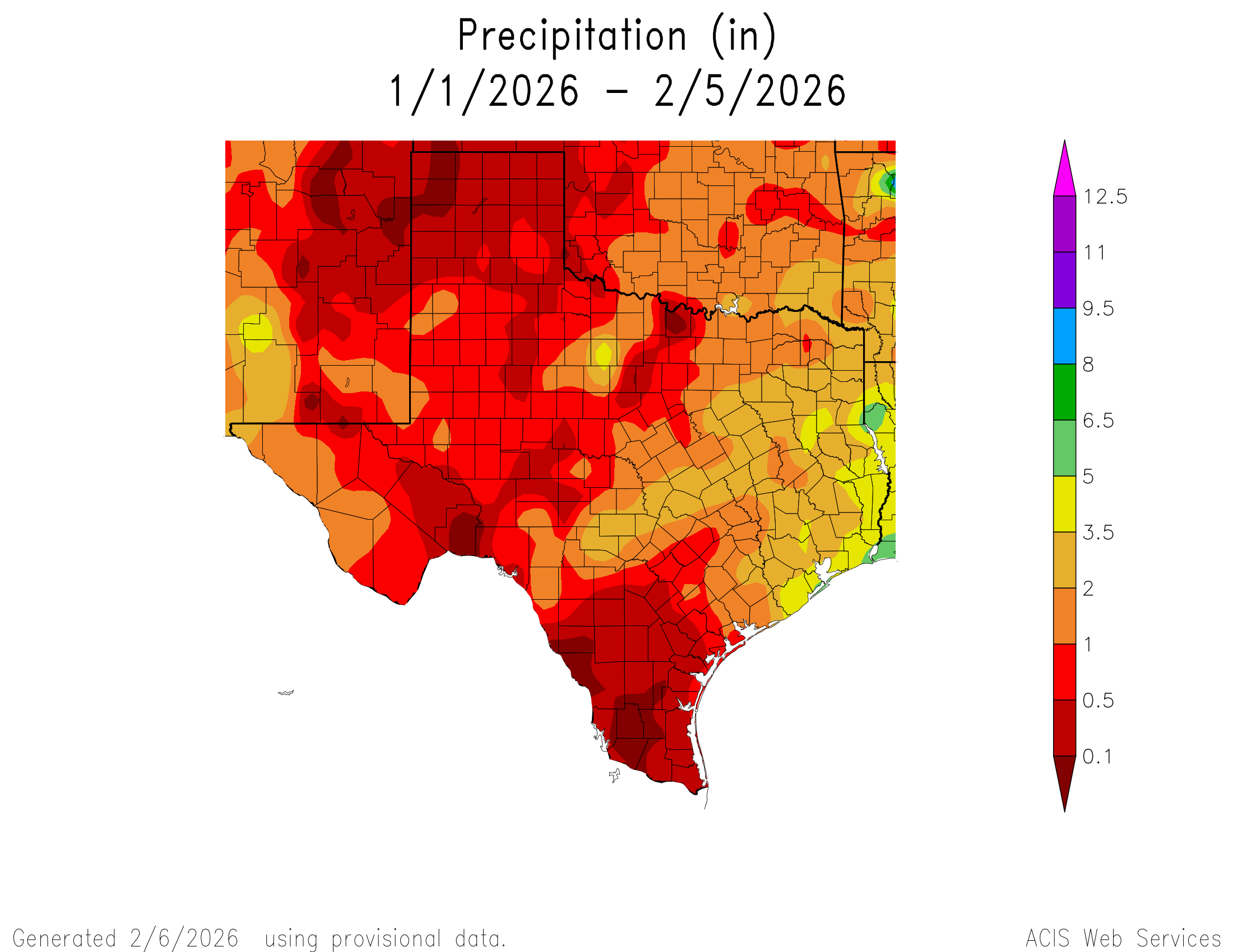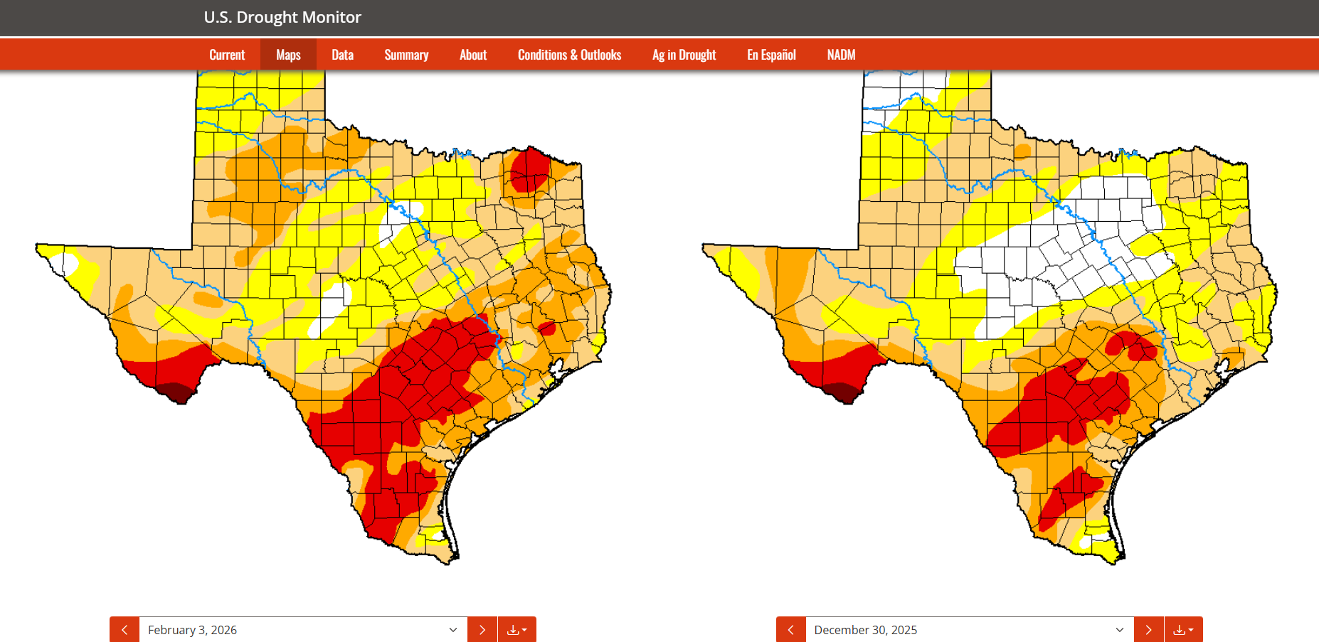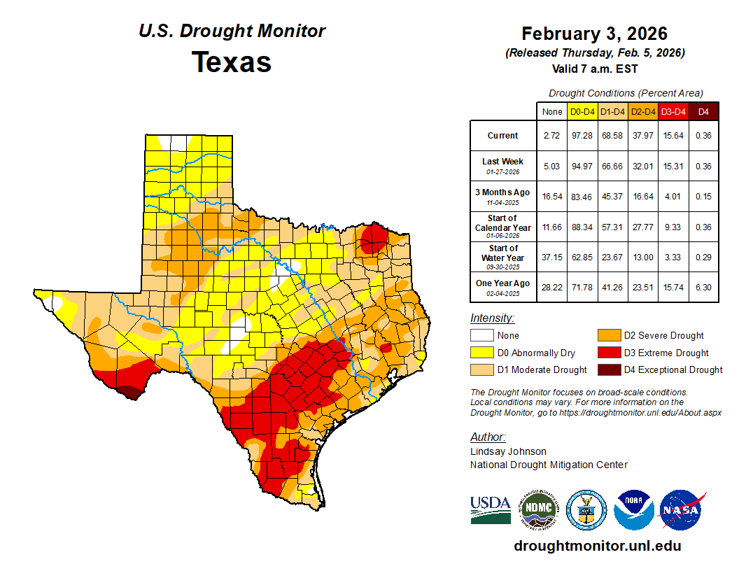 Oh boy…it’s time to depress everyone with the latest drought and rainfall update! A continued lack of any major rainfall (except for a few lucky locations in the Hill Country) so far this year has increased our areal coverage of the dreaded extreme red zone on the map. Even worse, many of these locations are where ranches and farms are located. As a side note, we are not alone in our misery, with a good percentage of the USA in some sort of drought right now. Where I live, in SW Colorado, we should have 3-5 feet of snow on the ground and as of today, we have next to zero.