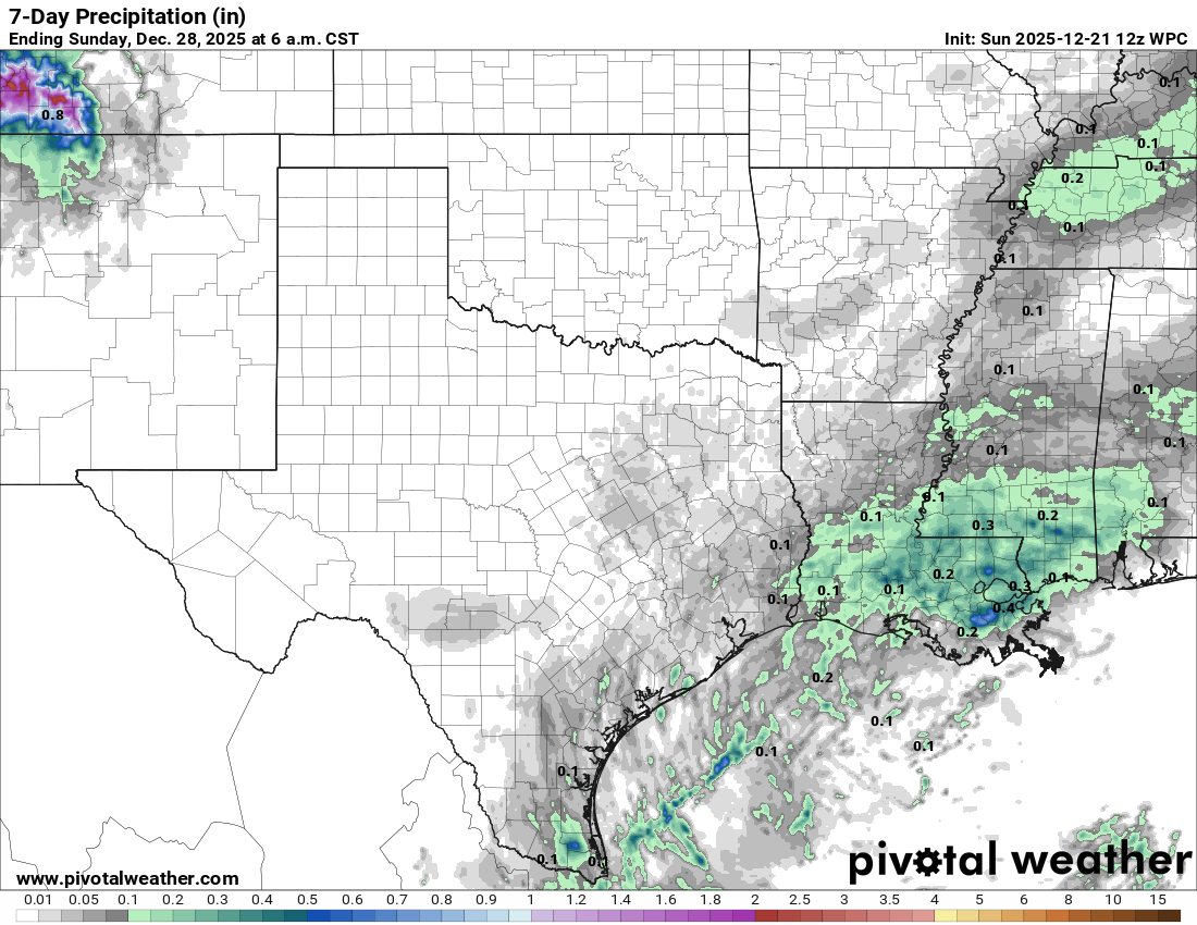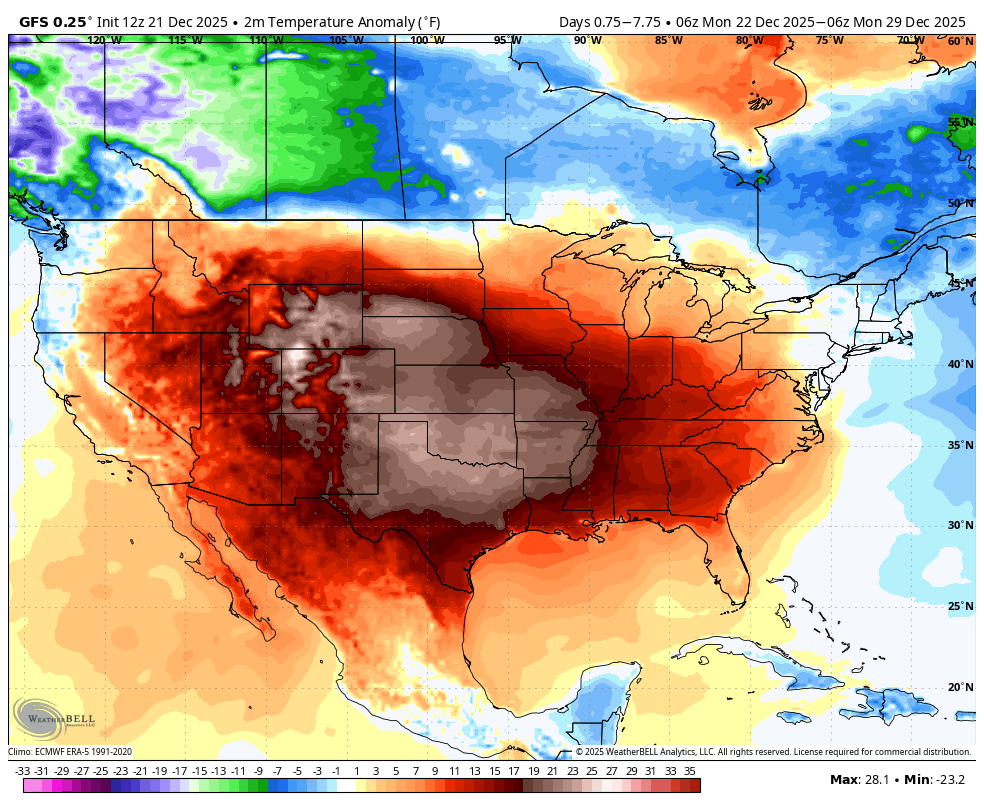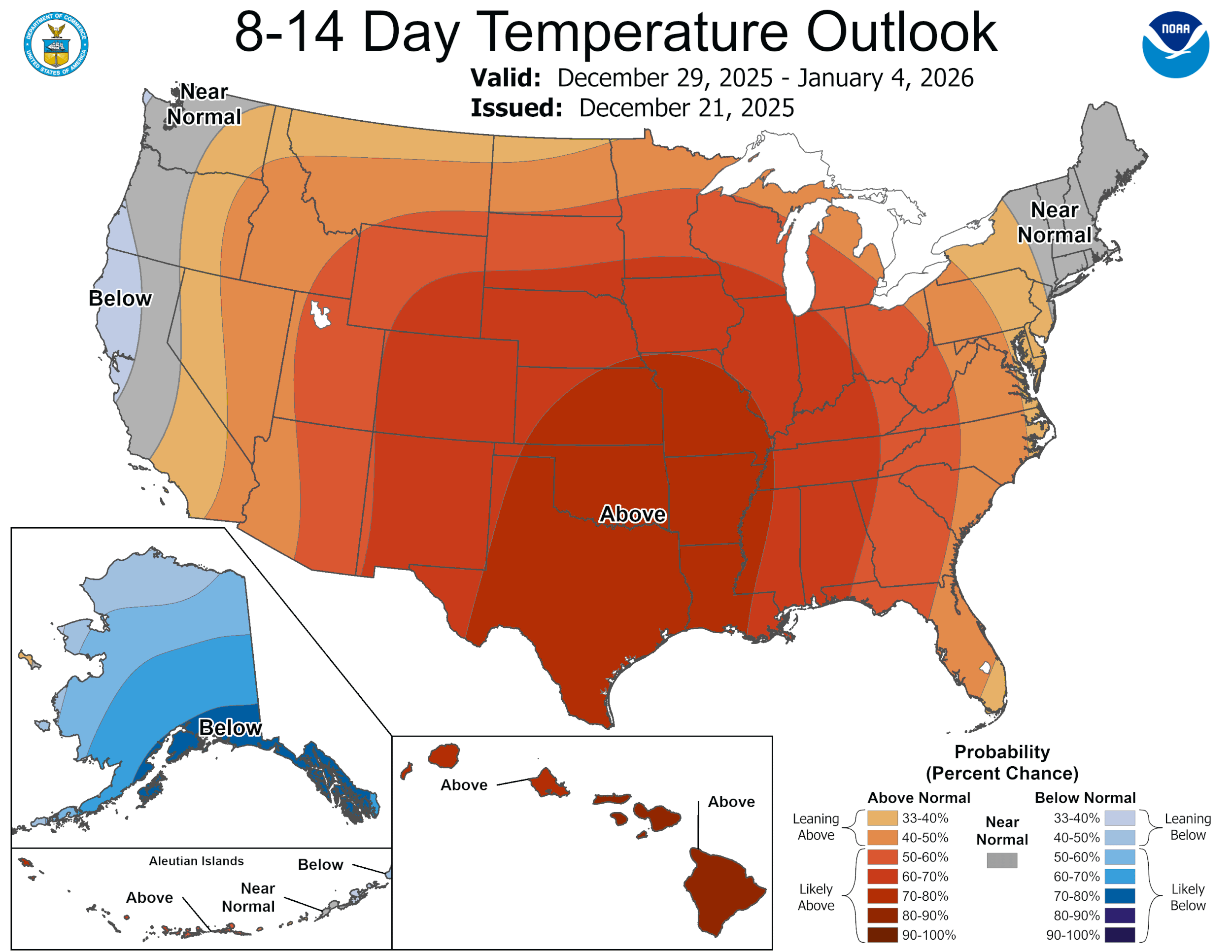 Happy Winter Solstice! Unfortunately, winter did not get the memo for this week as temperatures will continue to be 10-20 degrees above seasonal averages, not just for us, but for most of the country. Below is a graphic showing how many people will be experiencing above normal temperatures. As for rainfall, chances go up a little towards the last few days of the month and the first days of January, but no major rainmaker in sight as of today.