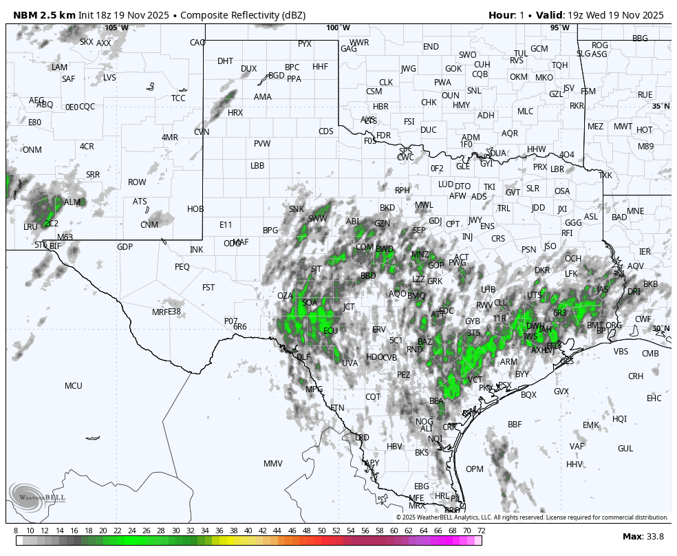 I’ve included a lot of info on this system, including the latest radar forecast from the NBM model to give you an idea of how this all will set up. The good news is that there will be a second cool front and disturbance moving through on Sunday-Monday. While south Texas won’t see the rain that south-central Texas will, the latest models suggest many of you could see 1/2-1 inch of rain before Monday. Since there could be severe storms over the next 24hrs, make sure your NOAA weather radio and emergency apps are turned on for local warnings!