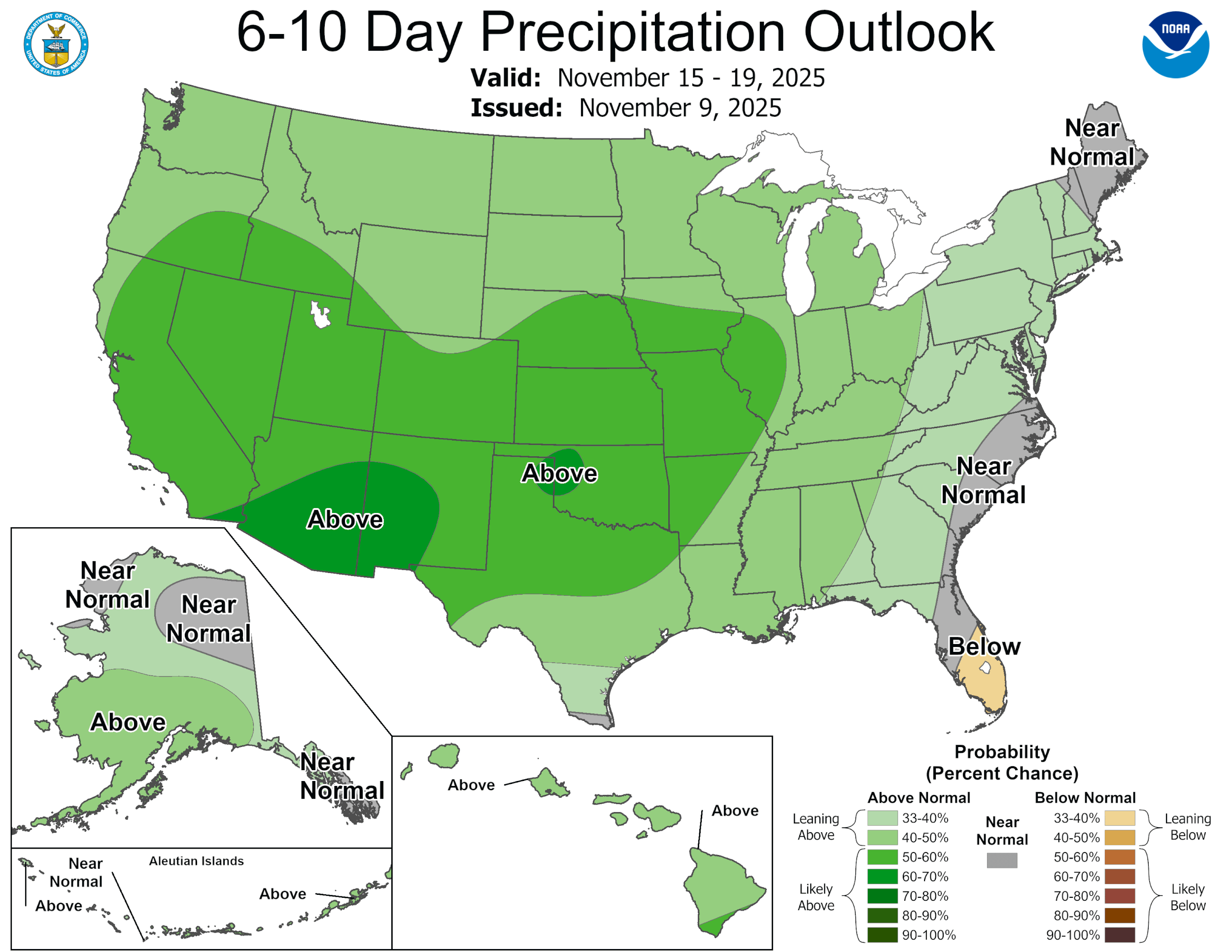 Another chance for freezing temps on Tuesday morning, then we start heating back up to the 80’s for highs and 60’s for lows by the end of the week. Our next front arrives late in the weekend, then a possible pattern change towards wetter weather. The latest 6-12 and 8-14 day CPC outlooks are giving us better than even odds for above normal precipitation during that period!