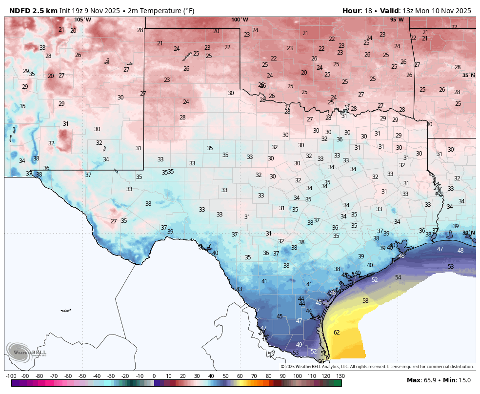 After some record highs over the past couple of days, winds gusting to 30-40mph today (A Red Flag Warning continues in effect until 9pm.), why not a possible freeze for tomorrow morning for the Hill Country? Once the winds finally settle down, look for temperatures to drop quickly with dew points currently running in the 20’s. While the Hill Country is the only part of our area that is in a freeze warning, if you live in a low lying rural valley, I’d bring in our cover any tender vegetation over the next two nights. I’ve seen early freezes in rural south Texas when they were not forecast have have one.