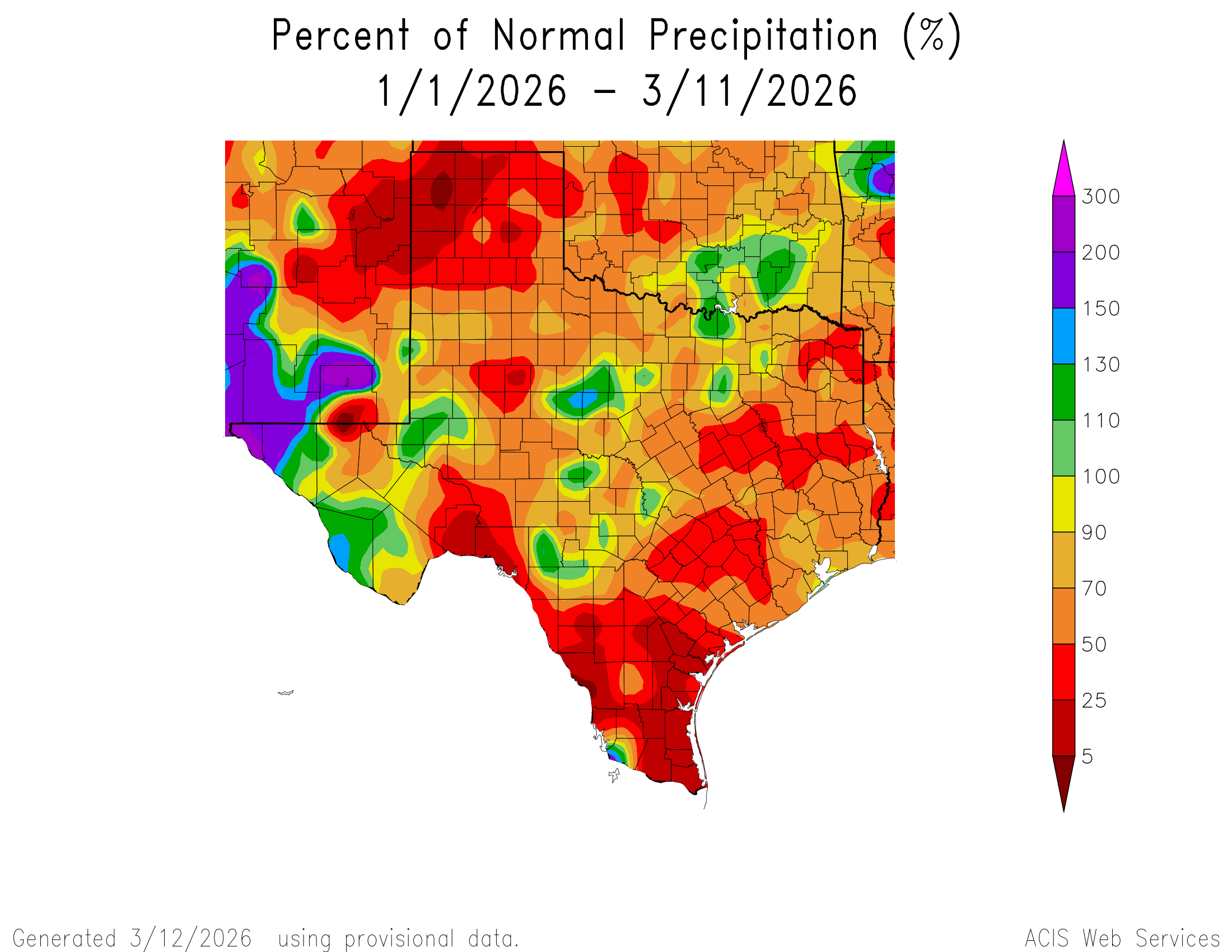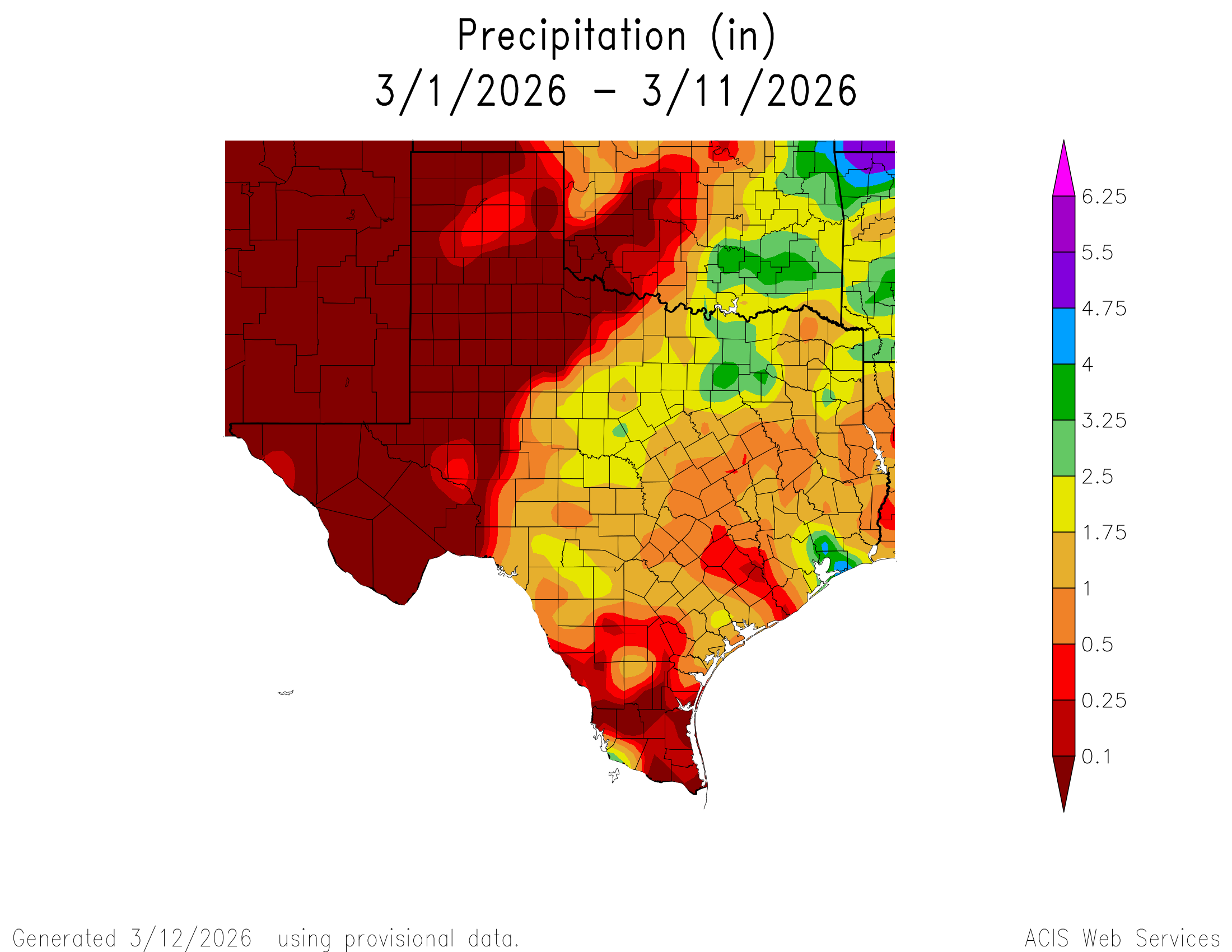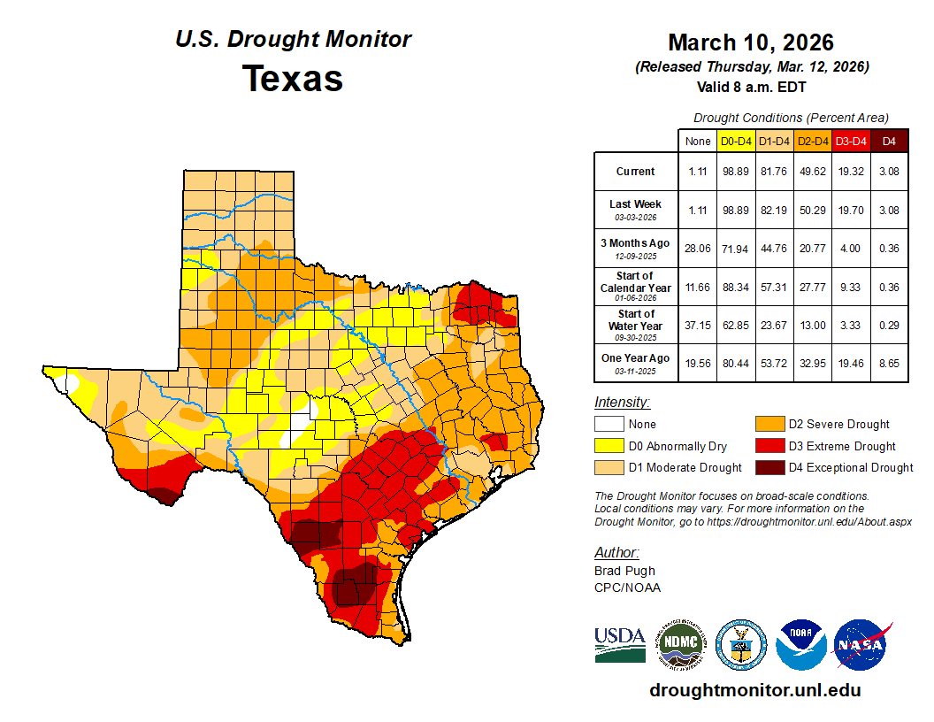 Below is the latest depressing drought update. About the only thing positive is that the drought has not expanded over the past 7 days and some locations along and north of HWY 90 have seen above normal rainfall for March so far. No rain in the forecast for the next 7 days and likely not for at least 10 more days.