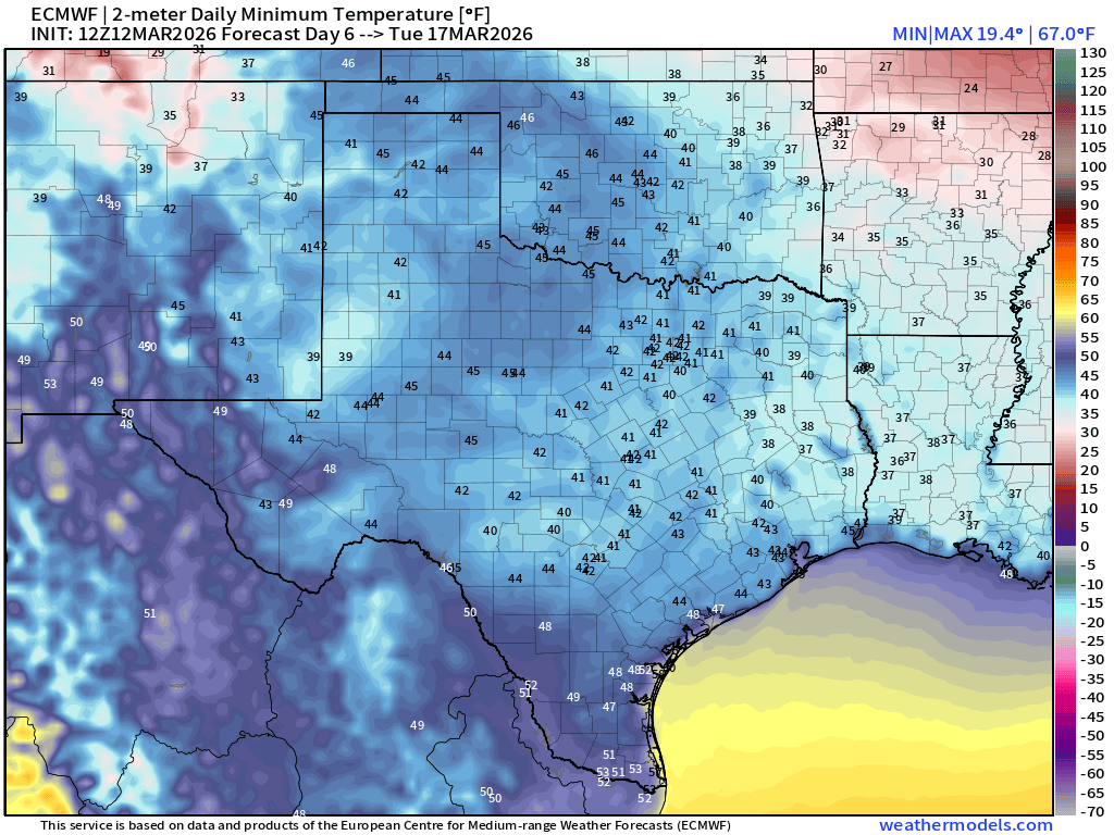 A very pleasant day out there with temperatures in the 60’s under fair skies. Look for lows in the 40’s again tonight before we start warming up into the 80’s and even 90’s over the weekend. On Sunday, many locations will hit the low to mid 90’s as desert winds pour in from the SW ahead of a fairly strong dry cold front that will zoom through in the afternoon. I would not be surprised if a Red Flag Warning is issued for Sunday. The strong front will drive down our lows into the 30’s and 40’s on Monday and Tuesday morning and reduce our high temps to the 60’s and 70’s. For those of you in the Hill Country, there is a chance for a light freeze on Monday and Tuesday morning…I’ll have more updates on the lows expected as we get closer to next week.