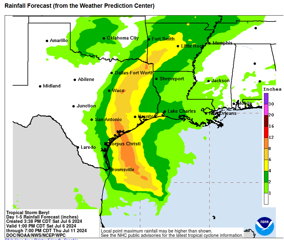 Although a bit on the trite side, all eyes on the Gulf where Tropical Storm Beryl is getting its act back together after being slapped around by the Yucatan and some wind shear. The latest update shows that Beryl’s sustained winds have grown to 60 mph this afternoon and it is forecast to turn back into a hurricane by tomorrow before moving onshore on Monday. The track has shifted even further east, moving the best rain odds along with it. Is it just me or does it seem like the models are often wrong for rain forecasts west of I-10, but rarely get it wrong east of I-10! For days, this looked like a no brainer, with Beryl forecast to move up the Rio Grande, then “poof”, all models moved it east and they continue to do so.