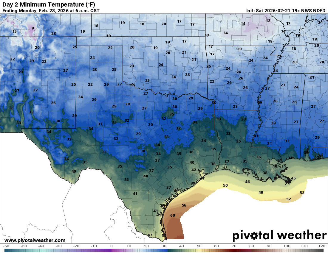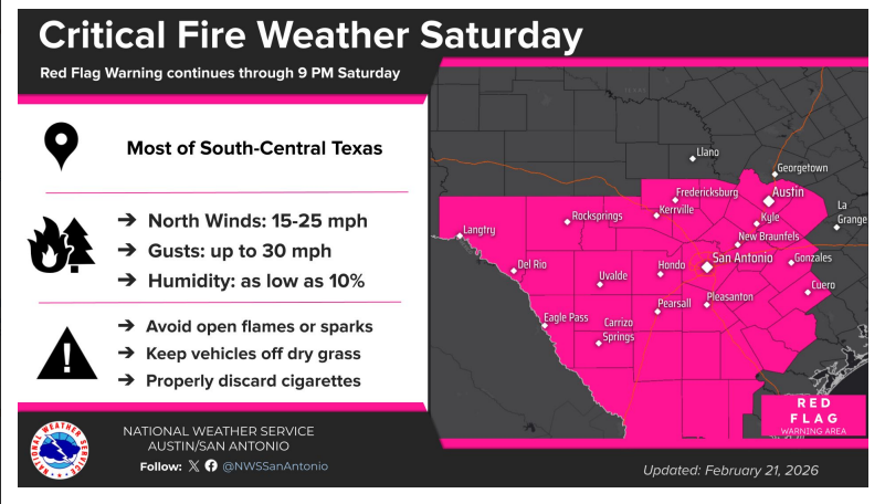 Our dry front arrived this morning as forecast and as our humidity lowers our winds have increased to nearly 30mph…no surprise that a Red Flag Warning is in effect until 9pm tonight. Cooler temperatures with lows in the upper 30’s and 40’s for the next couple of days and highs in the 60’s. We start warming up on Tuesday and by Wednesday and Thursday, we could see quite a few locations in south Texas going hitting 90 degrees or higher!