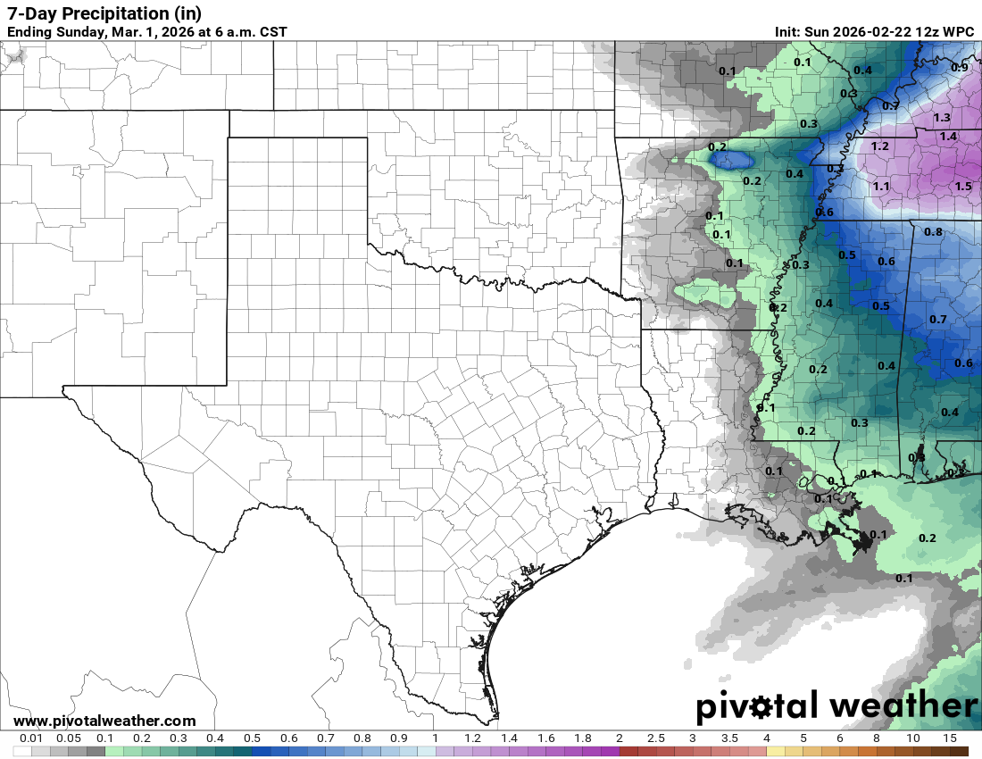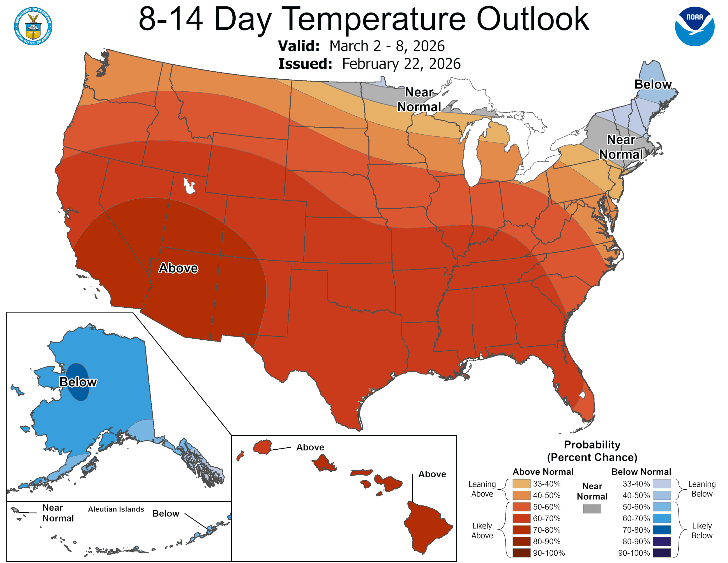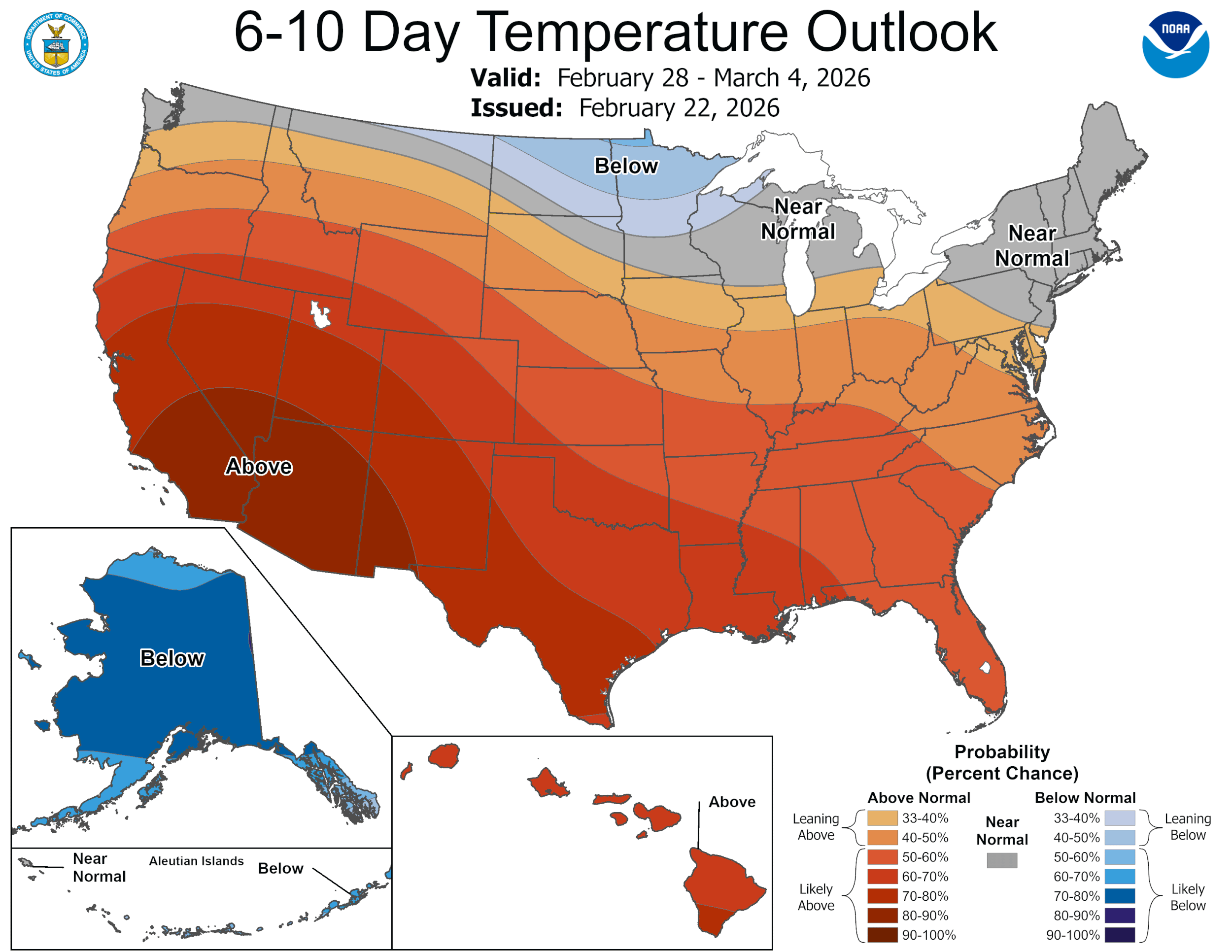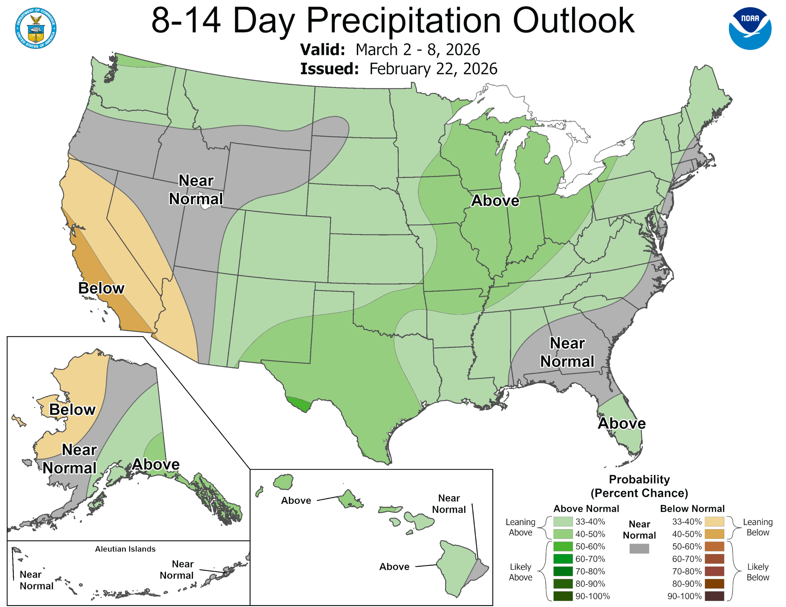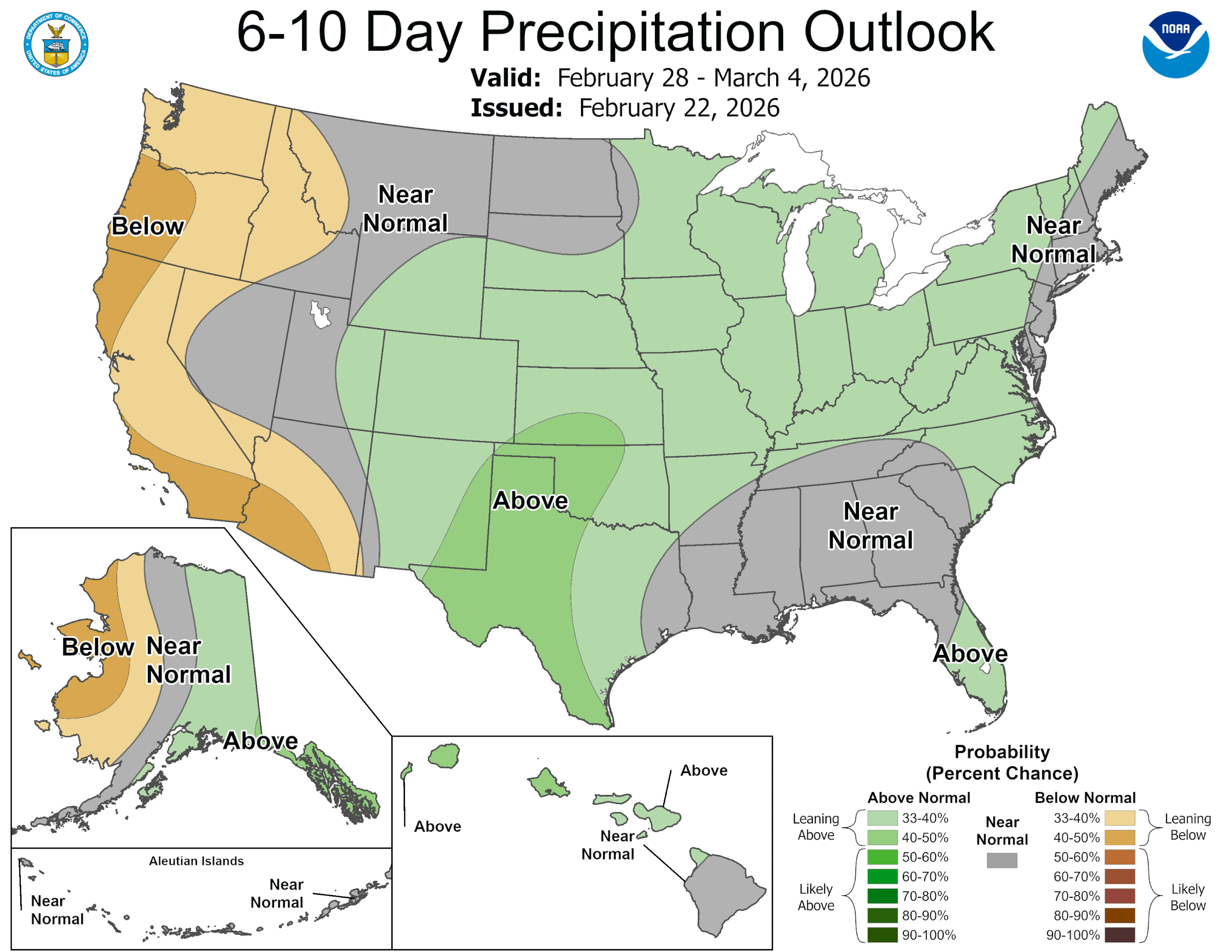 No surprise, rain is not expected for the next seven days. Beyond this week, the latest CPC outlooks are bullish for better than 50/50 odds for above normal precipitation in early March. The latest Euro run is forecasting a major rain event around the 8th, but as usual, let’s let another week go by before we get too excited.