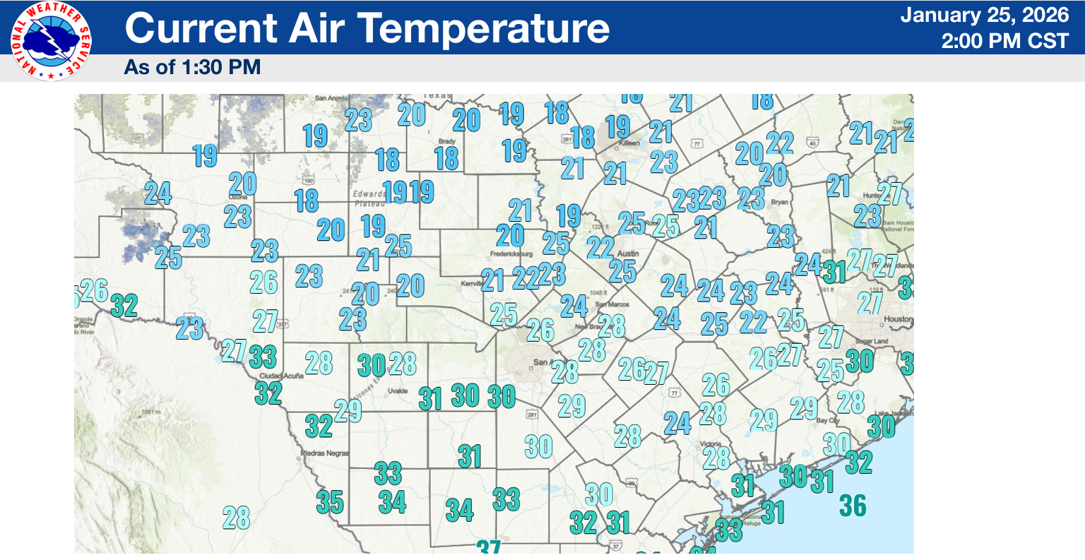 While there was a lot of ice with last night’s storm, most of the reports I have seen show sleet was the most common precipitation for most of south-central Texas. As we all know, sleet is a lot easier to deal with than ice! Now the biggest issue we all have to deal with is the extreme cold. Lows tomorrow morning will fall into the single digits and teens for most of south-central Texas and teens and twenties for south Texas. Quite a few of you in the Hill Country may not get above freezing until Tuesday afternoon!