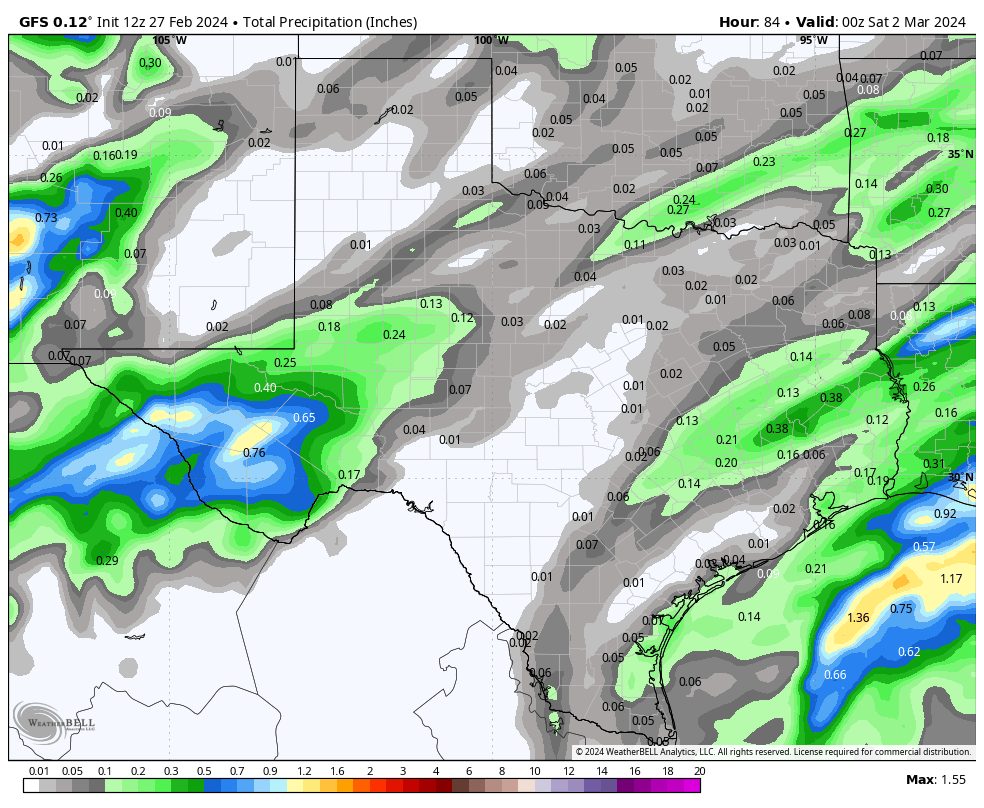 Another warm afternoon for south-central and south Texas with temperatures in the 80’s and even a few 90’s showing up. Look for a foggy night until a fast-moving front moves through tomorrow morning with a blast of winds that will gust to around 40mph for most locations. On Thursday, the clouds return and there is a tiny chance for precipitation, but if you get anything measurable, consider yourself lucky! Thursday will be cool and cloudy with highs only in the 50’s. By Friday, the sun returns and our highs bounce back into the 70’s, with 80’s returning by the weekend. Models are looking a bit more bullish for rain returning next week, but no sign of a major rain event anytime soon.