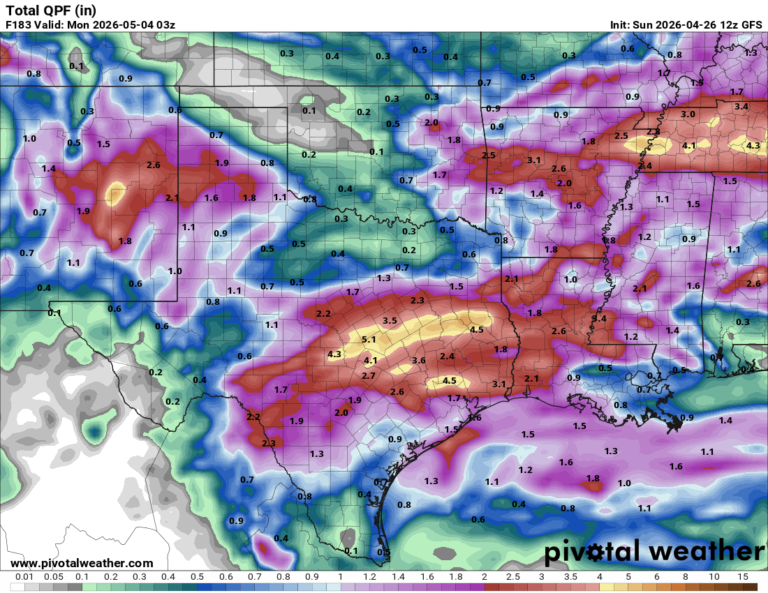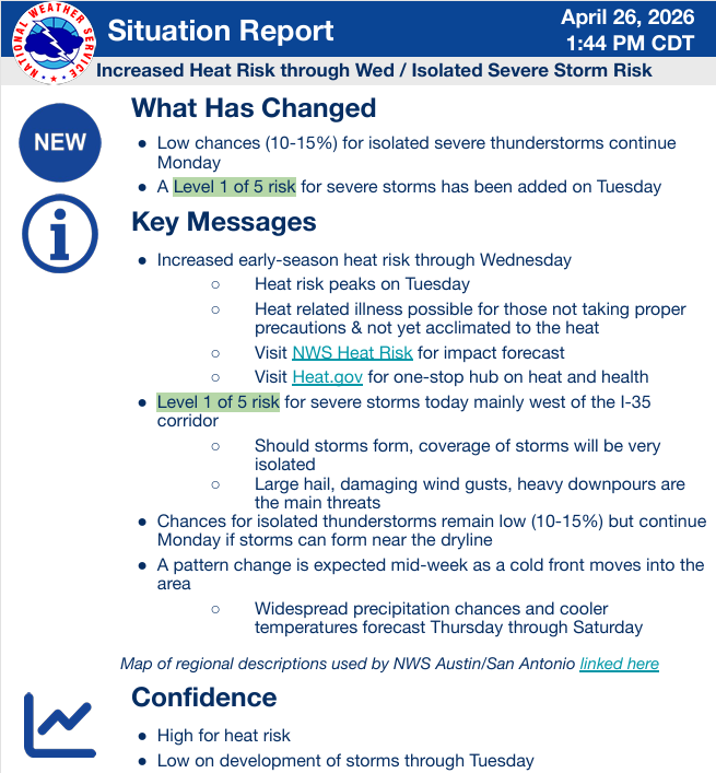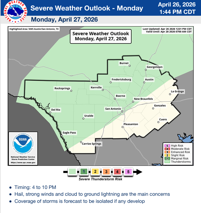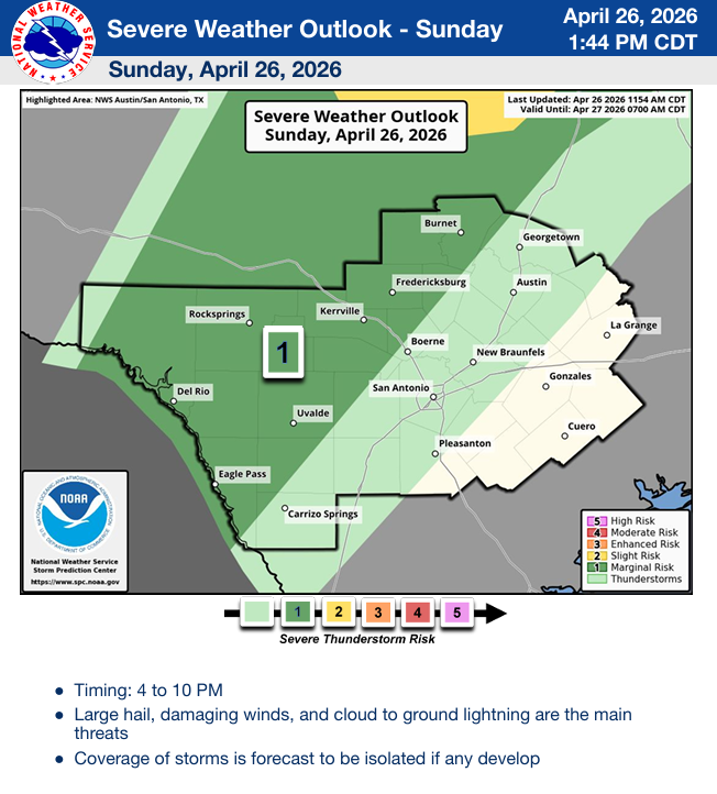 The NWS does a good job summing up our weather this week: “Hot conditions continue into Wednesday before we finally get some relief and a pattern change in the form of a cold front moving into our area from the north. This front looks to move into the area sometime in the afternoon or evening hours which may impact forecast temperatures this day. Additionally, this front brings widespread precipitation chances to the area which linger through Saturday as the front stalls late week somewhere in South Texas. Details with this late week system are still a bit uncertain but it does seem plausible that the potential for some strong to severe storms remains into Thursday along with locally heavy rainfall. Temperatures trend down late week with cool conditions in the 70s forecast over the weekend.”