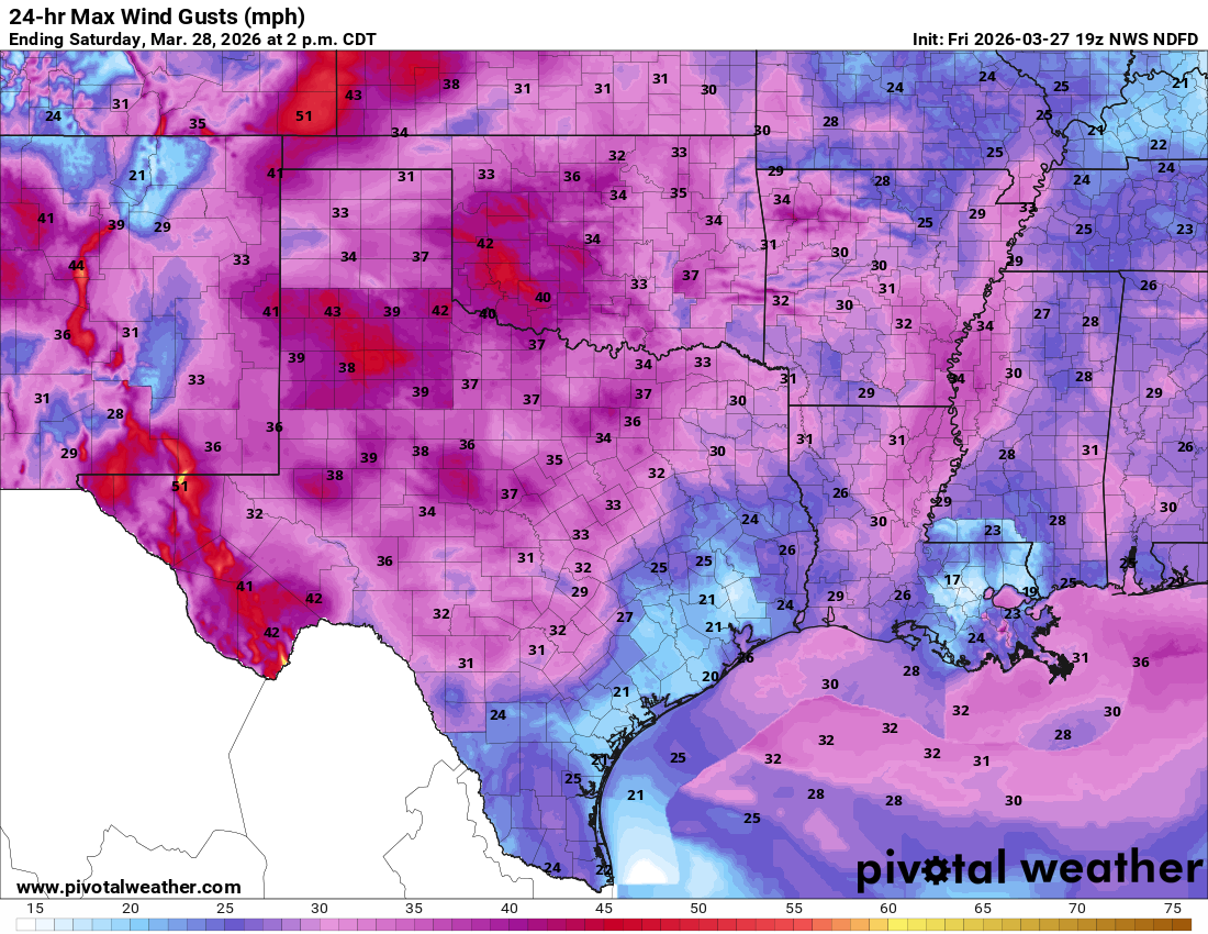 Forecast wind gusts for tonight and Saturday.