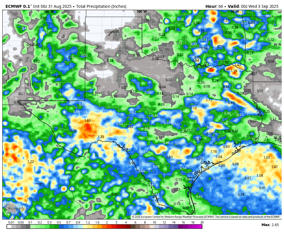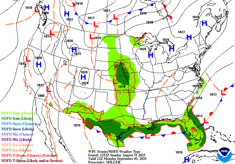 A Flood Watch is in effect from noon today through noon on Labor Day for almost all of south-central Texas. While your odds for rain are less in south Texas, there will still be scattered storms with pockets of heavy rain impacting your area as well over the next 48 hours.