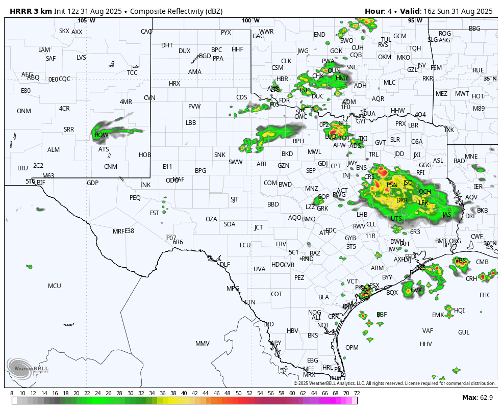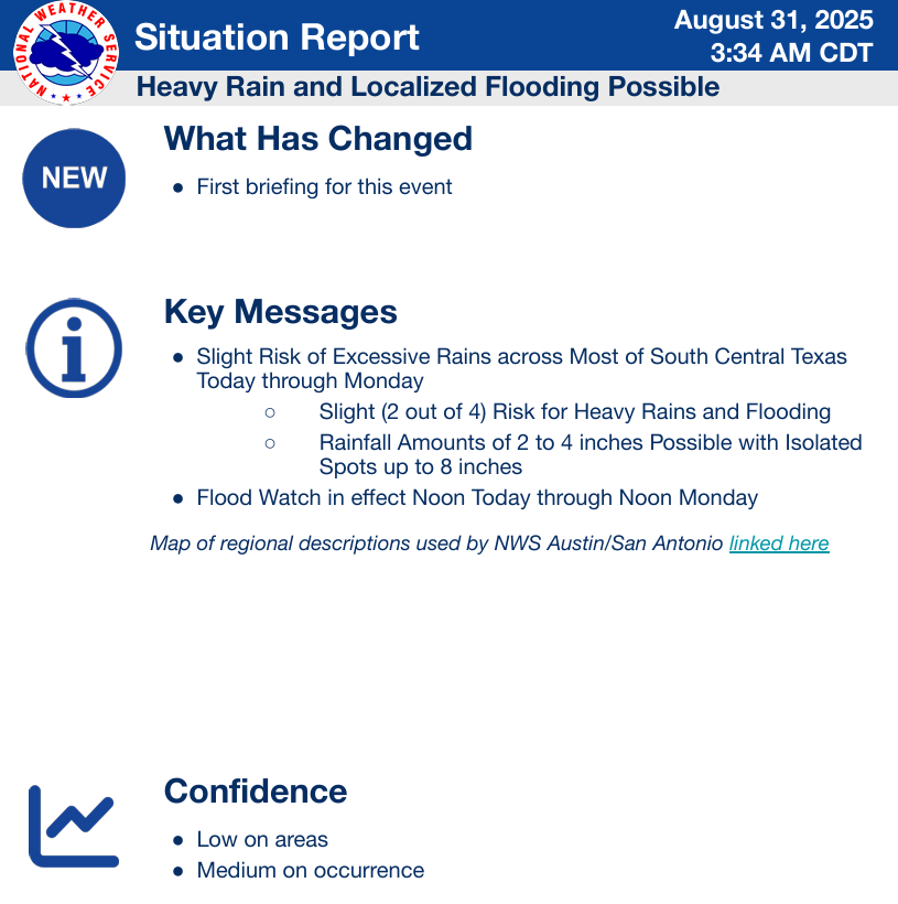 From the NWS: “By noon Sunday, the frontal boundary slowly begins to push to the south into the Hill Country. By that time precipitable water values are forecast to range from 1.7 to 1.9 inches across the Rio Grande/southern Edwards Plateau to over 2.2 inches over the Hill Country, I-35 corridor, and coastal plains. With this abundant tropical moisture in place, we are anticipating several rounds of heavy rain over most of south central Texas mainly Sunday afternoon into the evening and continuing through Monday morning as the frontal boundary slowly push to the south and into the coastal plains. Storm rainfall totals are forecast to range from 2 to 4 inches with isolated spots up to 8 inches. Stay weather aware and closely monitor weather conditions as this heavy rain event impacts most of south central Texas during this Labor Day holiday extended weekend (into Monday).”