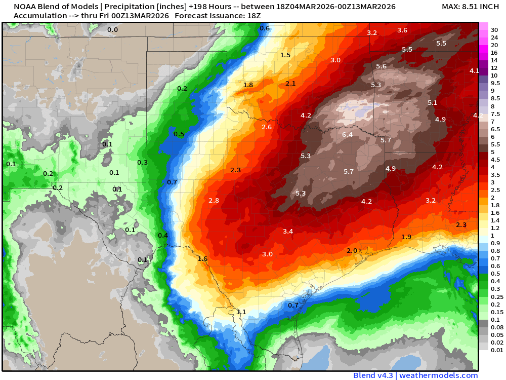 While there is a chance for a few scattered storms on Thursday, the main event begins Friday and will last through the middle of next week as a cool front approaches from the north and an upper-level low forms over Baja, then moves little over the next few days. This combo of the front and disturbances moving in from the west will give us our best chances for rain in months! All of the models are now forecasting 1-3 inches of rain for our region, with some pockets of 4-5 inches from Friday-Thursday of next week. I’m hoping my drought update tomorrow is the worst one we will see in a while.