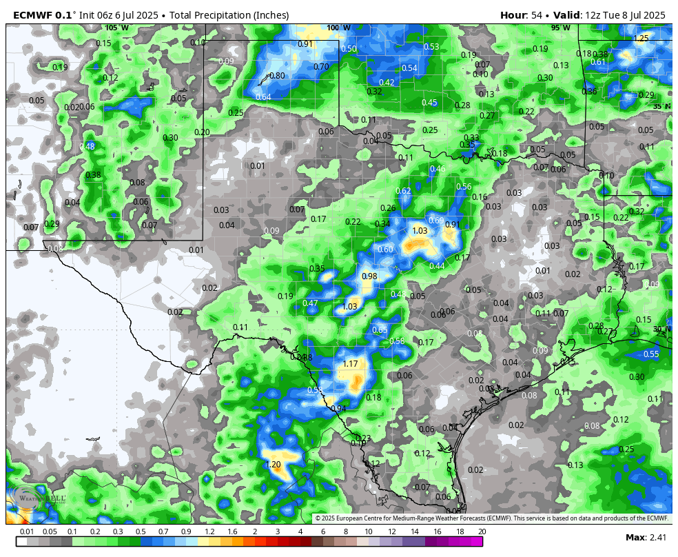 Another day of some extreme rainfall totals…fortunately most of the heavier rain did not hit in the Kerrville area where bodies continue to be found along the Guadalupe River. As of post time 43 people have died as a result of the Friday floods and many are still missing, including 27 children from Camp Mystic.