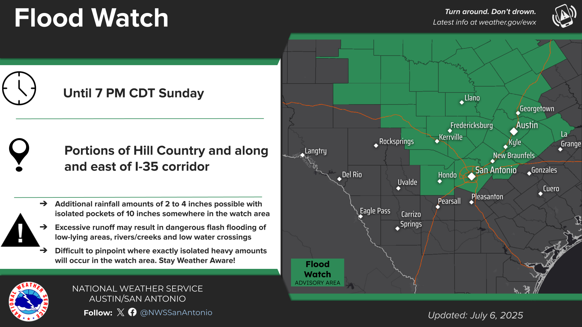 Even though our mesoscale convective system is weakening, there is still enough added moisture to our atmosphere to give us a chance for more isolated heavy rain today, mainly in the Hill Country and our northern counties.