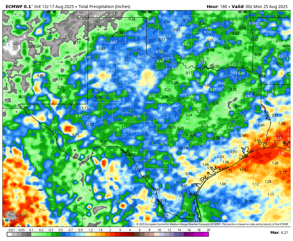 Hot and muggy out there today with most locations seeing a heat index of 100 or more degrees as of 3pm. High pressure will move to our west, centering itself over the four corners by Tuesday. This will allow sea breeze storms to form in the afternoon and not get squished by the evil high! On Thursday, a dying cool front will move into our area, bolstering our rain odds even more, through the weekend. As I mentioned yesterday, this will not be a drought breaker, but most of the models are forecasting 1/2 to an inch for most locations from Tuesday-Sunday. If you want more rain than that, root for the Canadian model, which is forecasting 2-4 inches of rain for many of us!