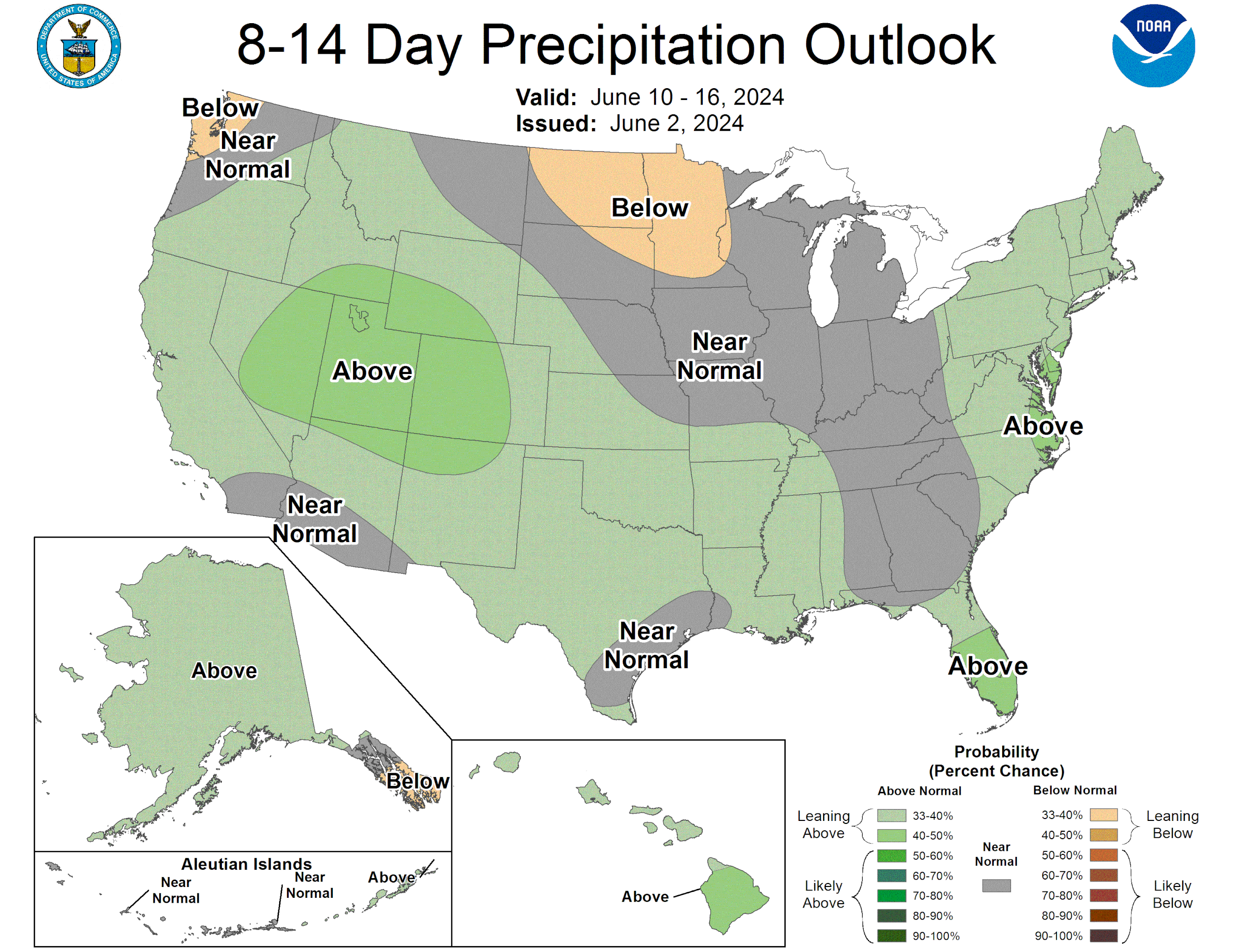 Well, if you like temperatures at or near the century mark and lots of sun, this is your week! While there is a slight chance for another storm to sneak in from the west like last night, look for mostly dry conditions for South-Central and South Texas for the next week. The latest HRRR model thinks some storms could move into south Texas from Mexico tomorrow evening...we shall see if this model changes its mind on Monday. Some of the models are hinting at a rain event around the 10th, but that's pretty far out to get excited. The CPC 6-10 and 8-14 day forecast keeps us in slightly better than 50-50 odds for above normal precipitation.