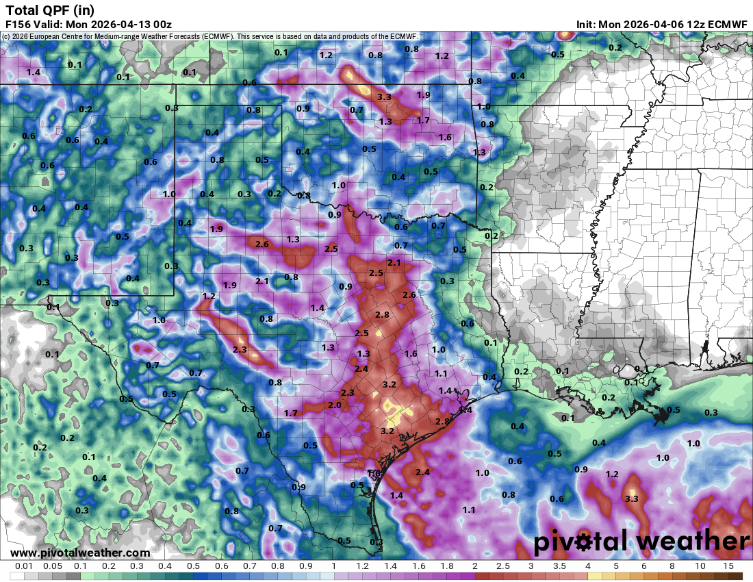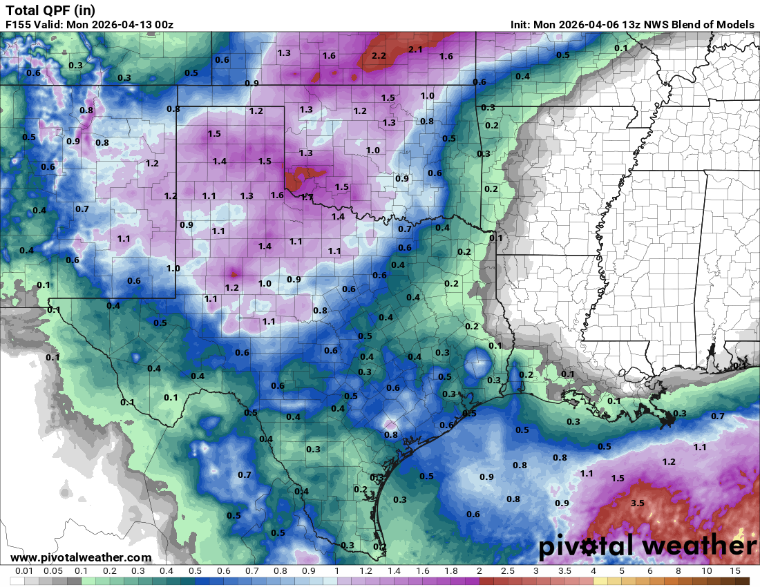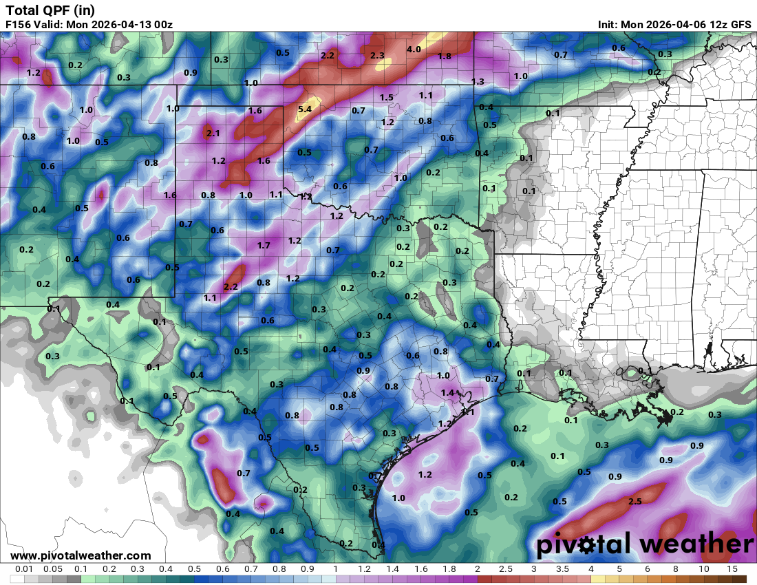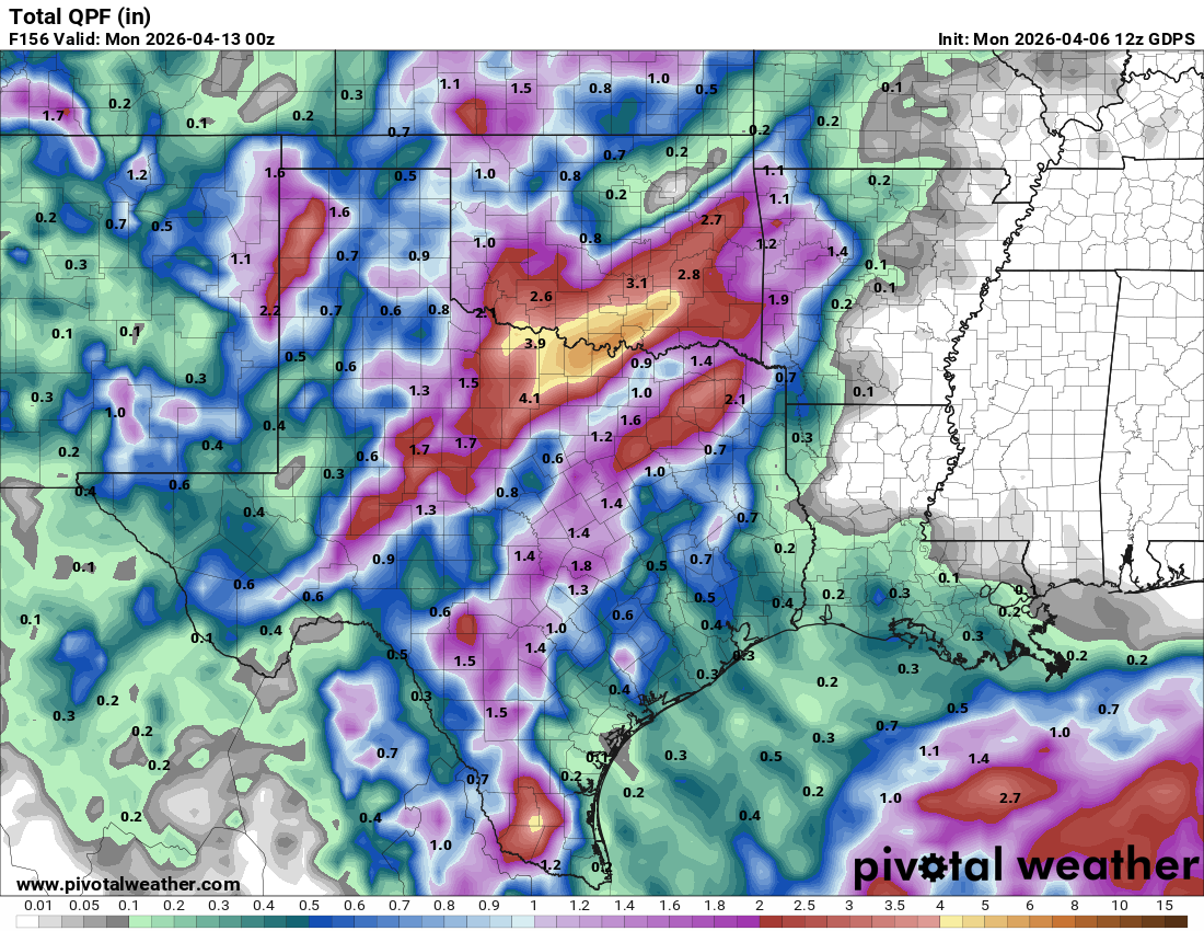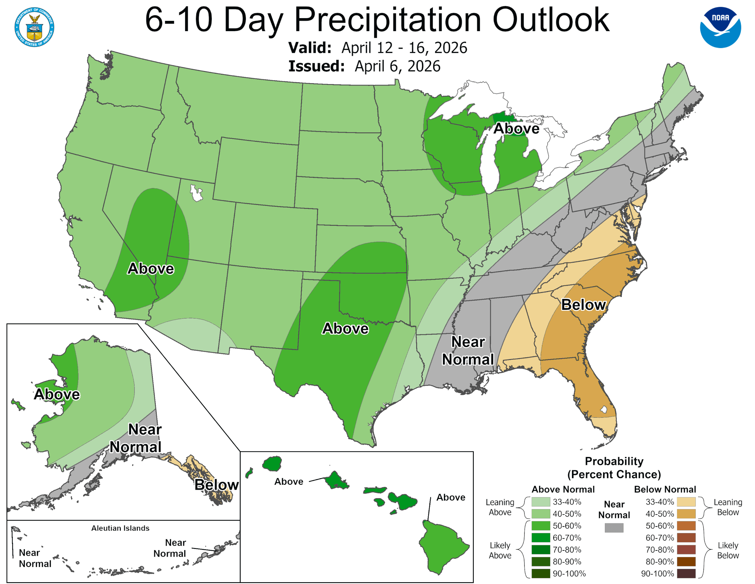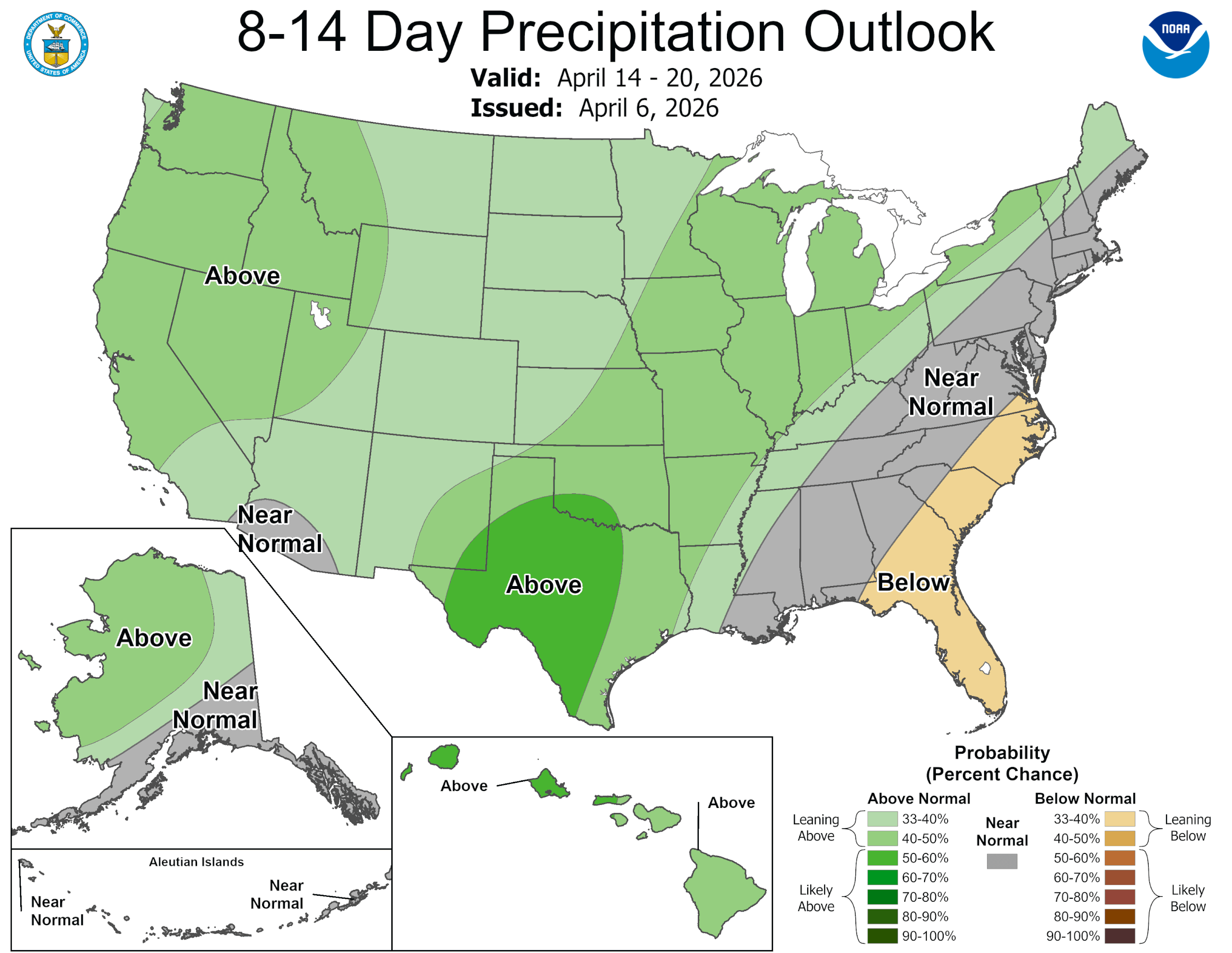 April will certainly not be a clone of March! The CPC’s latest outlooks keep us at better than 50/50 odds for above normal rainfall for the next two weeks. A four corners system from the SW will give us our next chance for rain over the weekend as upper level Pacific moisture moves in from the SW and SE winds at the surface bring in Gulf humidity. A dry line will form to our west, aiding in the development of potentially severe storms.