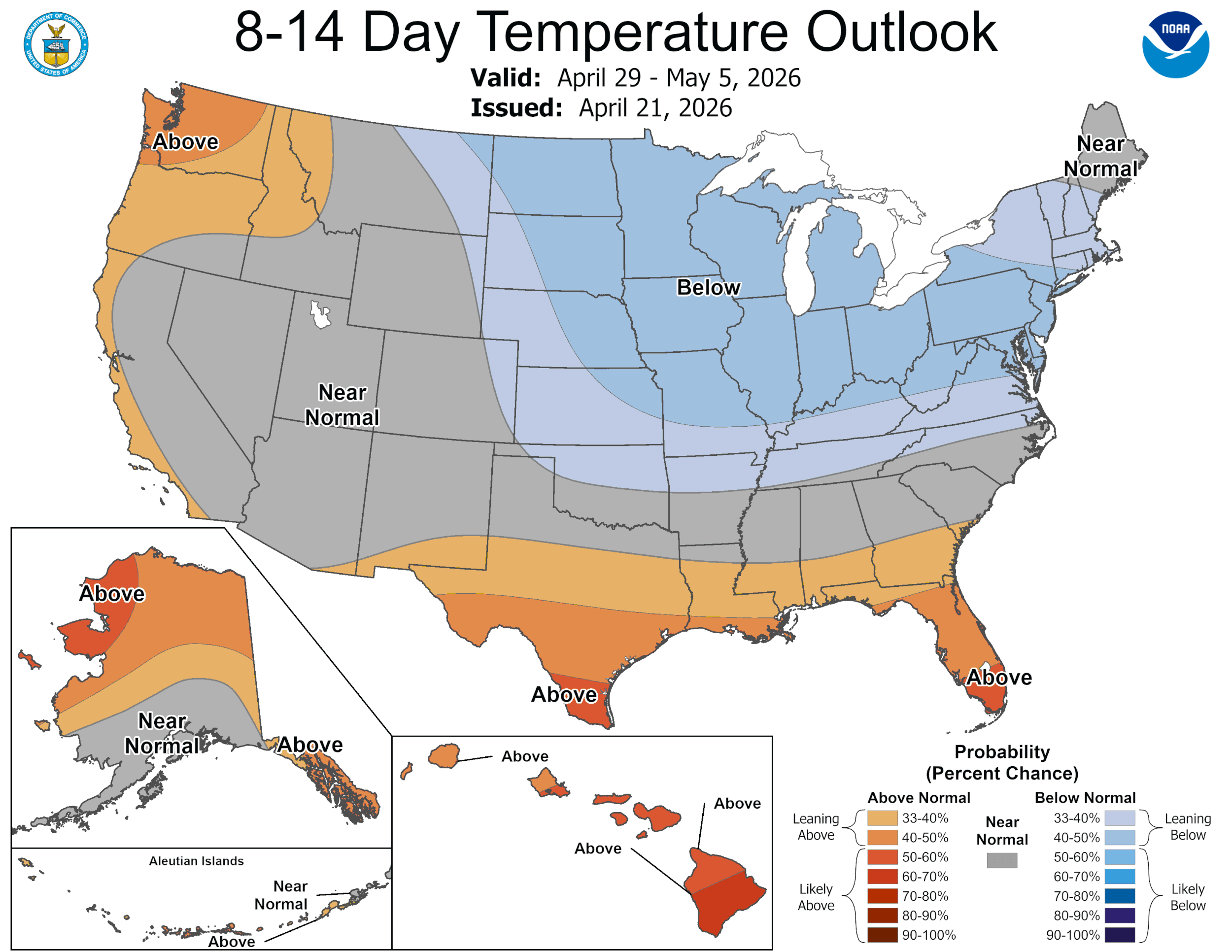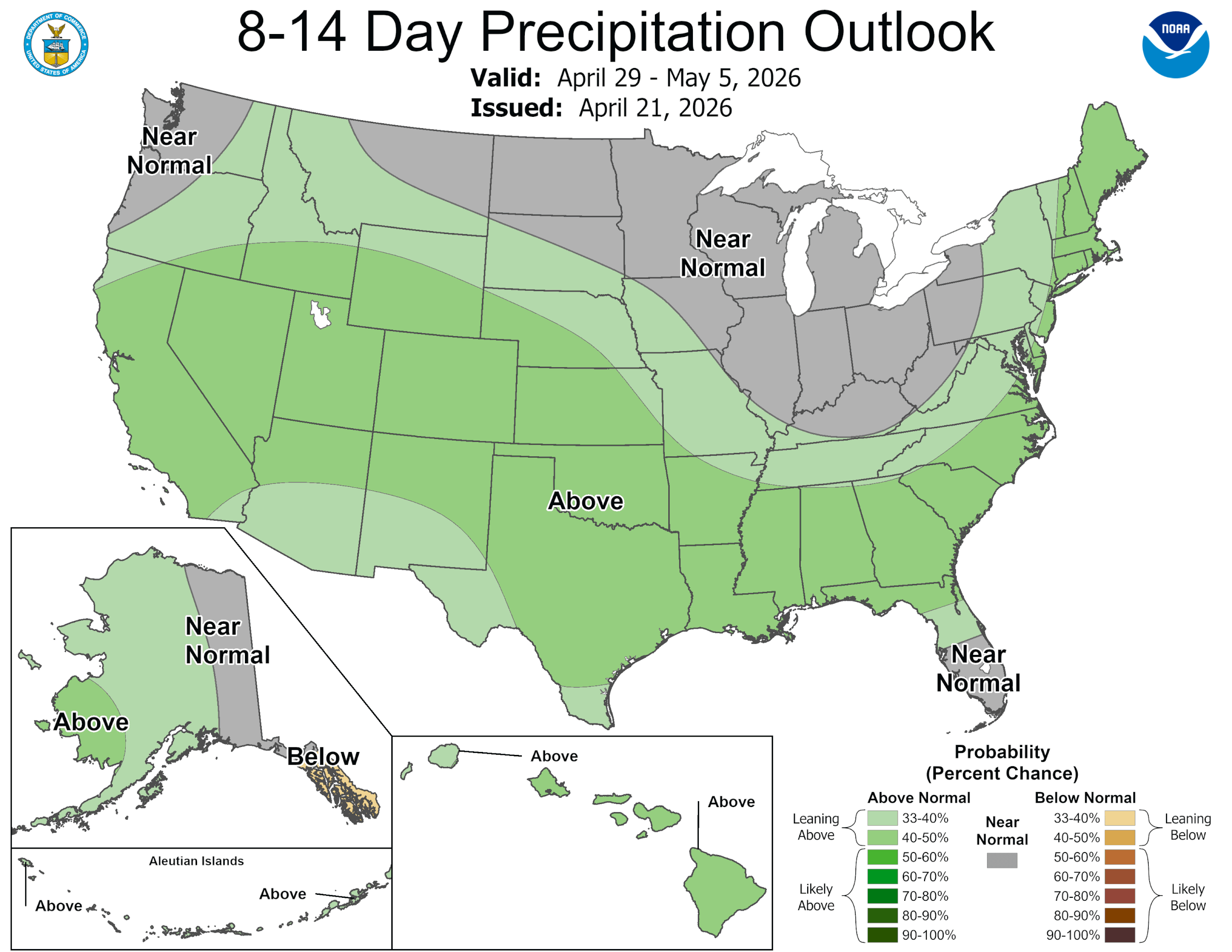 The CPC continues to keep us in the better than 50/50 odds for above normal rain through the end of the month and into May. We will look into our next rain chances tomorrow.