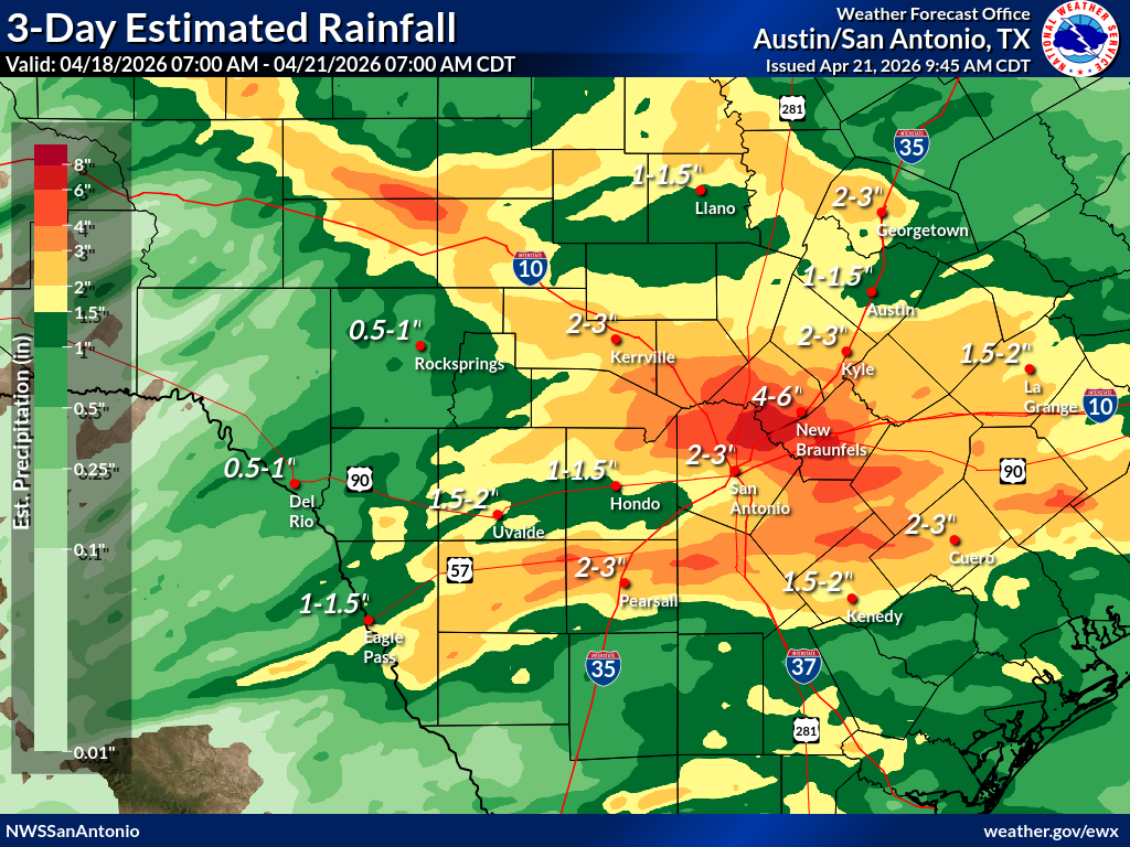 While there is still a chance for scattered showers and storms for another 24hrs, mainly east of HWY 281 north and south. Unless we see more rain training, the big rains have shifted NE of our area. I am amazed at the one day and three day totals for both south-central and south Texas. Almost everyone recorded at least a half inch of rain and as you probably already seen, some locations in and around San Antonio recorded 5-7 inches of rain!