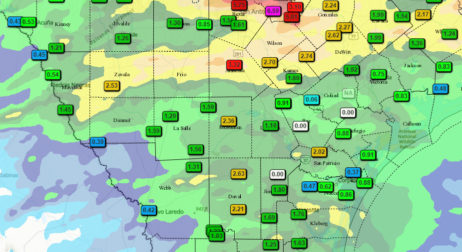Here is a link to 24hr rainfall totals in south-central Texas: IEM :: PNS from NWS EWX