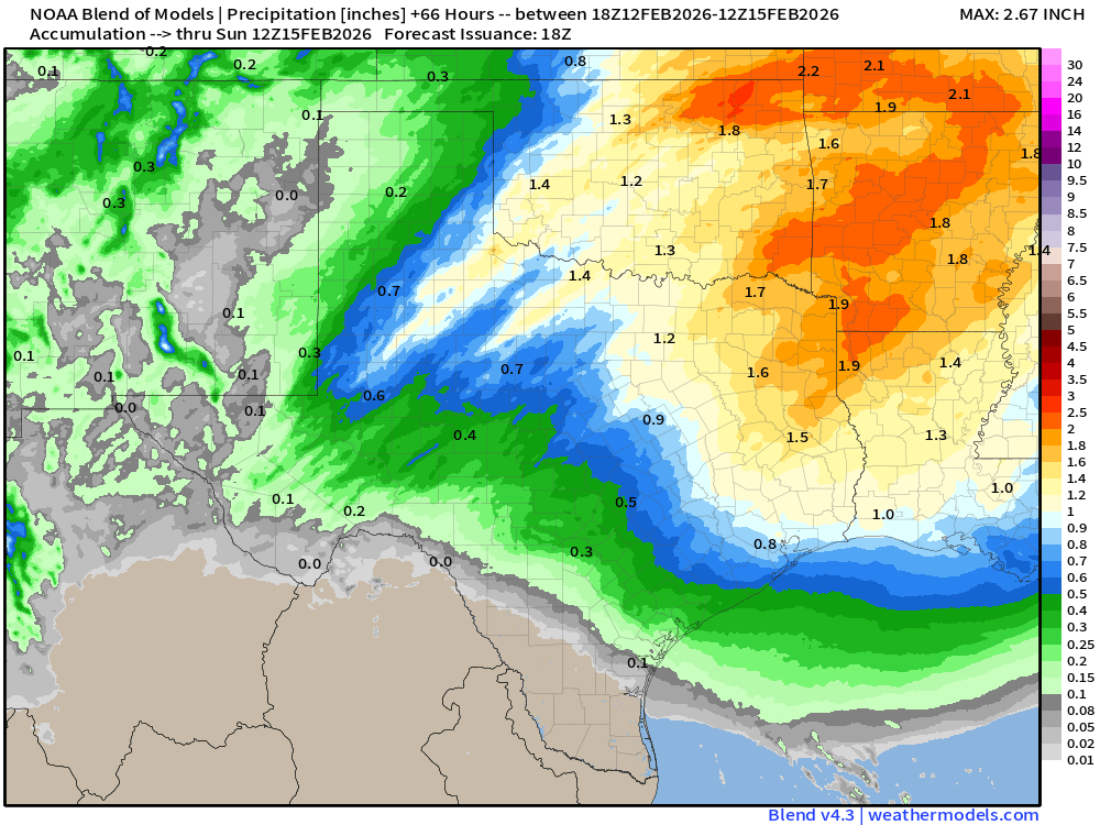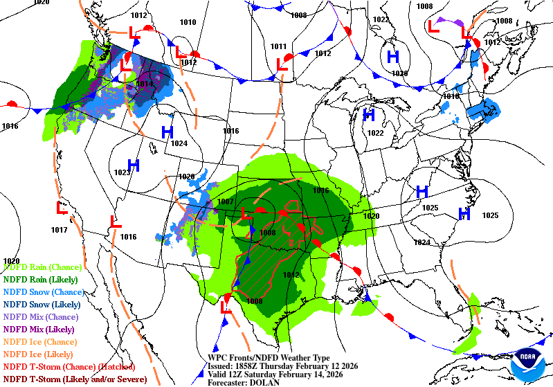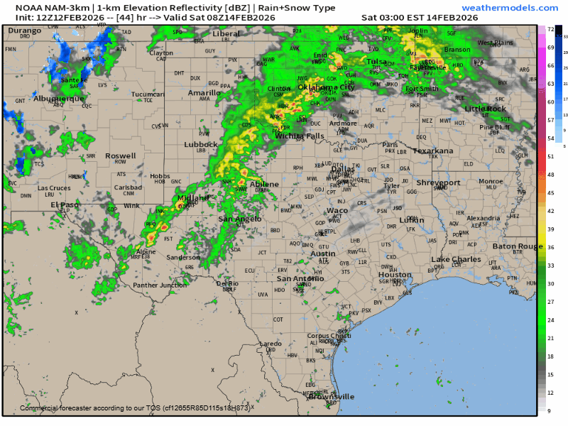 Continued warm temperatures with 80’s making an appearance again this afternoon. A trough and associated cool front will give us a chance for showers on Friday night, then a chance for thunderstorms on Saturday as the front moves through. I have included a NAM radar forecast animation and how much rain the latest NBM model thinks will fall from Friday through Saturday. As I have mentioned most of this week, the best odds for rain and better rain totals will be along and north of HWY 90 and east of I-37. The very best rains will stay in north Texas.