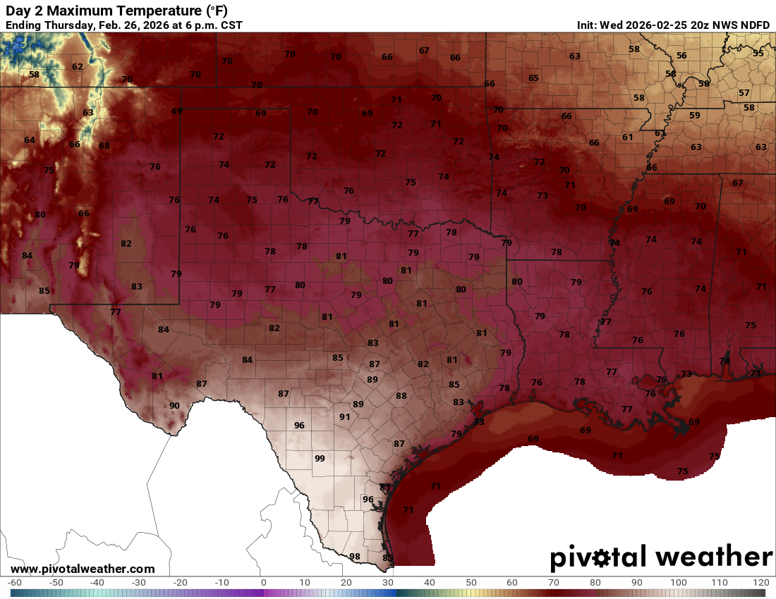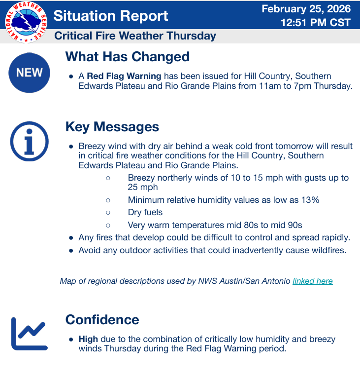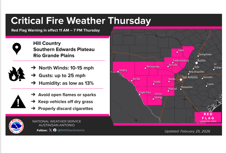 Certainly not one of my favorite combos…hot, dry and windy! A Red Flag Warning has been issued for the Hill Country, southern Edwards Plateau and Rio Grande Plains for Thursday, February 26th, from 11 AM to 7 PM. Even with no Red Flag Warning in effect today, at least one big fire in the Hill Country near Enchanted Rock, has charred over 1000 acres. Fortunately, firefighters are making some progress on this fire and it is now 70% contained.