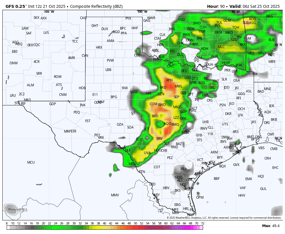 A nice line of storms are forecast to form in west Texas, then move SE. This is where the storms are likely to be around midnight on Friday night.