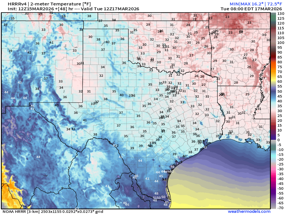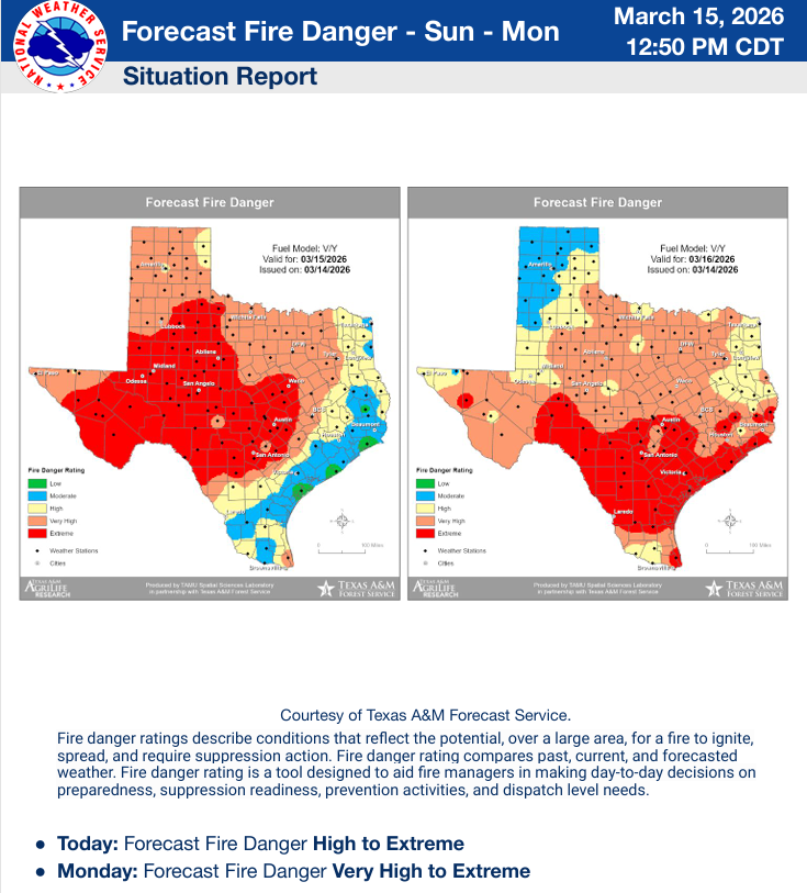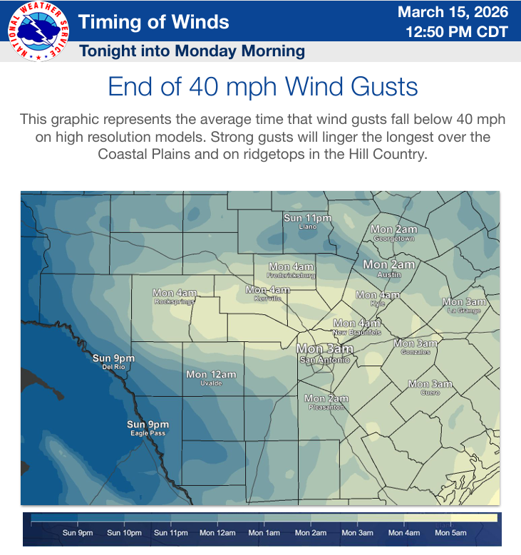 “A powerful cold front arriving this afternoon/evening will bring strong winds, critical fire weather conditions, and much colder temperatures across South-Central Texas. Critical fire weather conditions linger into Monday as winds gradually weaken during the day. Light freezes are possible over the Hill Country Monday morning and over the Hill Country and adjacent low lying areas near the Balcones Escarpment Tuesday morning. A rain free forecast remains through next week with a warming trend from midweek through the weekend.”