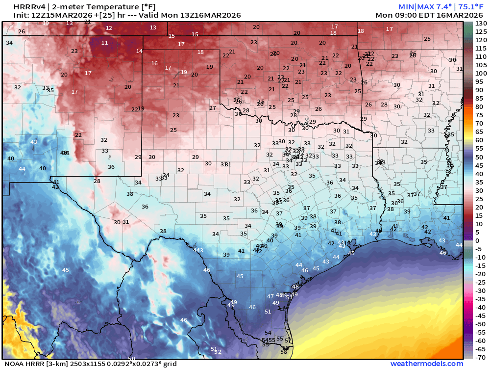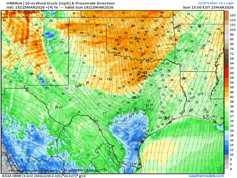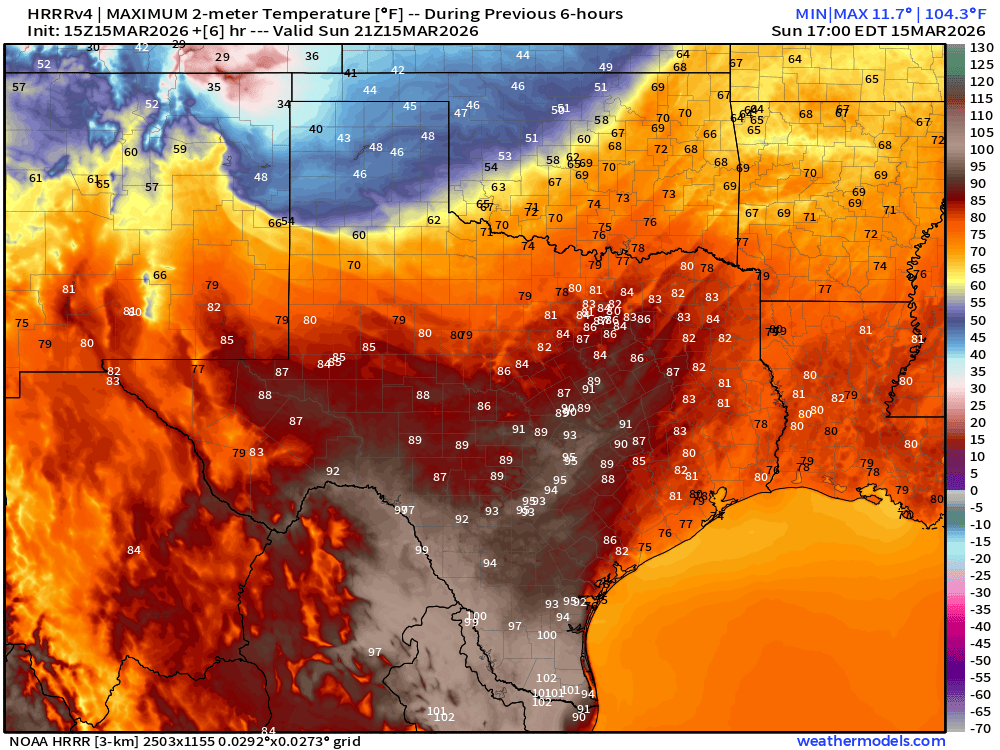 Temperatures are on the rise this afternoon as a dry line moves our direction from the west before a very strong cold front moves in from the north later today. We will likely see quite a few record highs before the front moves through with most areas hitting the upper 90’s and low 100’s. A dramatic change in the next 12 hours as temps drop into the 30’s and 40’s before sunset. Winds will be on the increase later this afternoon with gusts over 45mph expected tonight.