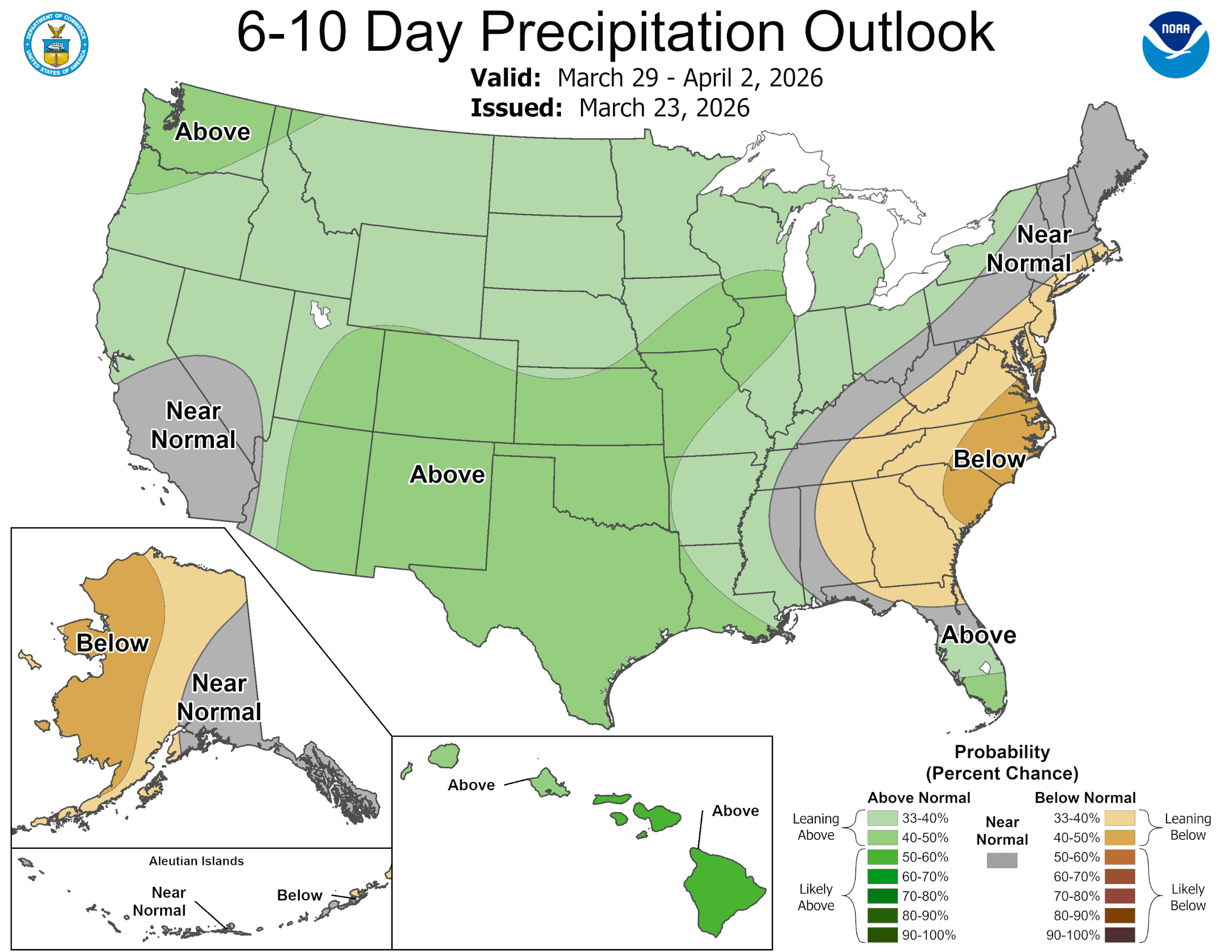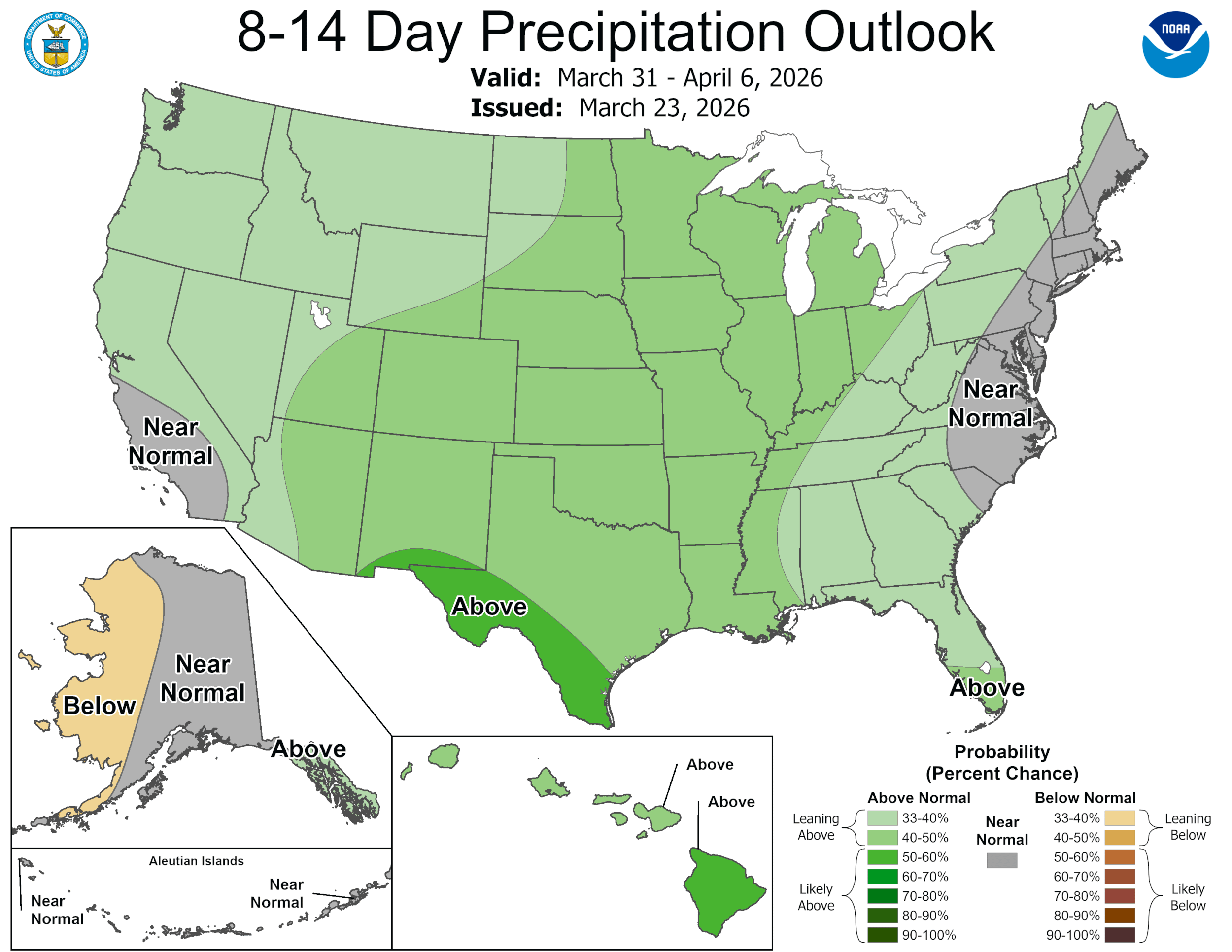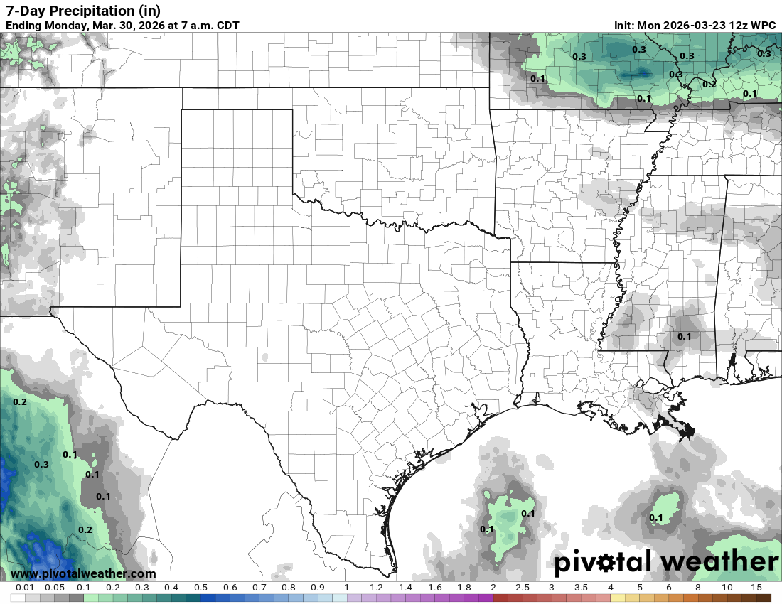 Models are still looking promising that an upper level trough will impact our weather by the middle of next week. Don’t get too focused on the rain totals this far out from the models…just be happy that we will actually see rain chances coming back not only for Texas, but the SW as well. The latest CPC outlooks continue to look green, giving us a better than 50/50 odds for above normal precipitation for early April.