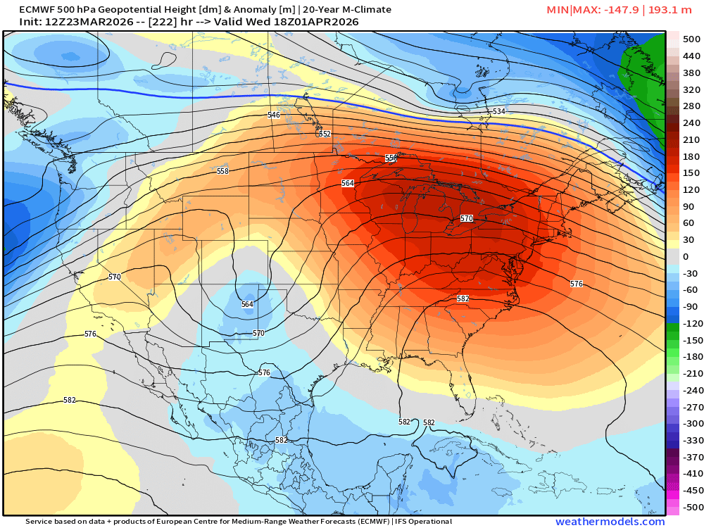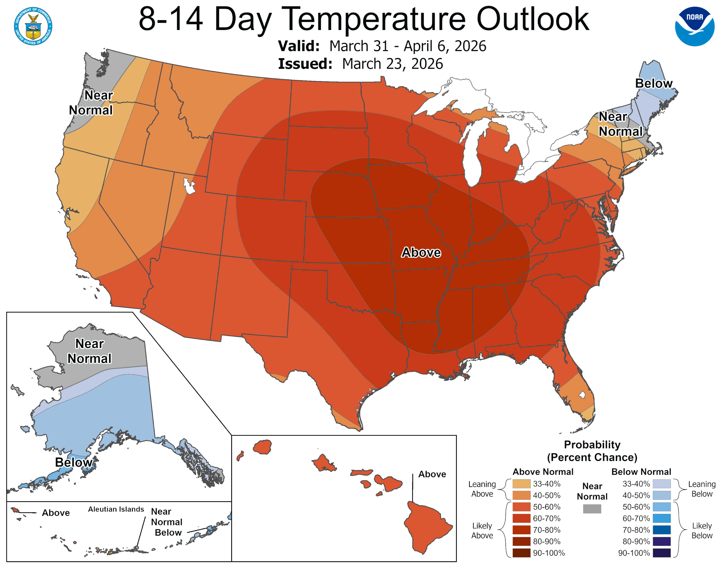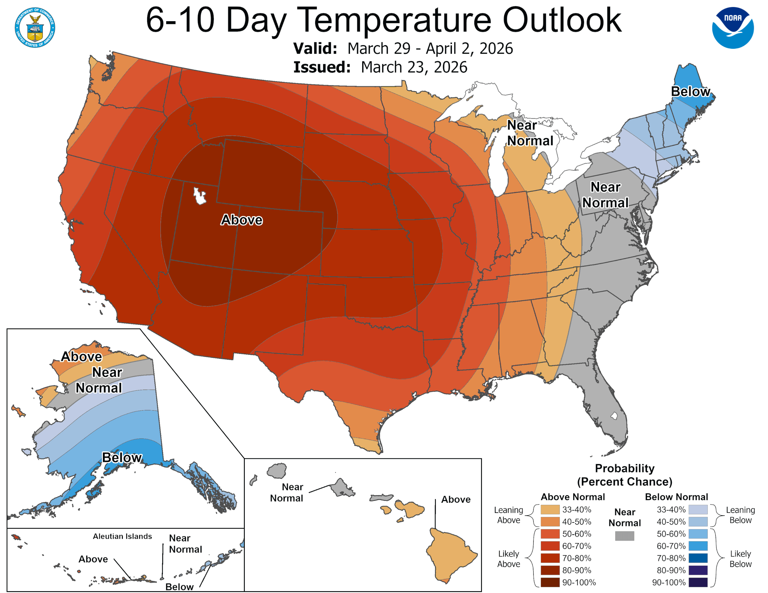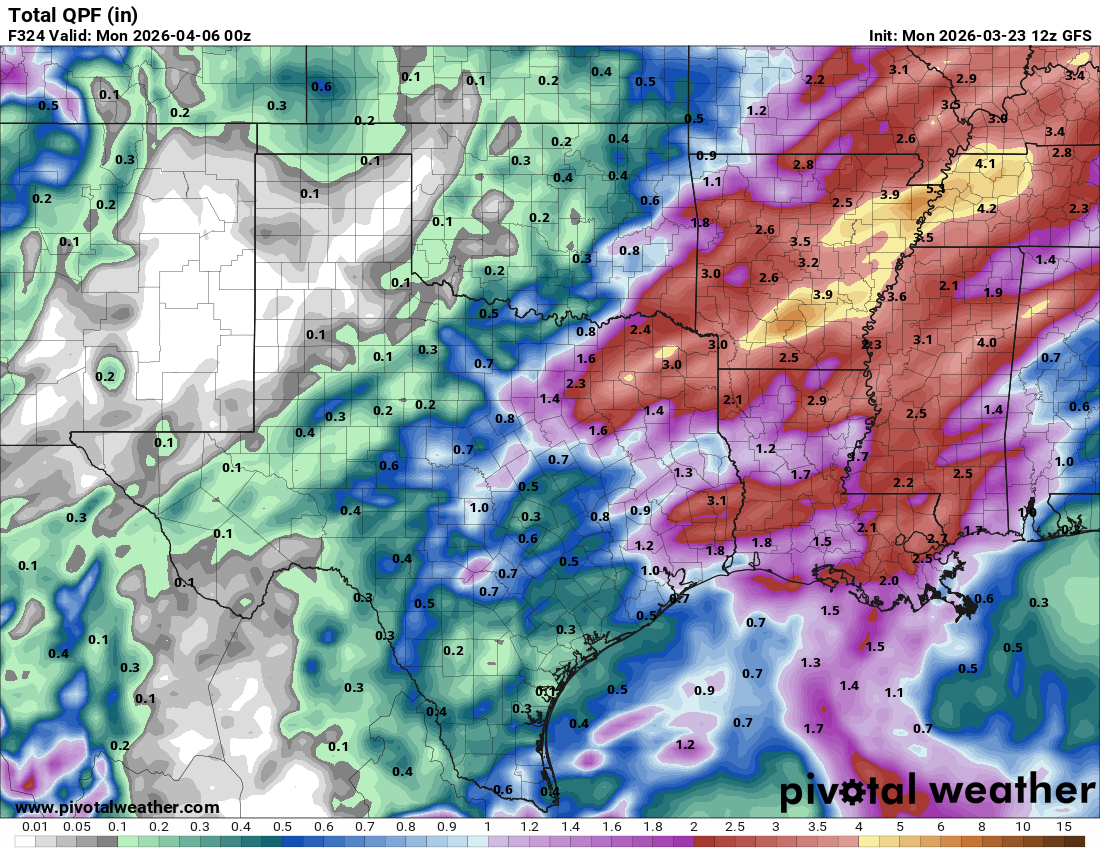 Models are still looking promising that an upper level trough will impact our weather by the middle of next week. Don’t get too focused on the rain totals this far out from the models…just be happy that we will actually see rain chances coming back not only for Texas, but the SW as well. The latest CPC outlooks continue to look green, giving us a better than 50/50 odds for above normal precipitation for early April.
