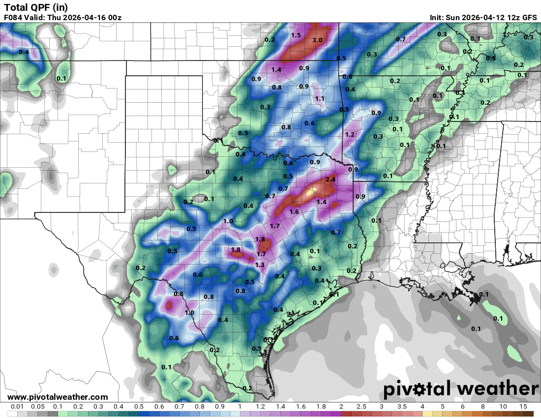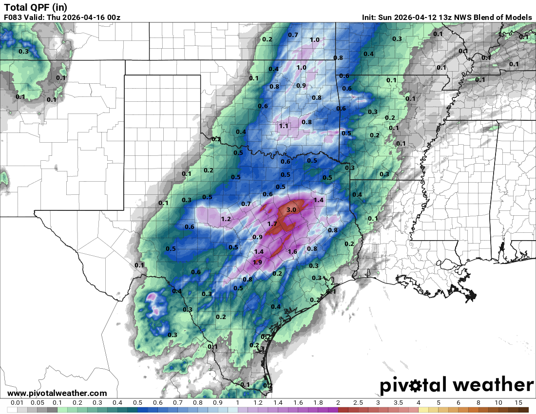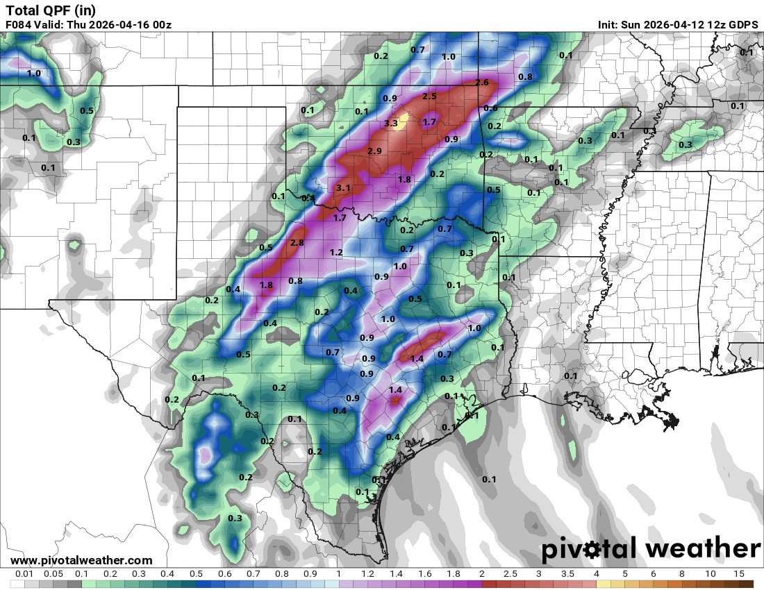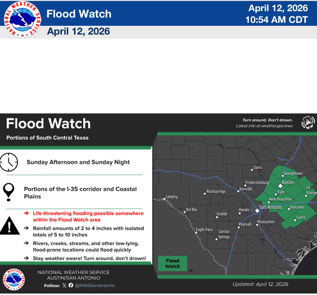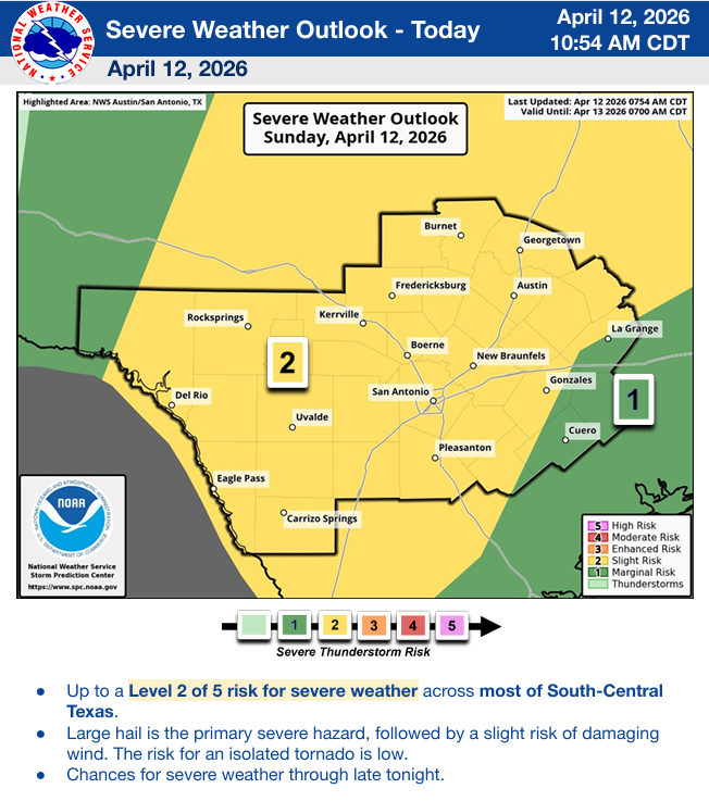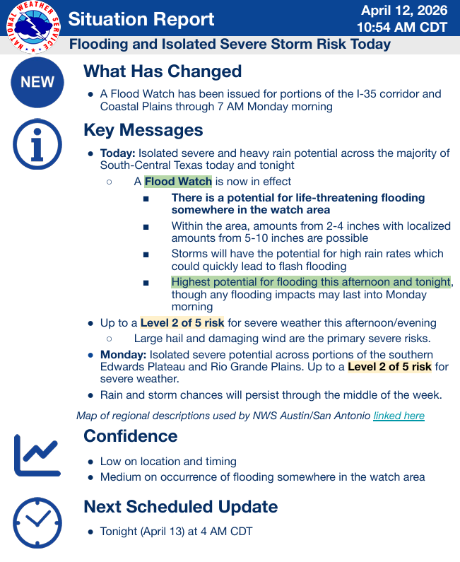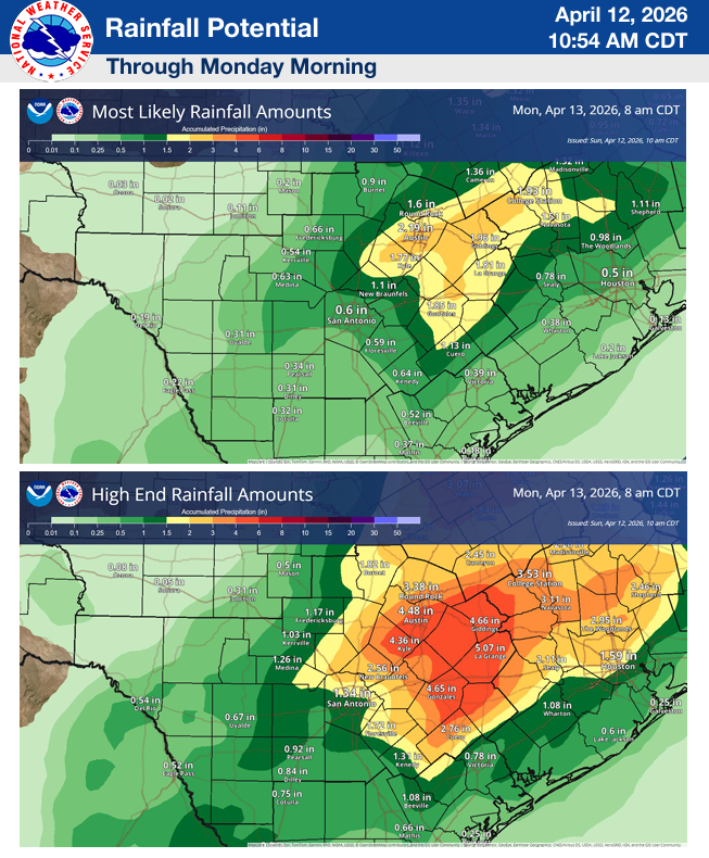 There were some hefty rainfall totals exceeding 3 inches for parts of the NW and northern Hill Country last night. Graphics are below and when the NWS releases their report, I will post in the comments section below. We still have a good chance for scattered storms this afternoon and some of the storms will drop some heavy rain with a chance for large hail and high winds. Below is the latest from the NWS. Additional chances for rain on Monday and Wednesday, but the odds are not as good as today.