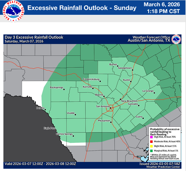 While we could see a few wildly scattered storms this afternoon, the show for us starts tomorrow. This from the NWS: “Today's risk for severe weather has shifted to the north of South Central Texas. A few light to moderate shower and maybe an isolated thunderstorm is possible across the Hill Country. For Saturday, a level 2 of 5 for severe thunderstorms and level 2 of 4 risk for excessive rainfall are in place for a good portion of South Central Texas as a cold front pushes across the local area. There is a second episode for the potential of severe thunderstorms and localized heavy rain Tuesday through Wednesday of next week as another cold front moves over the local area.” Pease make sure your NOAA radio is turned on along with your emergency phone apps for local warnings.