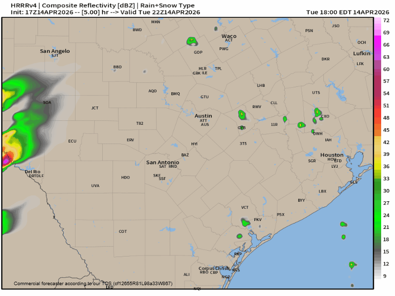 The latest HRRR radar simulation model run for this afternoon and evening.