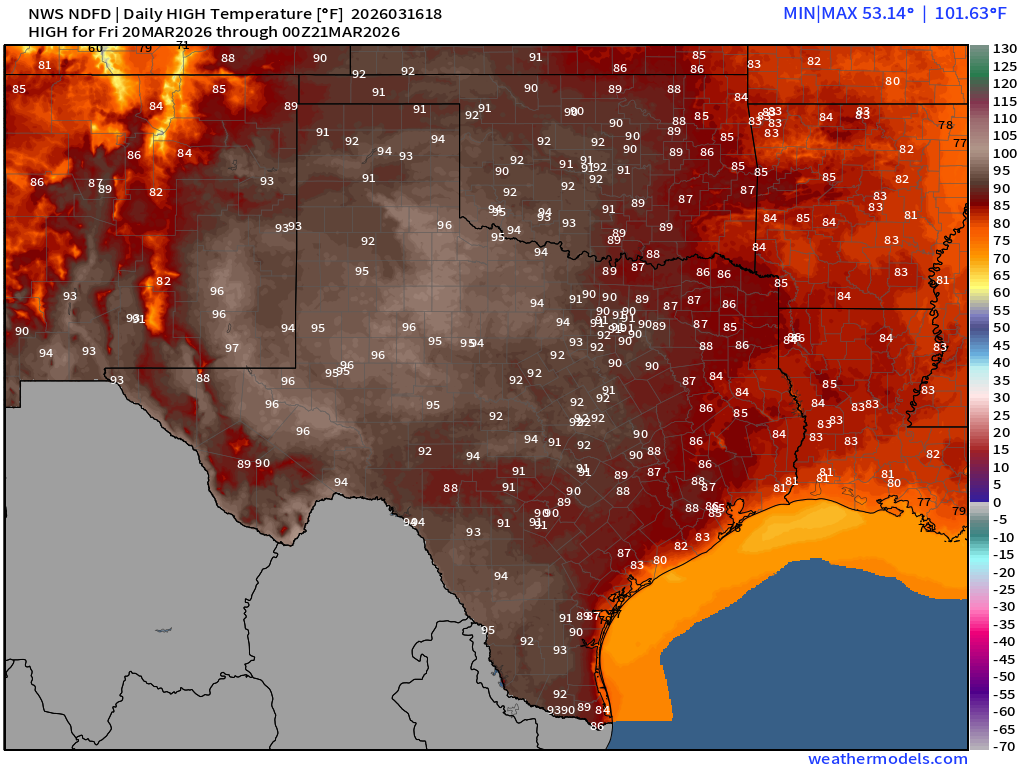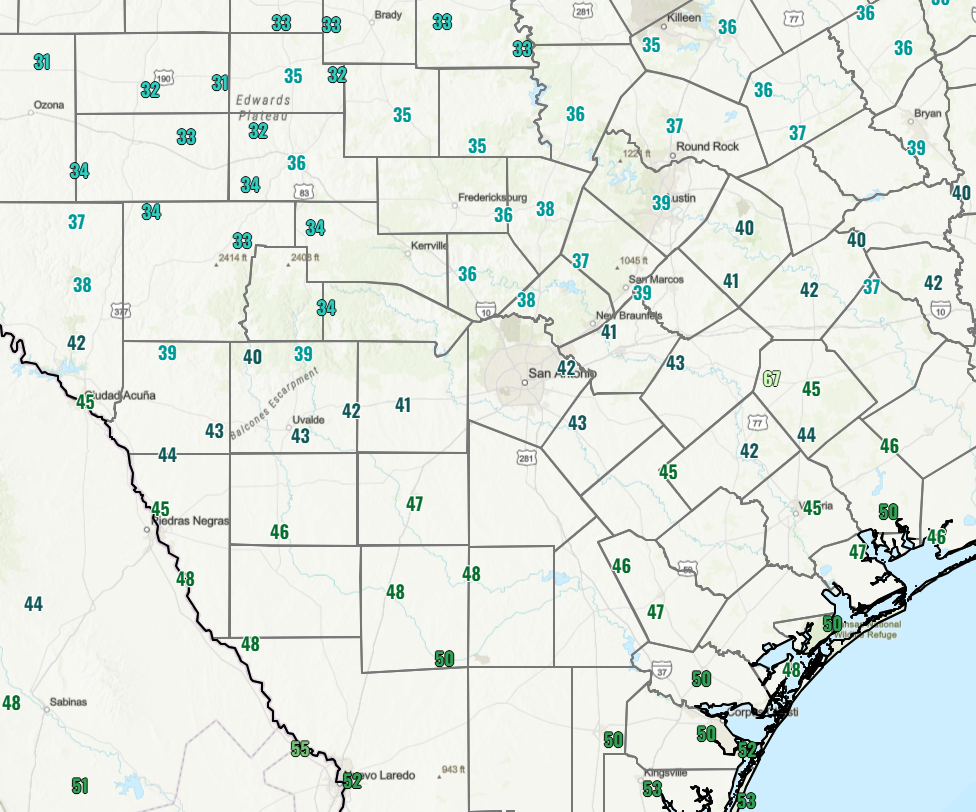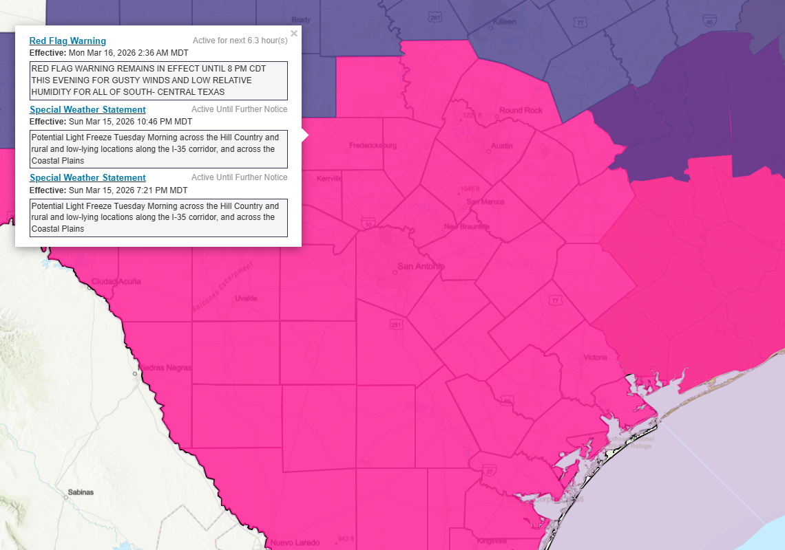 From the NWS: “Critical fire weather conditions persist through this evening. A light freeze is forecast Tuesday morning across portions of the southern Edwards Plateau, Hill Country, I-35 Corridor, and Coastal Plains. Near critical fire weather conditions for portions of the Rio Grande, southern Edwards Plateau, and Hill Country on Tuesday. A warming trend is in store for the middle of the week into the weekend with daily high records in jeopardy Friday and Saturday.”