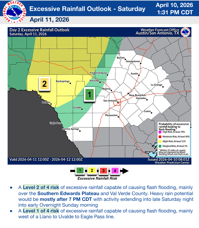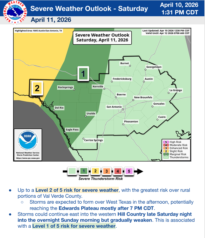 Severe storms are possible starting tomorrow (NW counties) as the first disturbance moves through during the evening and during the night. The main threat will be on Sunday as a disturbance moves through in the afternoon and we should see a line of thunderstorms moving across the Rio Grande by sunset. The Storm Prediction Center just extended the yellow zone into our SW counties as far as Laredo and as far east as San Antonio. Make sure you keep your emergency apps and NOAA radio turned on to receive local warnings. Hail and high wind will be the biggest threat.