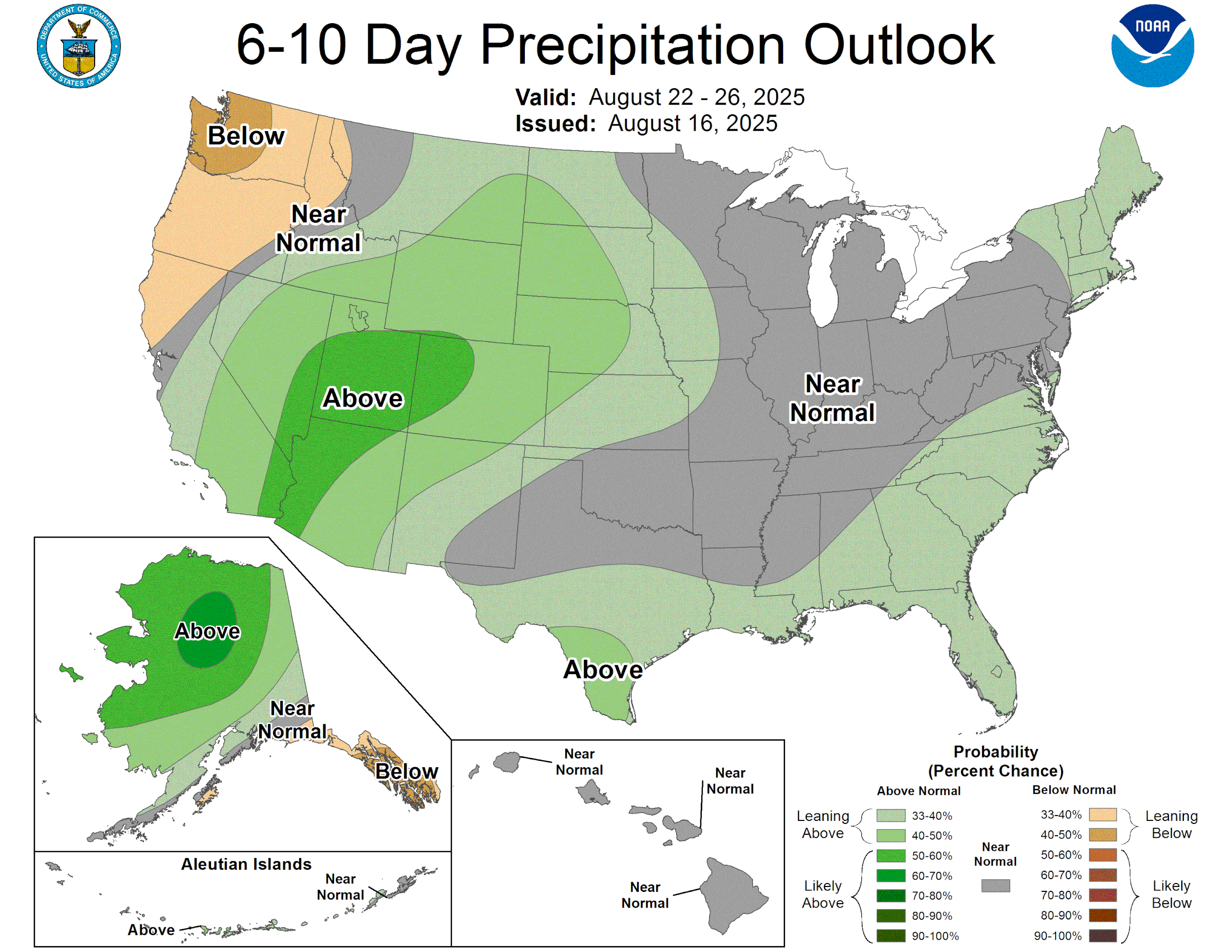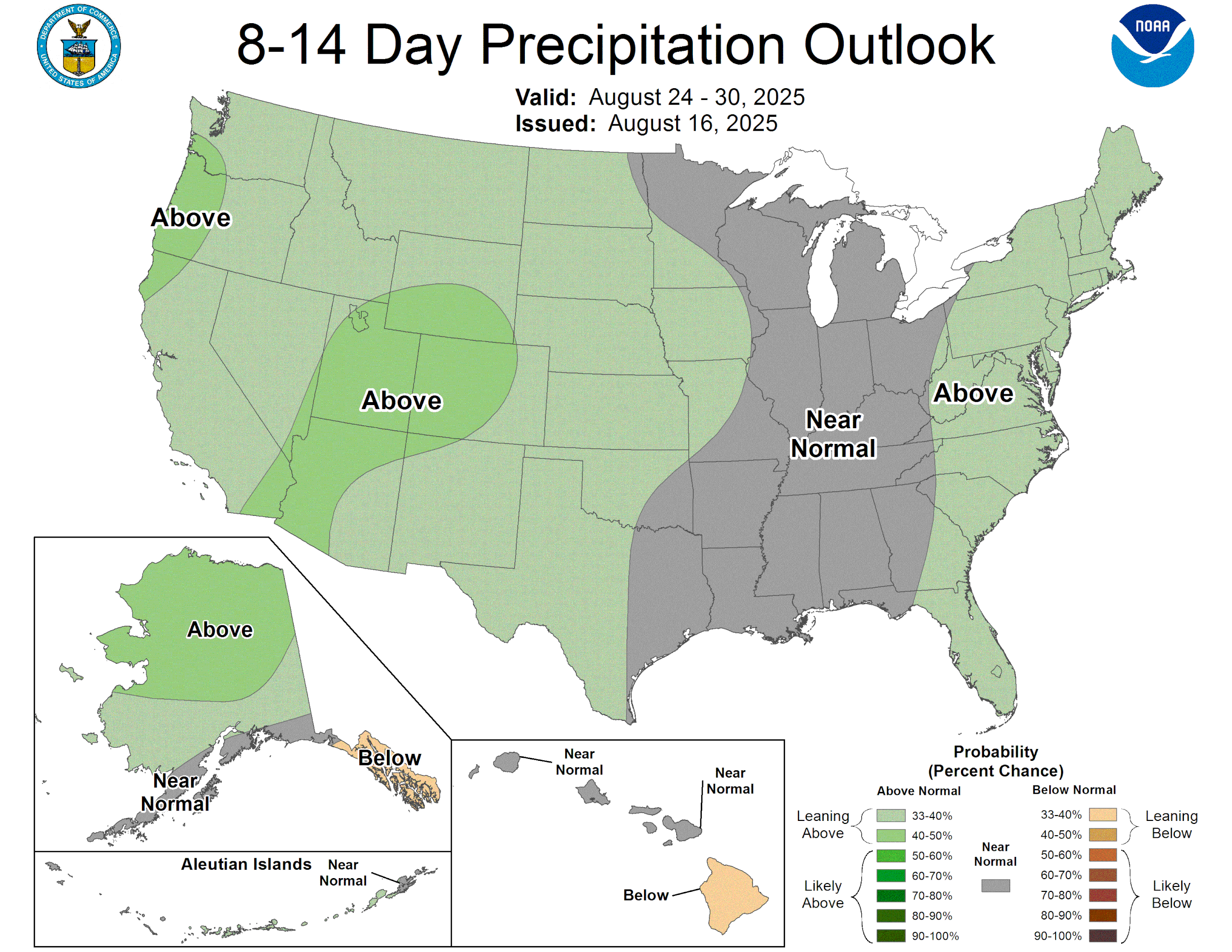 By Tuesday, rain chances return as high pressure moves west, opening the door for an inverted trough to slowly move into our area from the Gulf, giving us decent odds for more pm poppers through at least Friday! While not a drought buster, it’s great to see high pressure breaking down and giving us some rain relief as we move towards the back side of August. CPC outlooks for 6-10 and 8-14 days continue to give us better than 50/50 odds for wetter than normal precipitation.