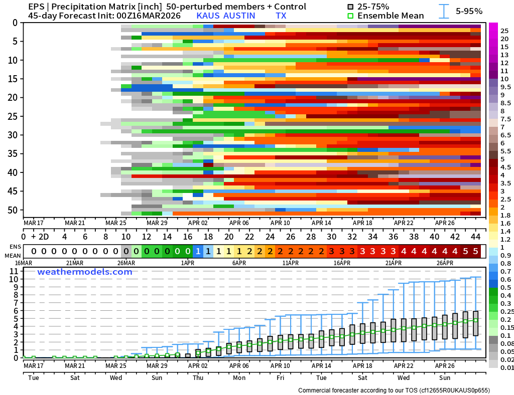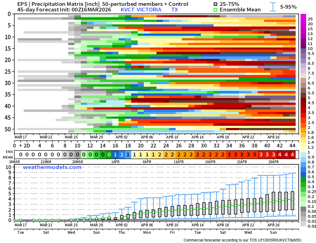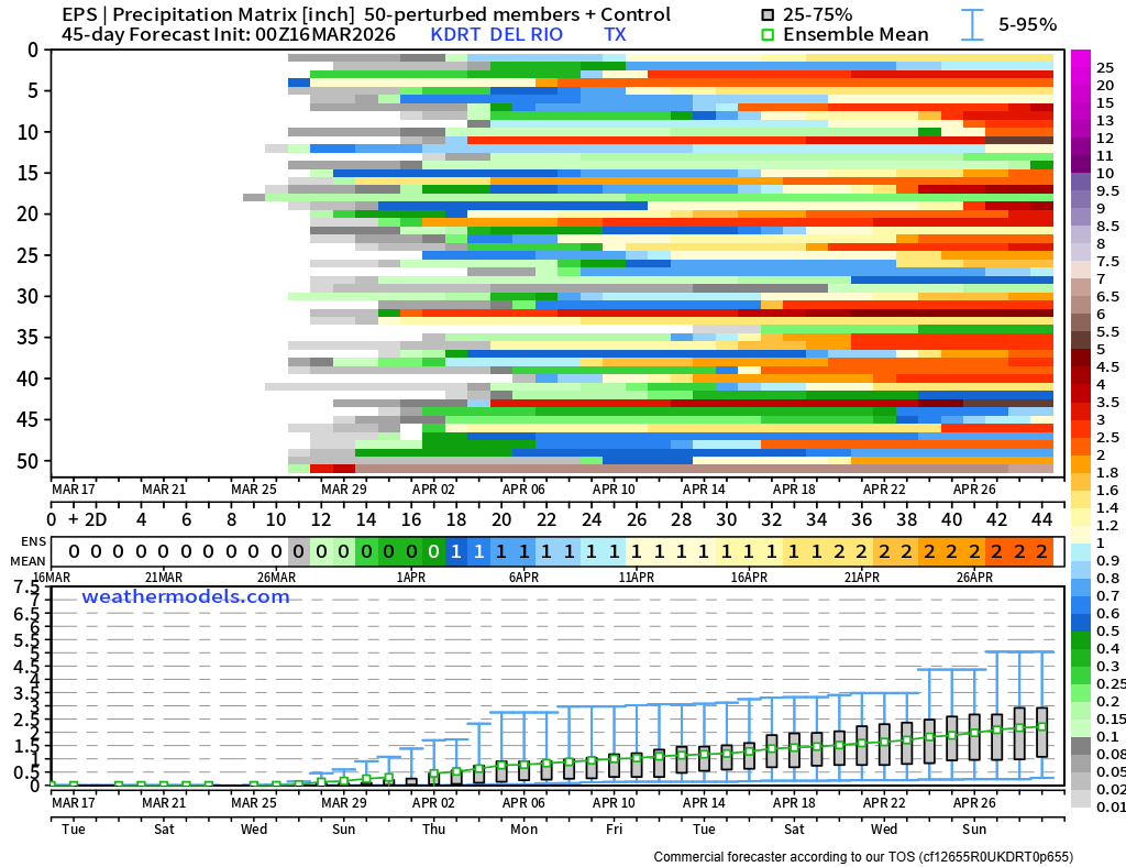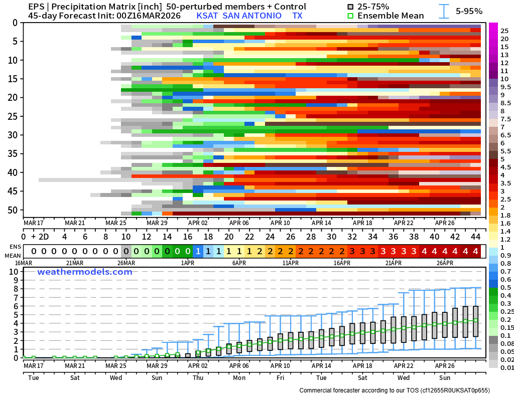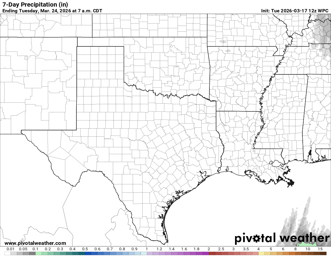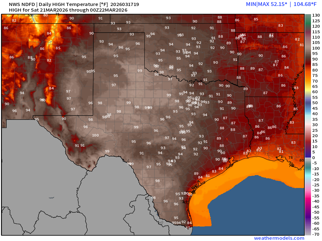 We start a gradual warm up today and by Friday we’ll be back into the 90’s again. Look for a very warm weekend with highs in the mid 90’s for most of us and some 100’s in our SW counties. With the Hell High positioned over the west, rain odds are zero for at least the next 7 days. Long-range models are starting to look more promising for the last few days of March and the first week of April as the Hell High breaks down. I have posted a few 45day outlooks for some of our locations and all are predicting 1-3 inches of rain for next month.