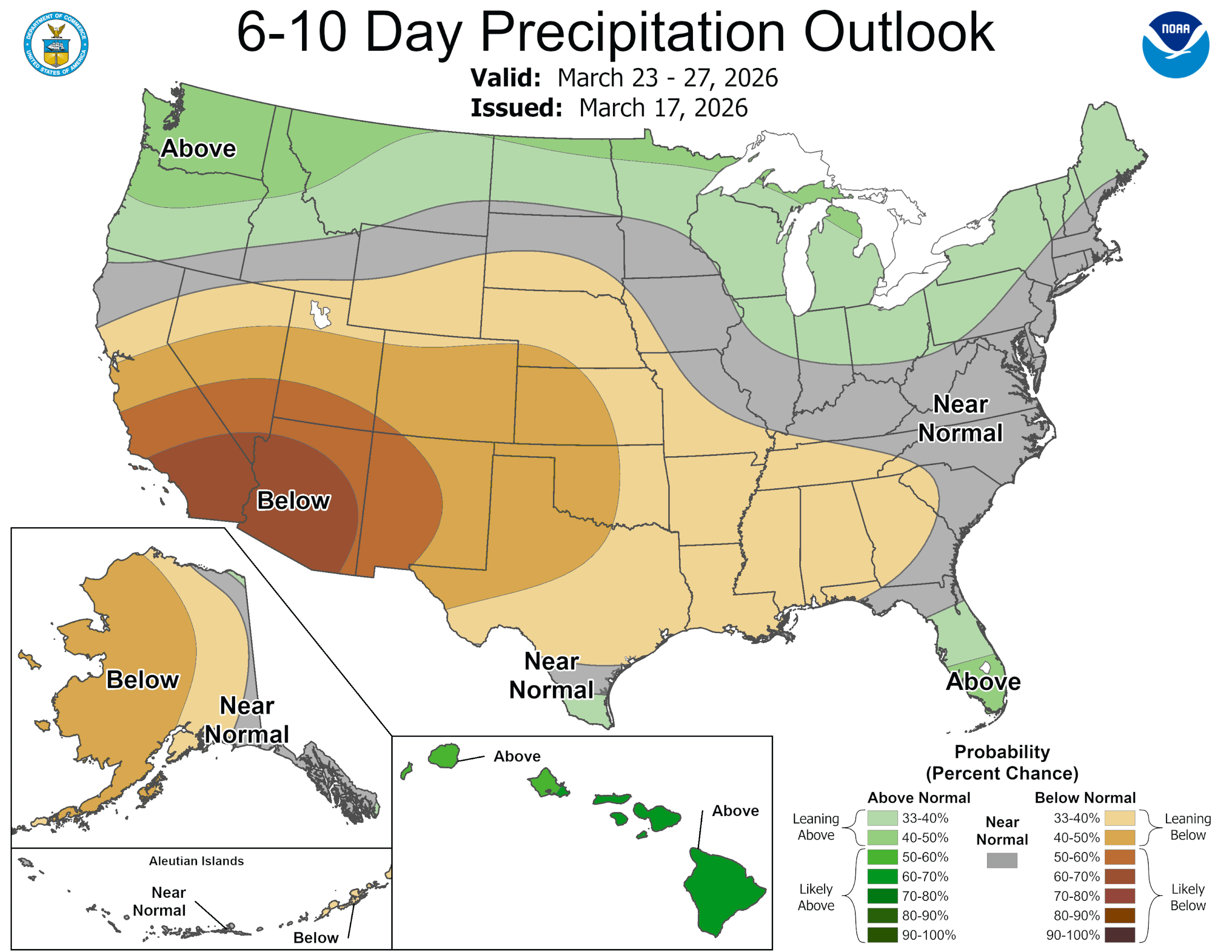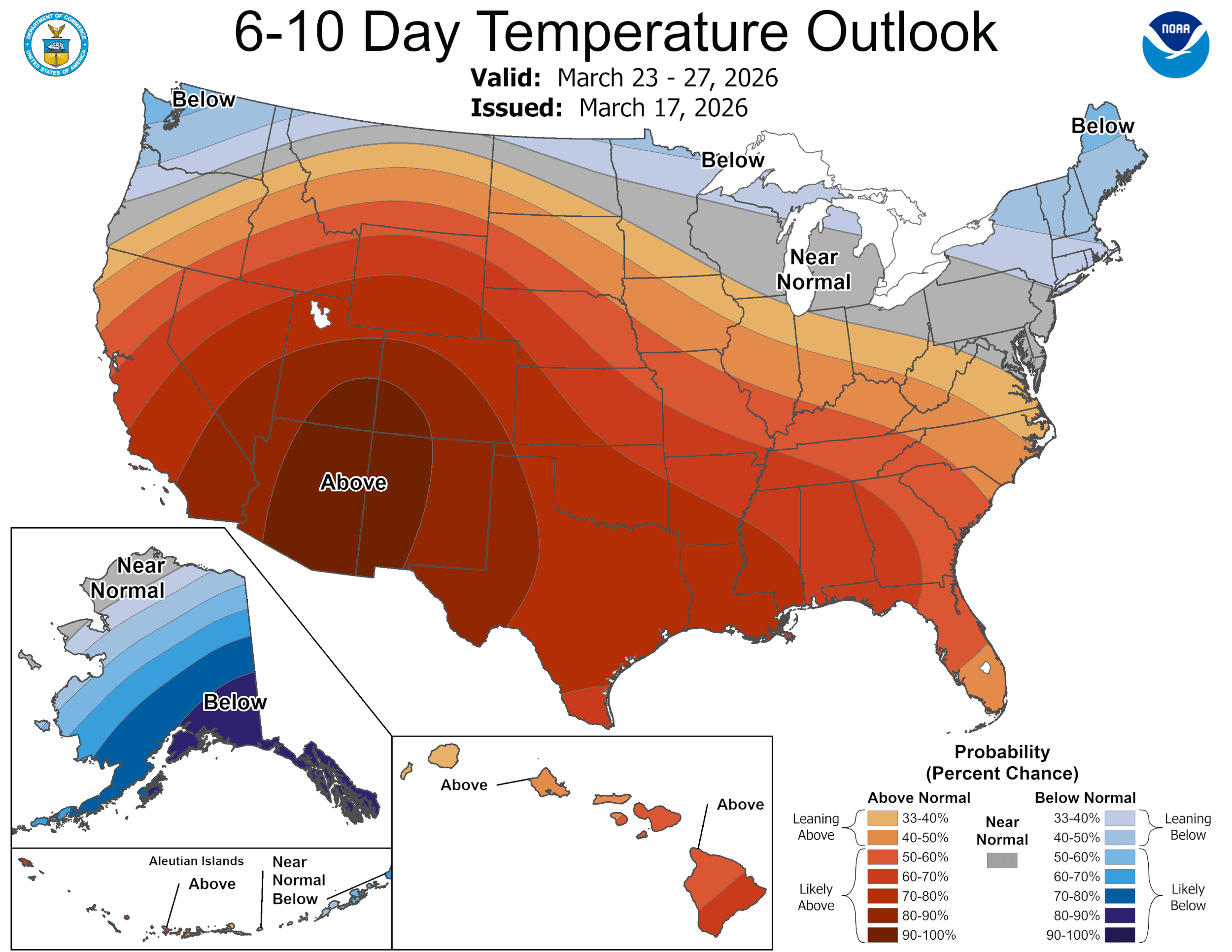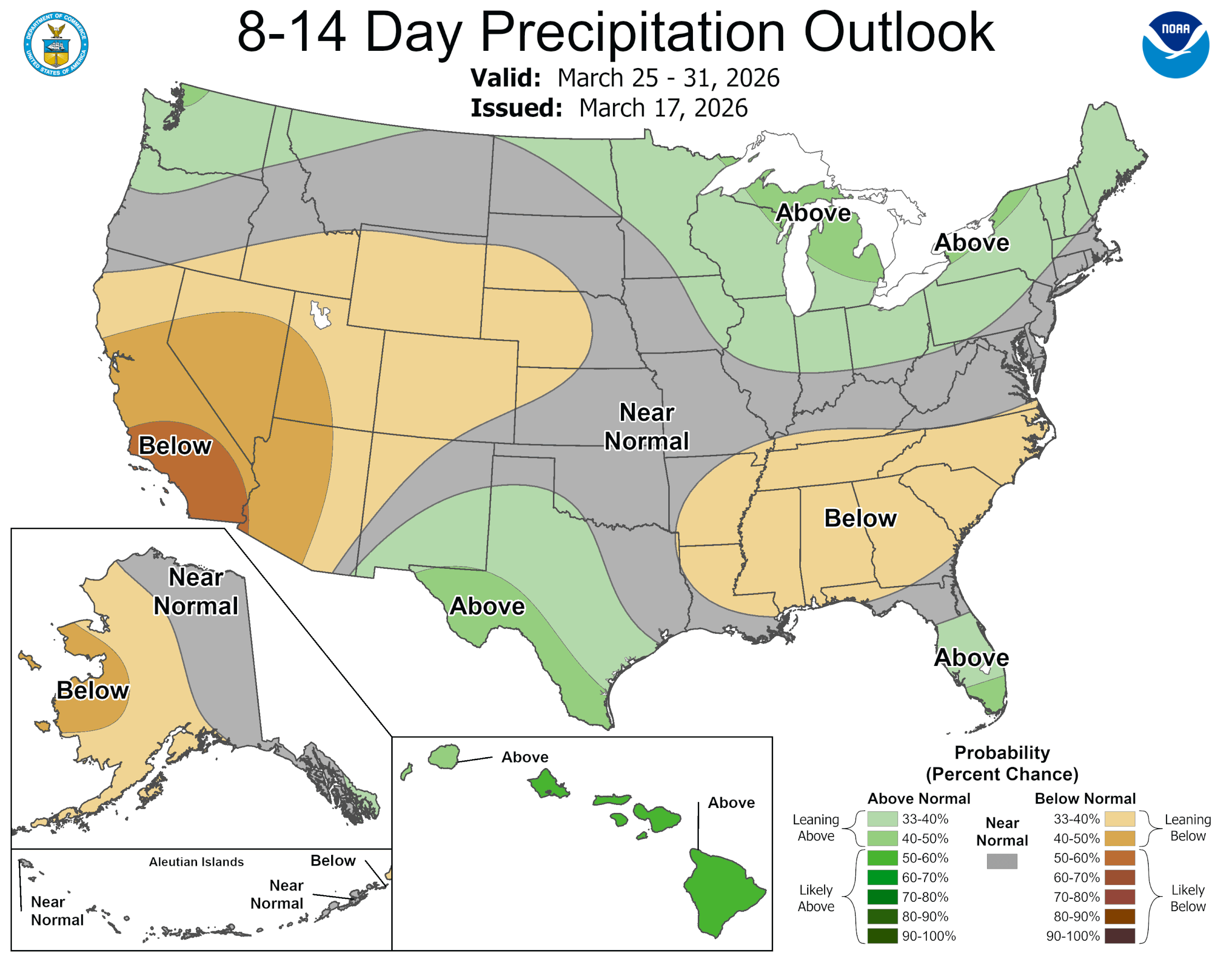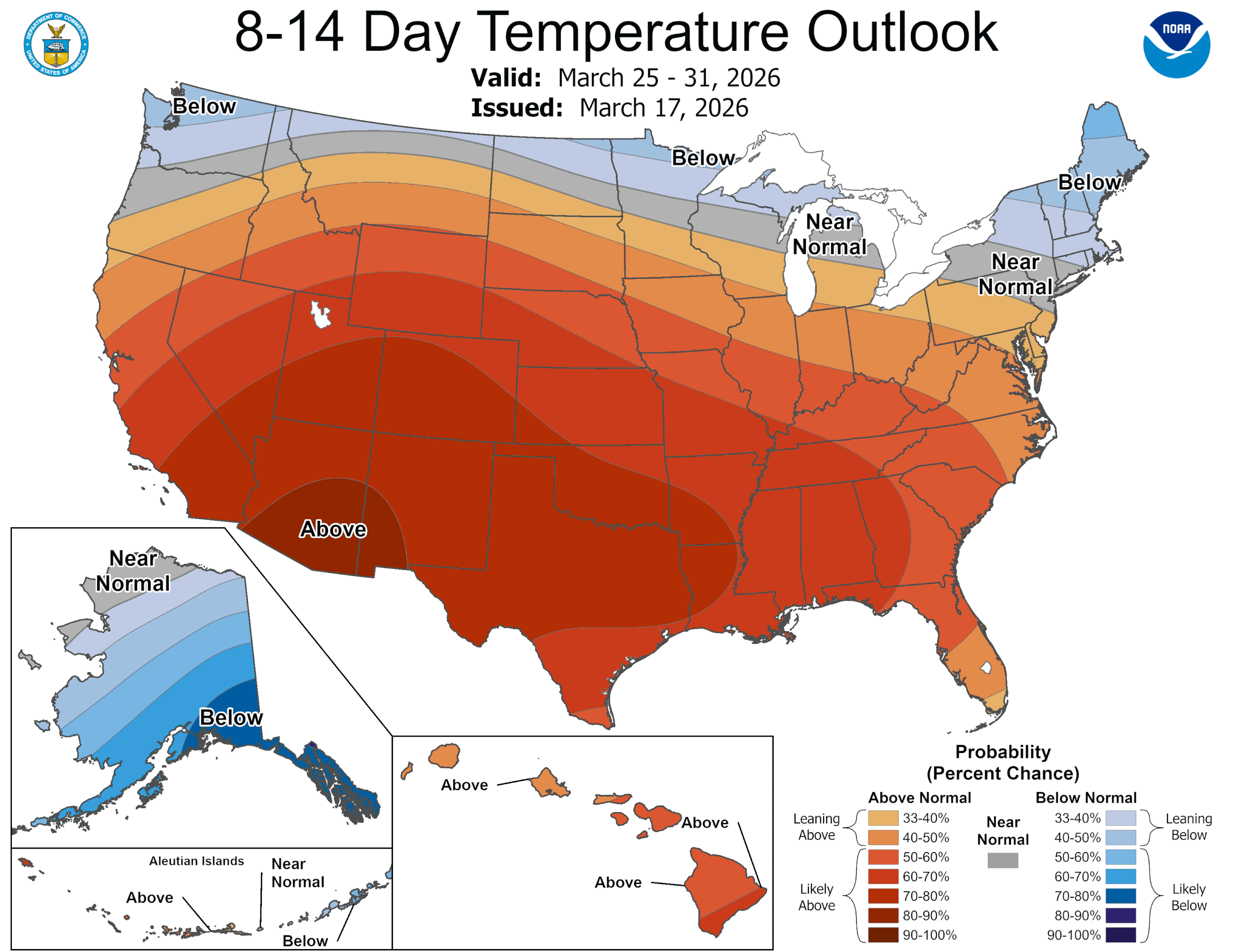 We start a gradual warm up today and by Friday we’ll be back into the 90’s again. Look for a very warm weekend with highs in the mid 90’s for most of us and some 100’s in our SW counties. With the Hell High positioned over the west, rain odds are zero for at least the next 7 days. Long-range models are starting to look more promising for the last few days of March and the first week of April as the Hell High breaks down. I have posted a few 45day outlooks for some of our locations and all are predicting 1-3 inches of rain for next month.