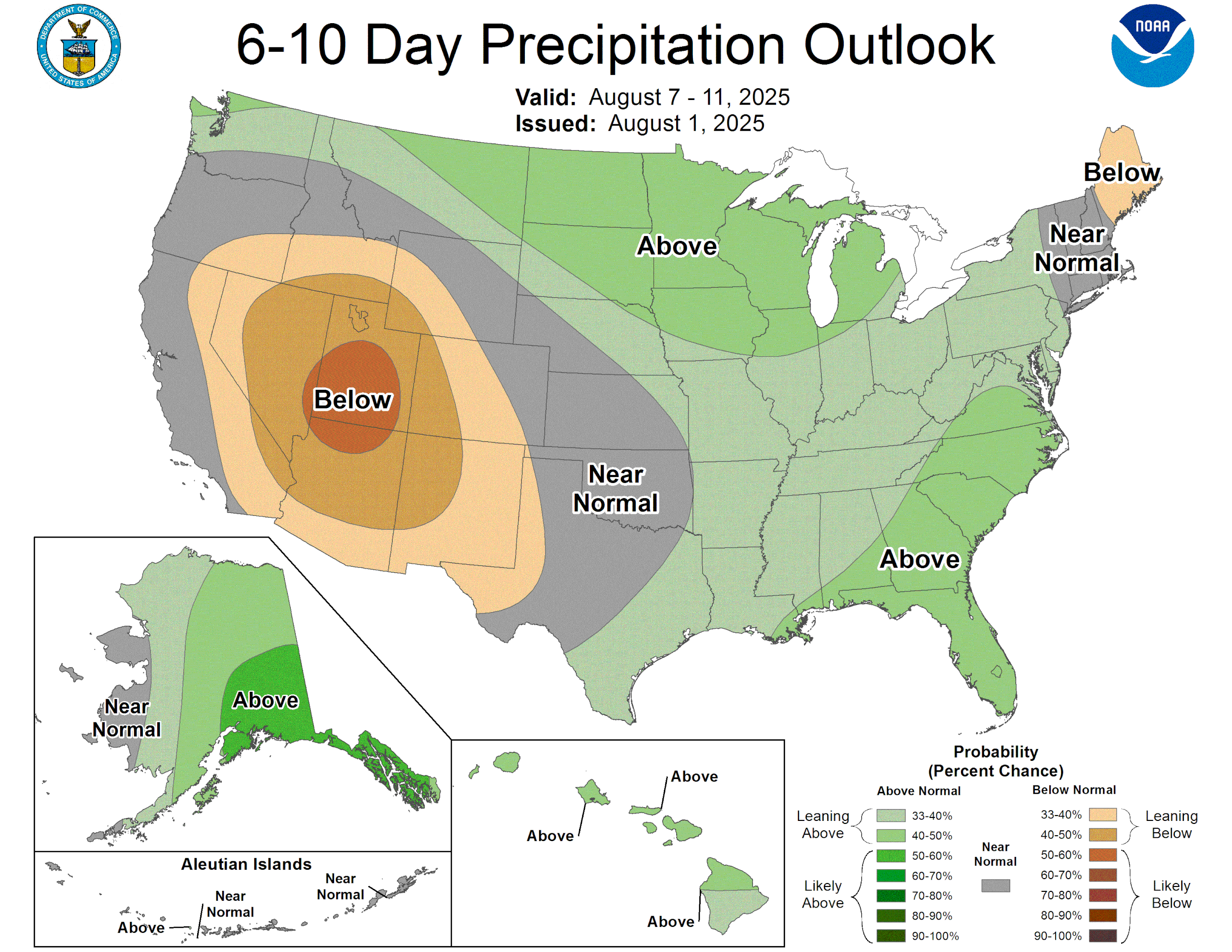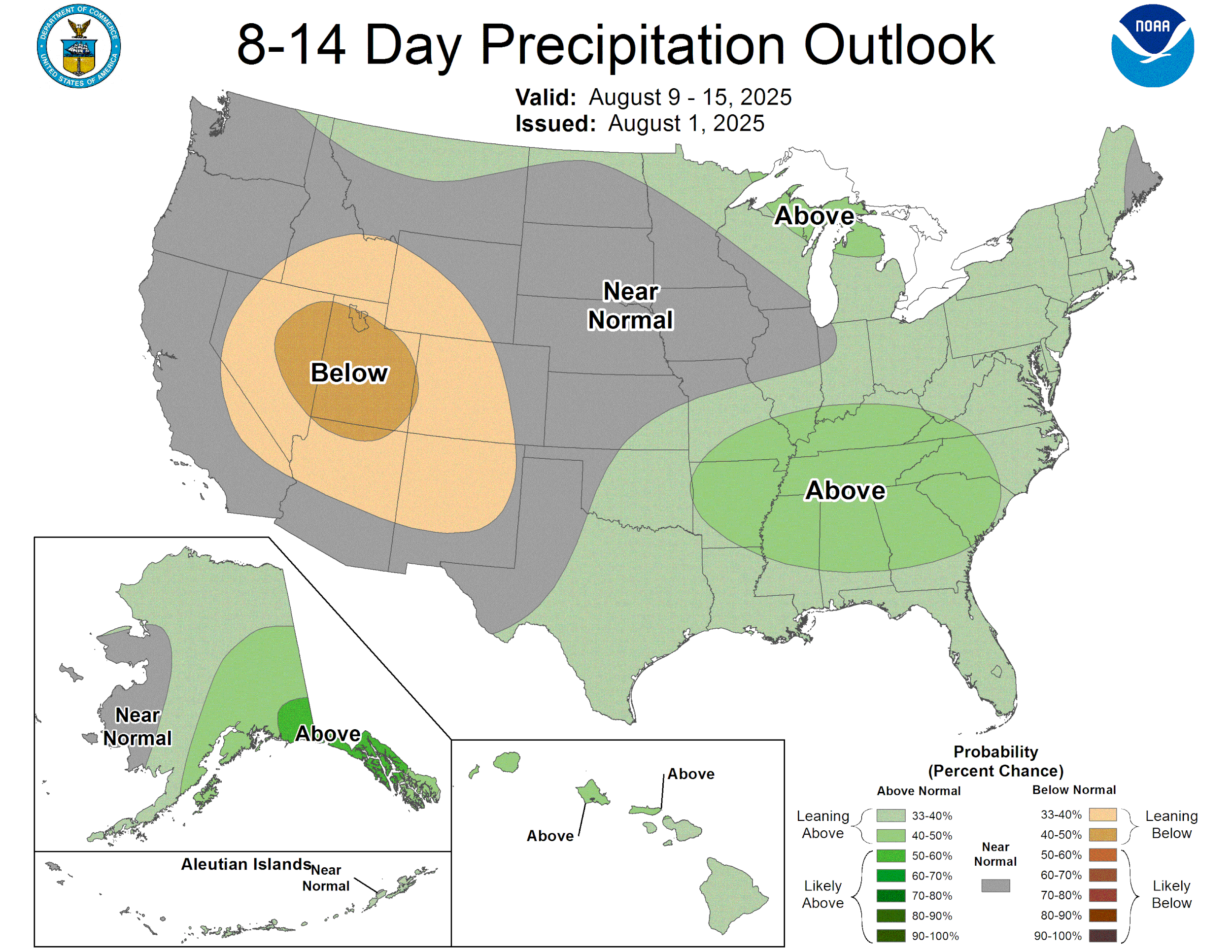 August is generally a medium rainfall month with most locations averaging 1-2 inches of rain except closer to the coast where totals are closer to 3 inches. The two big players for August are the tropics and early season cool fronts. As of post time, I don’t see another front impacting us after this weekend for at least a week and the latest NHC update continues to forecast no tropical activity for the next week as well. On a positive note, the latest CPC outlook gives us better than 50-50 odds for above normal precipitation in the 6-10 and 8-14 day period.
