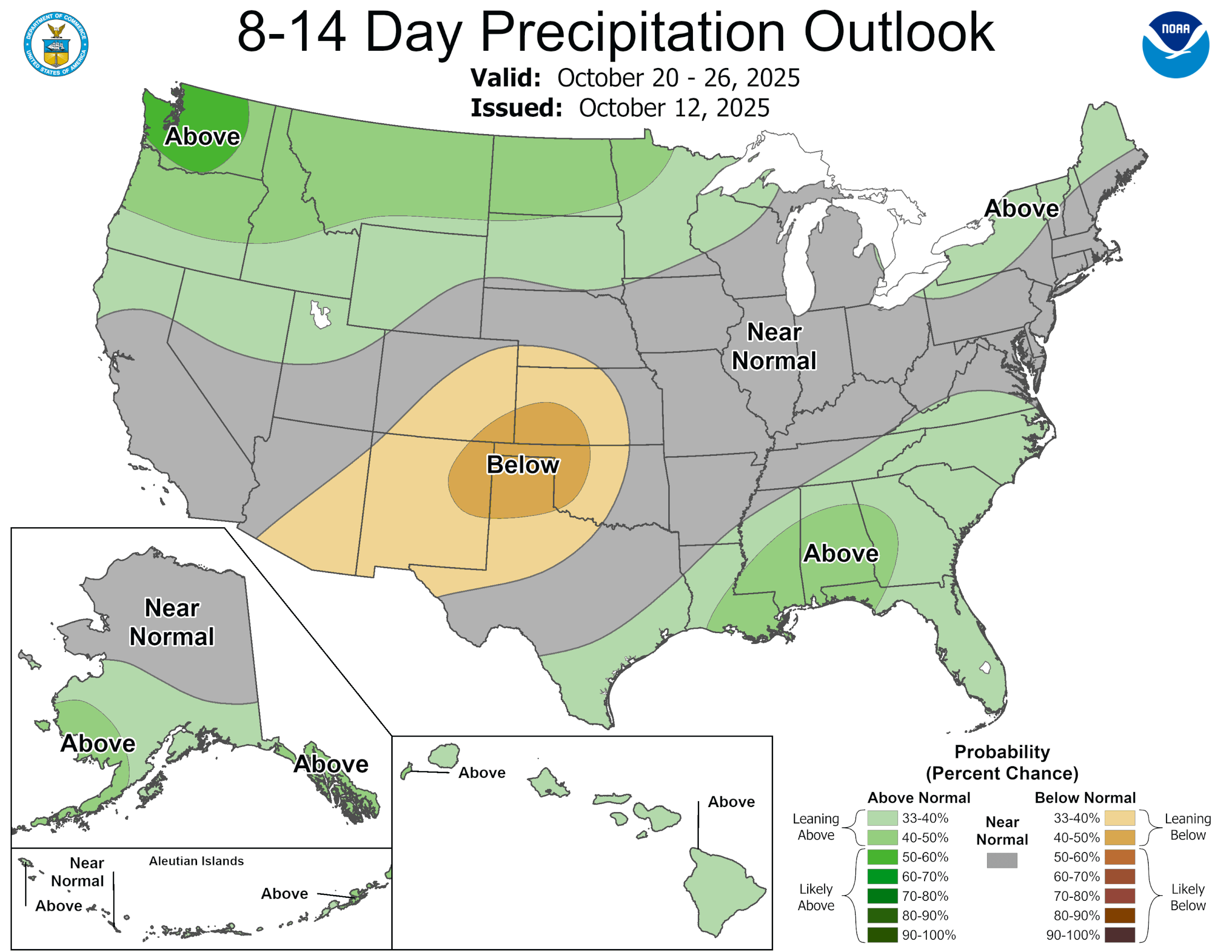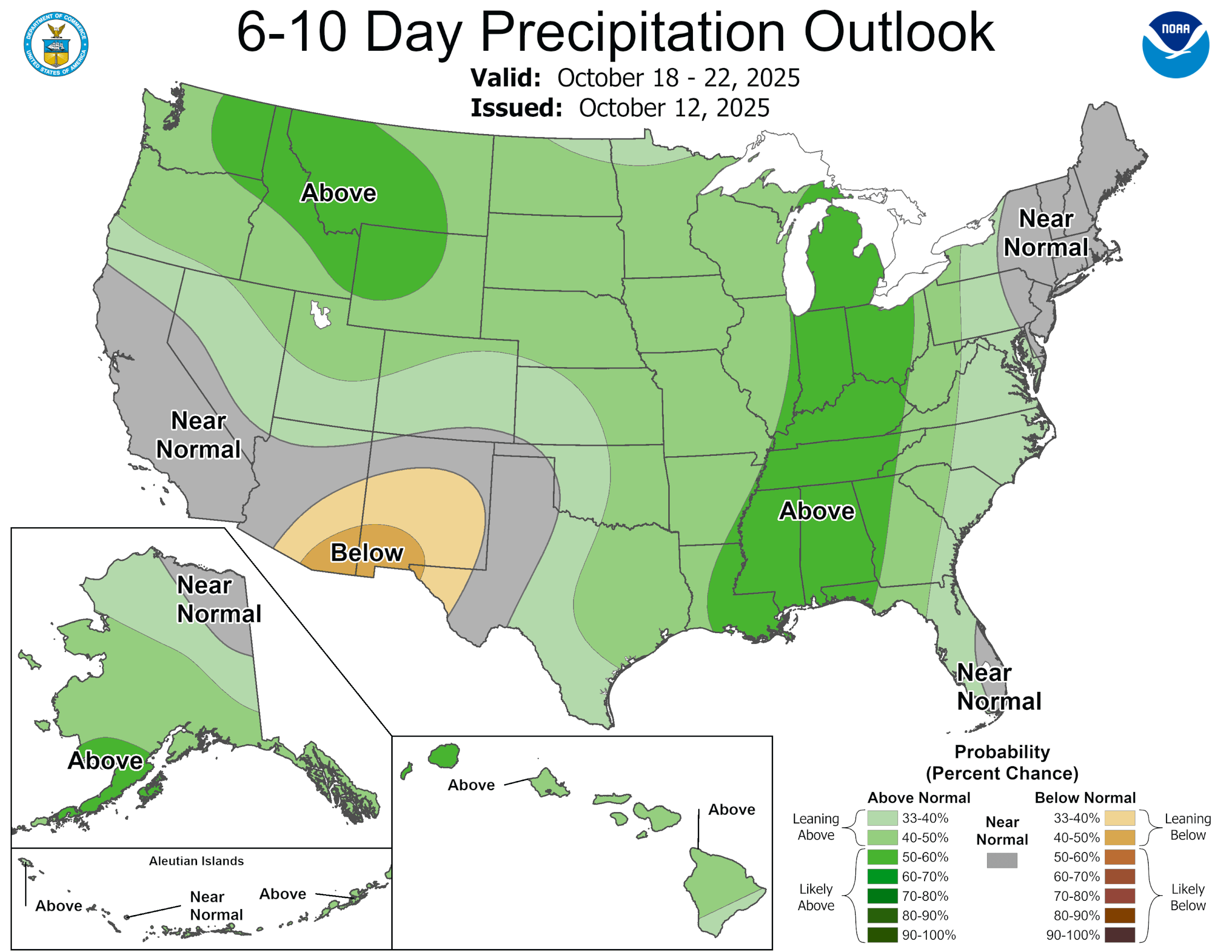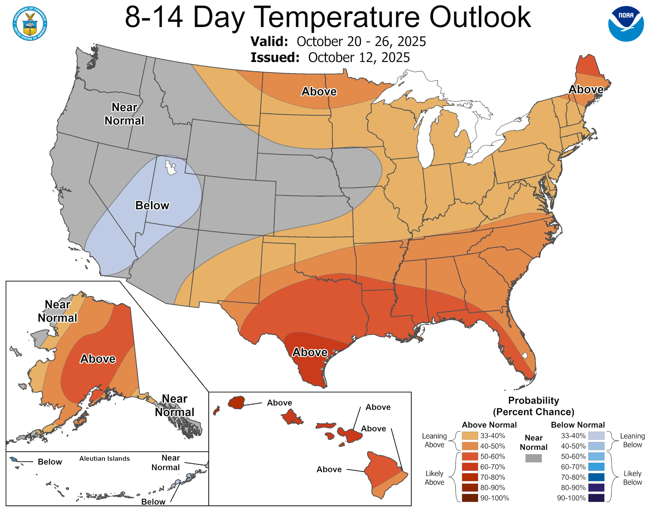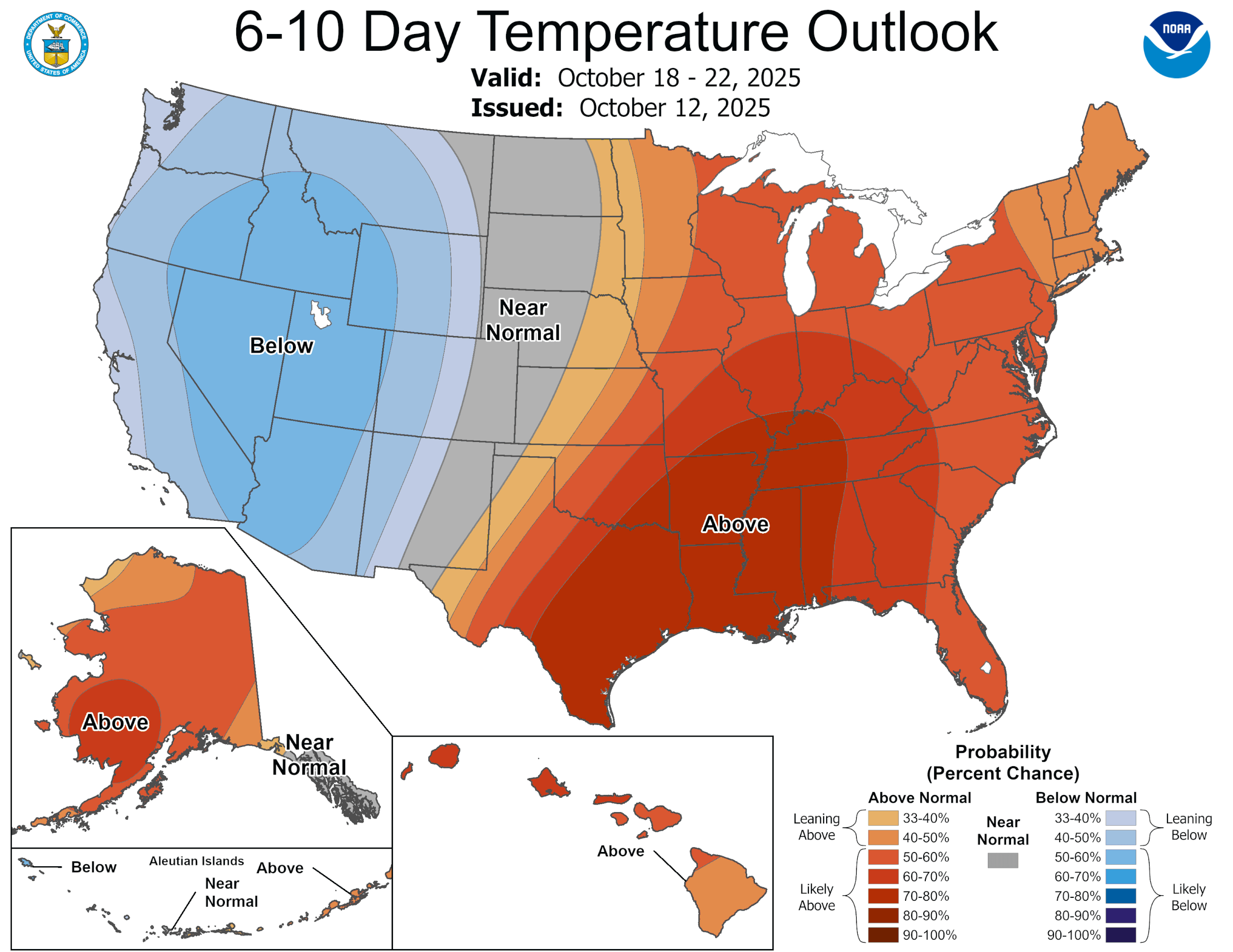 I keep looking for a pattern change and eventually we will see one, but not likely for at least another week. The latest Euro model is forecasting a front with a line of storms, to move through in about a week. Not only would we see some rain, but lows are forecast to drop into the 50’s. Unfortunately, the latest GFS and NBM models do not think a front will come in that soon…they see no chance for rain until around the 24th. I am noticing that for the second day in a row, the CPC 6-10 day outlook has our area in better than 50-50 odds for above average rainfall…we shall see!